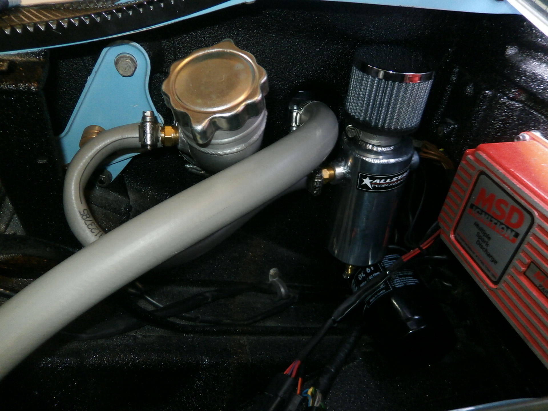 I have the PMS filler pipe and it has the 1" breather pipe lateral on the side facing the rear of the car ,anyone run a K&N or similar breather filter in this location with good results?. If so do you need to mount a rain shield over it ? ![]() I personally hate breather filters, they make a mess of the engine bay from the fine oil mist. I'm going to run a hose to a catch bottle, then either run another hose to the intake, or down/out to the bottom of the car. |