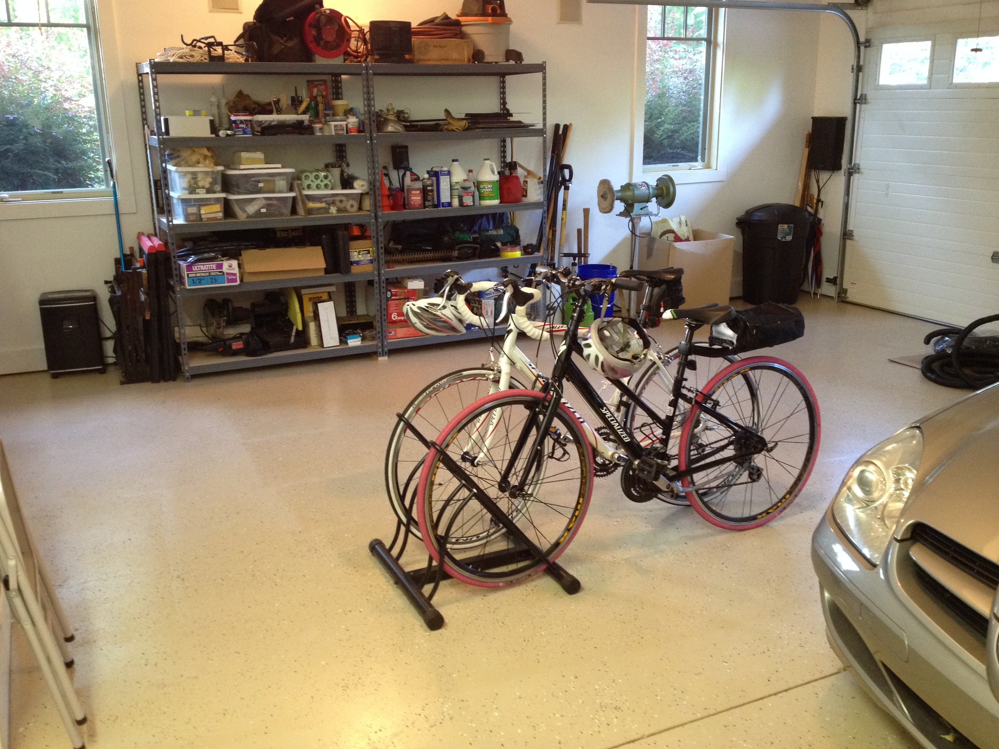 Have used it on two floors now and very pleased. It is bright, durable, easy to clean, and does not lift onto the tires. And it is affordable. Proper prep is a must or you will be left with a mess. Follow the directions to the letter. The prep will take two long days of scrubbing, degreasing, scrubbing, rinsing drying, etc. The application goes quick. The epoxy must be catalyzed properly (the correct time for the temperature). IF not done correctly it will never fully cure and again- a mess. The color batches vary slightly. Rustoleum advises to mix several gallons in a 5 gal bucket then refill original containers prior to adding catalyst. I mixed enough to set aside a spare gallon for future touch ups. |