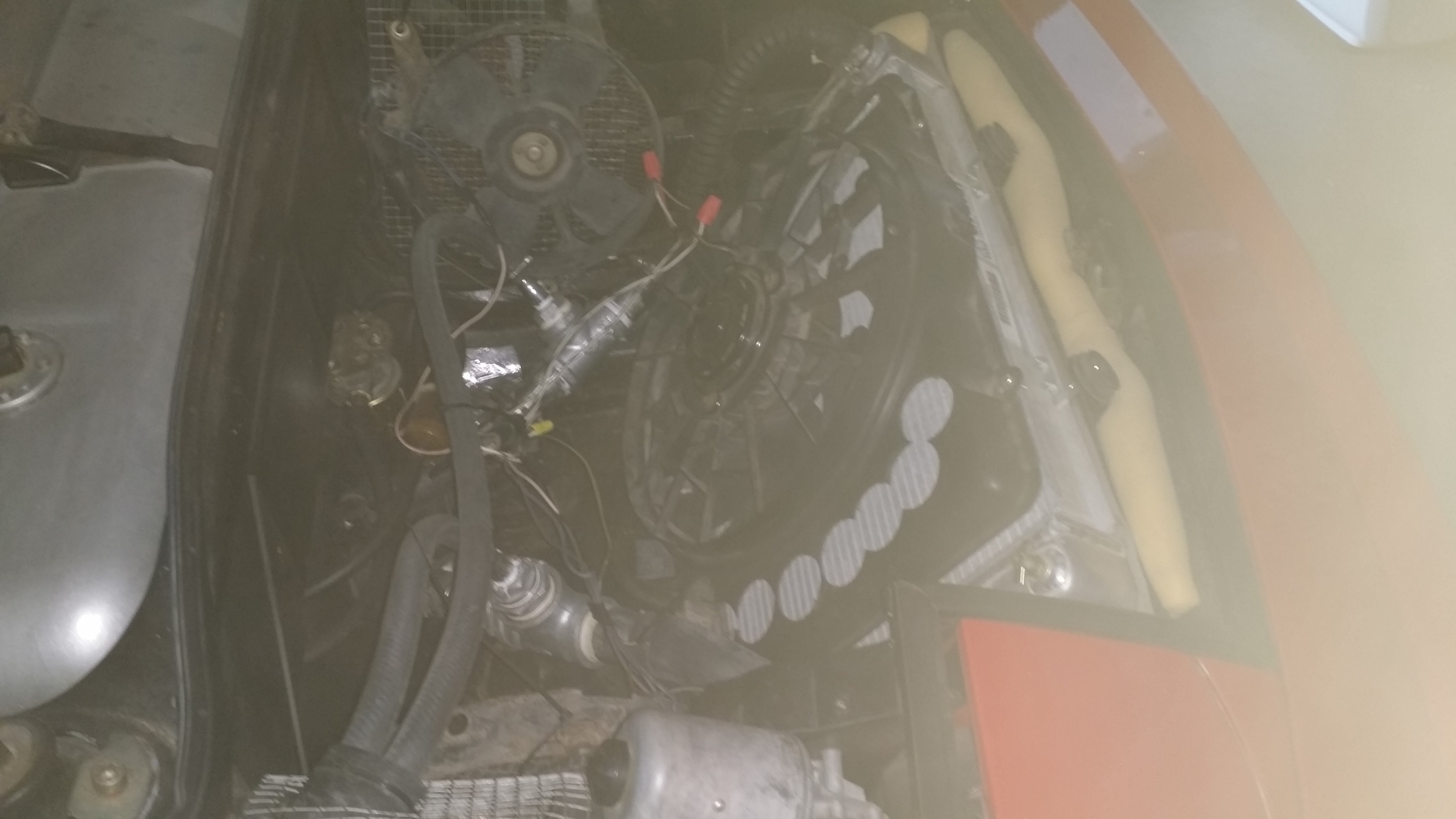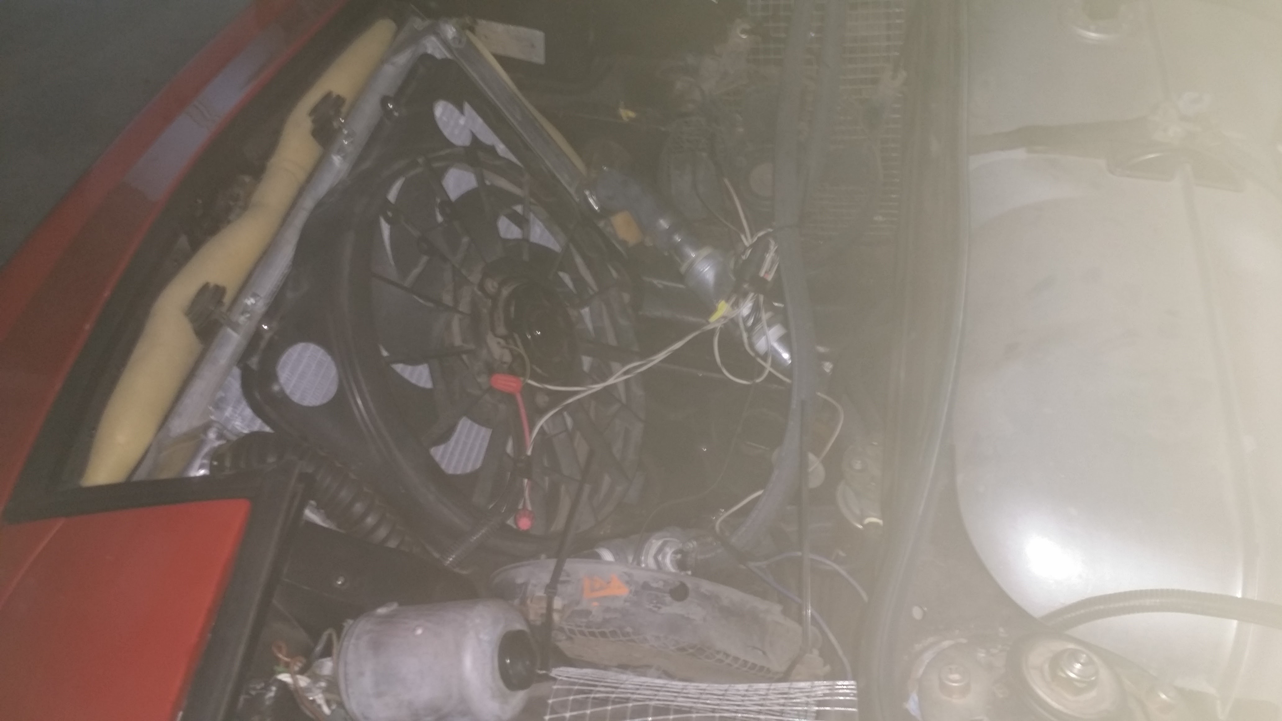 The holes in the shroud are new... as a test top see if it made a difference. I think it did because in the past (with no holey shroud), it did not matter how cold it was outside; the temp would always go to 200 and beyond (have a 160 t-stat with bleed holes drilled and the fan is set to turn on at 180). After cutting the holes in the shroud, the temp would stay at around 180 (acceptable) although it was when it was cooler outside. Now in this 100 degree weather... it does not matter... it still get to 200 and beyond). The extra fans are from a Toyota 4-Runner AC condenser units and were mounted there temporarily to see if they made any difference in assisting the main fan exhaust air from the front area (they were wired to push air out). They did not work. What if I could place the radiator more vertically to allow a larger area in front of it (then shroud it too). Would that help any? Also; my temp sensor is mounted in a port right next to the t-stat/intake manifold. Post pics of the whole system please. Attached thumbnail(s) |
