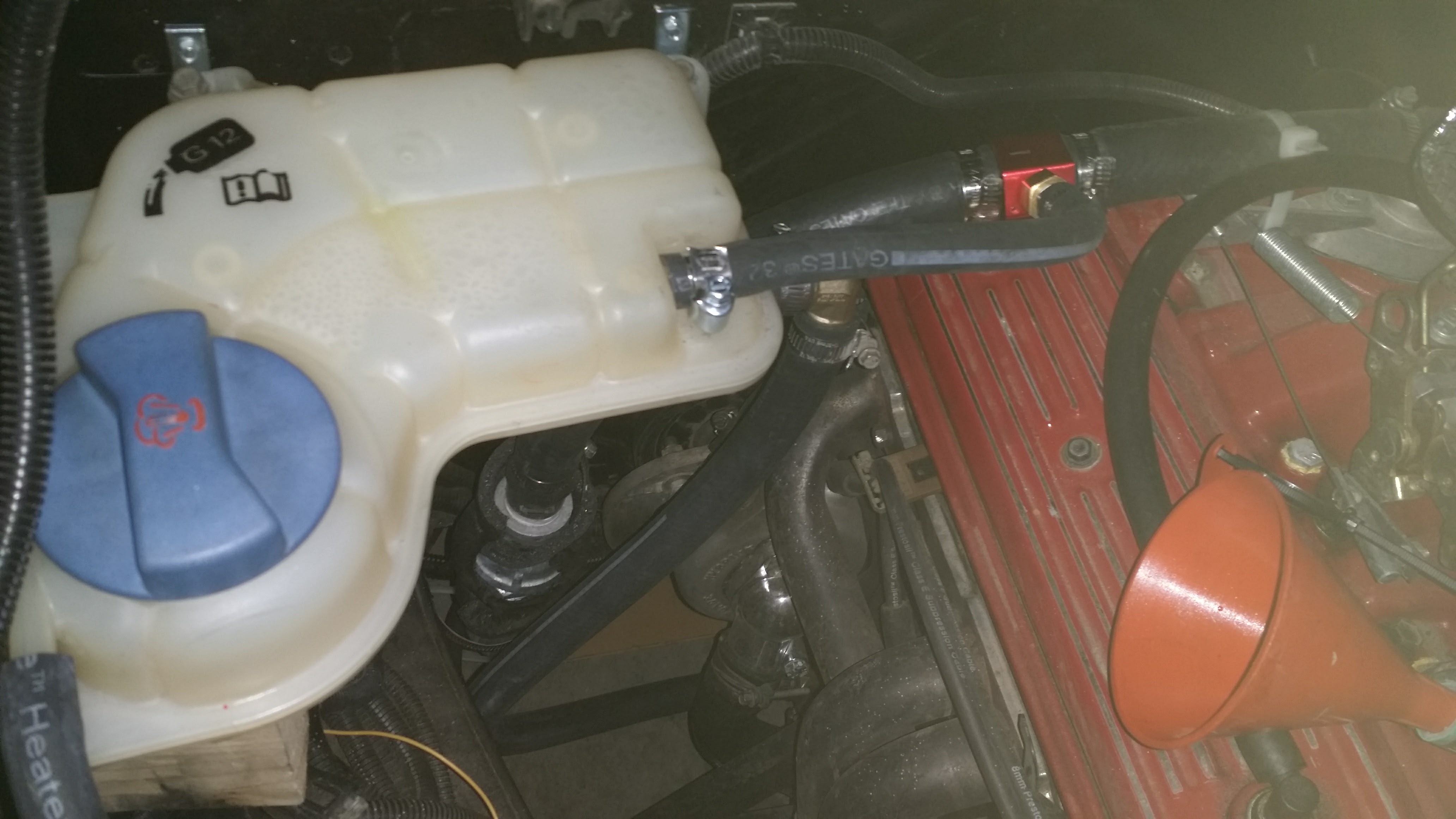 I have the system all together and I thought it was going well. I took it for a drive at around dusk where the ambient temperature was 67 degrees and the car only got up to around 190 degrees. This is a marked improvement considering that in the past; even on a 40 degree day, the engine temp would go past 200. Well; last night, I let it idle in the garage to see what would happen and it overheated. I mean the temp got up to around 230 and the coolant was boiling over in the overflow tank. Also the fan never came on (it is supposed to come on at 180). I did check and the fan does work. I shut it down immediately and let it cool off. As it cooled, it sucked up the coolant out of the overflow tank and back into the expansion tank and engine. Prior to this; I tried to bleed the system. I lifted the rear end which lowered the rad and I did end up getting fluid to come out of the rad bleed petcock (upper corner of rad). I also mended the holes I drilled in the rad shroud. After the boiling coolant episode, I noticed that no coolant was coming out of the rad bleeder. I do have a setup where lines are coming off the main rad hoses and going to a heater core for cabin heat, and the day I took it out; I had good heat in the car too. How much air can be in this system? The temp sensor for the fan is located by the t-stat. Is the reason that the fan did not come on because of an air pocket located by the temp sensor? I guess I really need to understand how the vacuum/manometer etc… system works and how to set one up for my system. Any other suggestions? Yes just fill the system up and run it through a couple of heat cycles. Make sure it's all sealed up so that the system is pressurized. Put the blue cap on and make sure all the hoses are attached just like it would be if the car was 100% ready to drive. Although it may seem logical to leave a line open, it keeps the system from forcing the air out. Rev it a few times the first time to make sure your thermostat opens and feel the line going to the radiator to make sure they are hot. Watch the temp needle (at least the first time) for spikes in case you have a big air pocket. Get the engine up to temp and then shut it off. Then..(the hard part)....leave it alone and let it cool off completely. When you check the coolant the level should be down a quart or so. Maybe more. A couple more like that and you should be good. In fact once you know that you don't have any serious bubbles you can drive it around a block or two. Then very quickly you won't have to add any. BTW I never got anything out of my radiator bleeder either. Probably would now but the system is bled. |