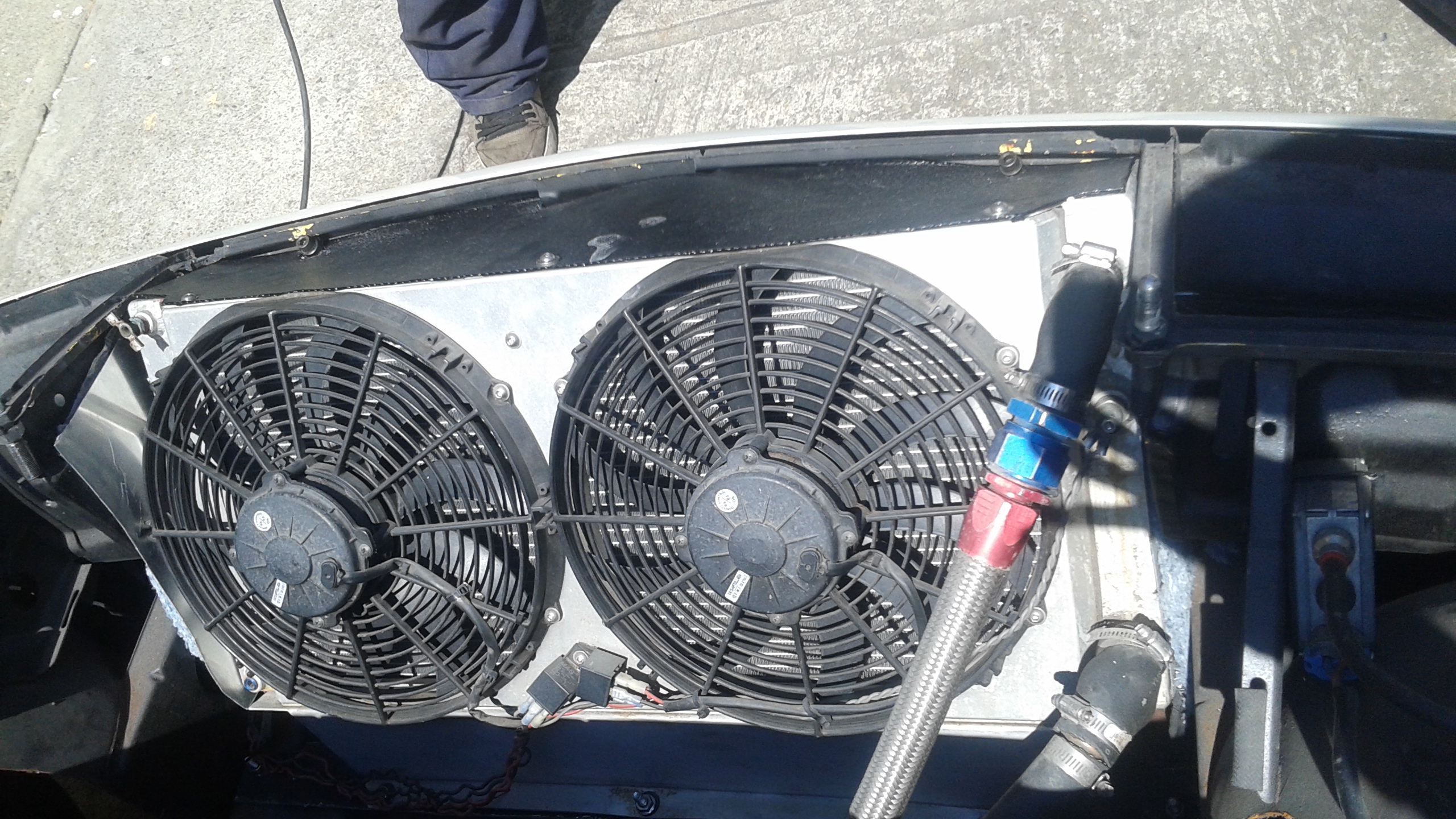 Here is a picture of the completed setup. Still trying to get the air out of the system. Loosened the petcock on the top side of the rad and nothing... no air and no fluid. Pictures do not show the addition of a overflow tank placed in the trunk.