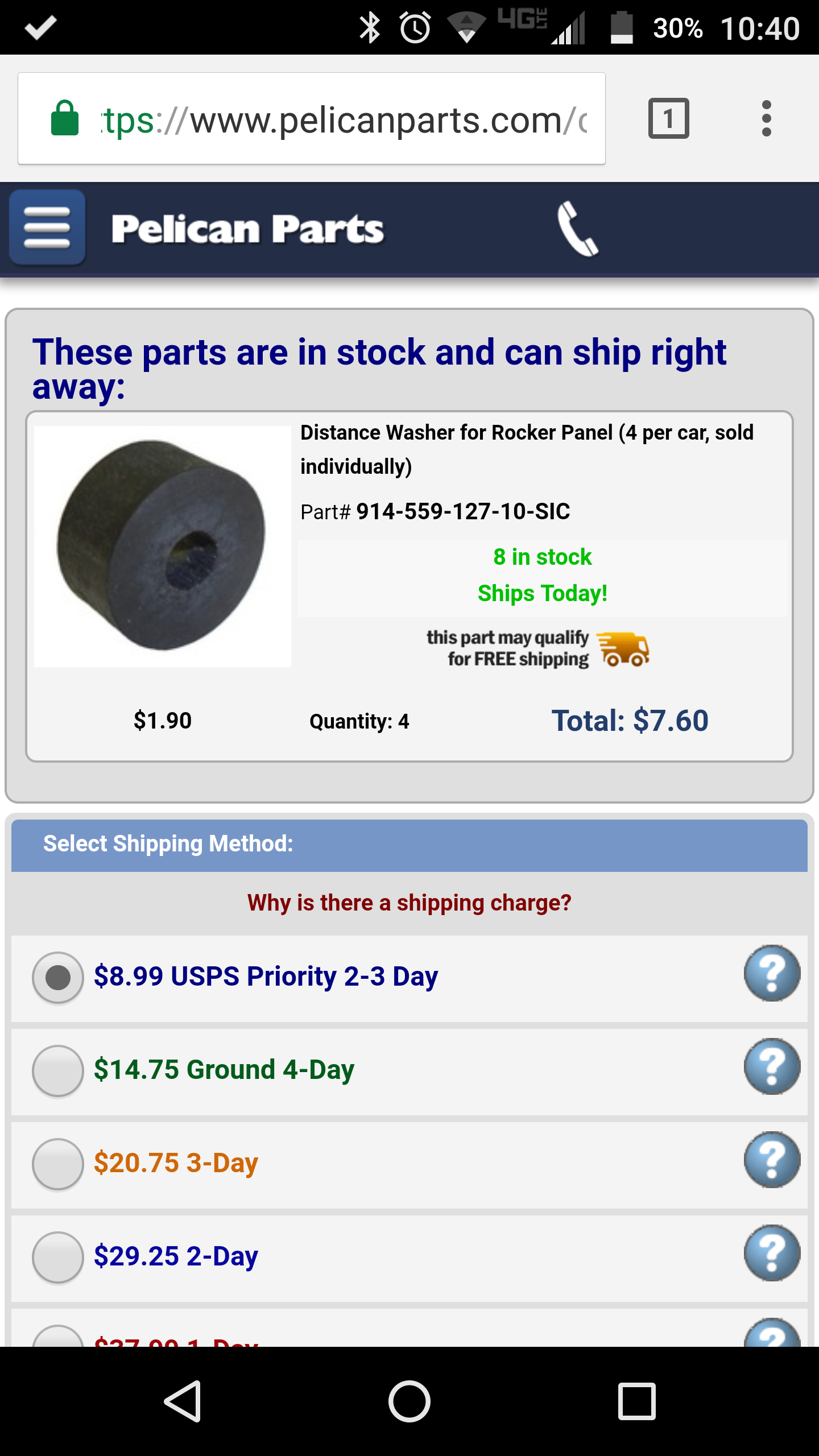 They are only $7.60 at Pelican but $8.99 shipping!! Anyone a nice set of 4 they would sell and ship in a small padded envelope for much cheaper then $8.99?? (IMG:style_emoticons/default/smile.gif) Must be a handling charg for ground -$14.95 for 4 small pieces of rubber? Even usps priority is a couple dollars on top of the real charge. Wayne has to pay for the collection of 962 Porsches some how, right? |