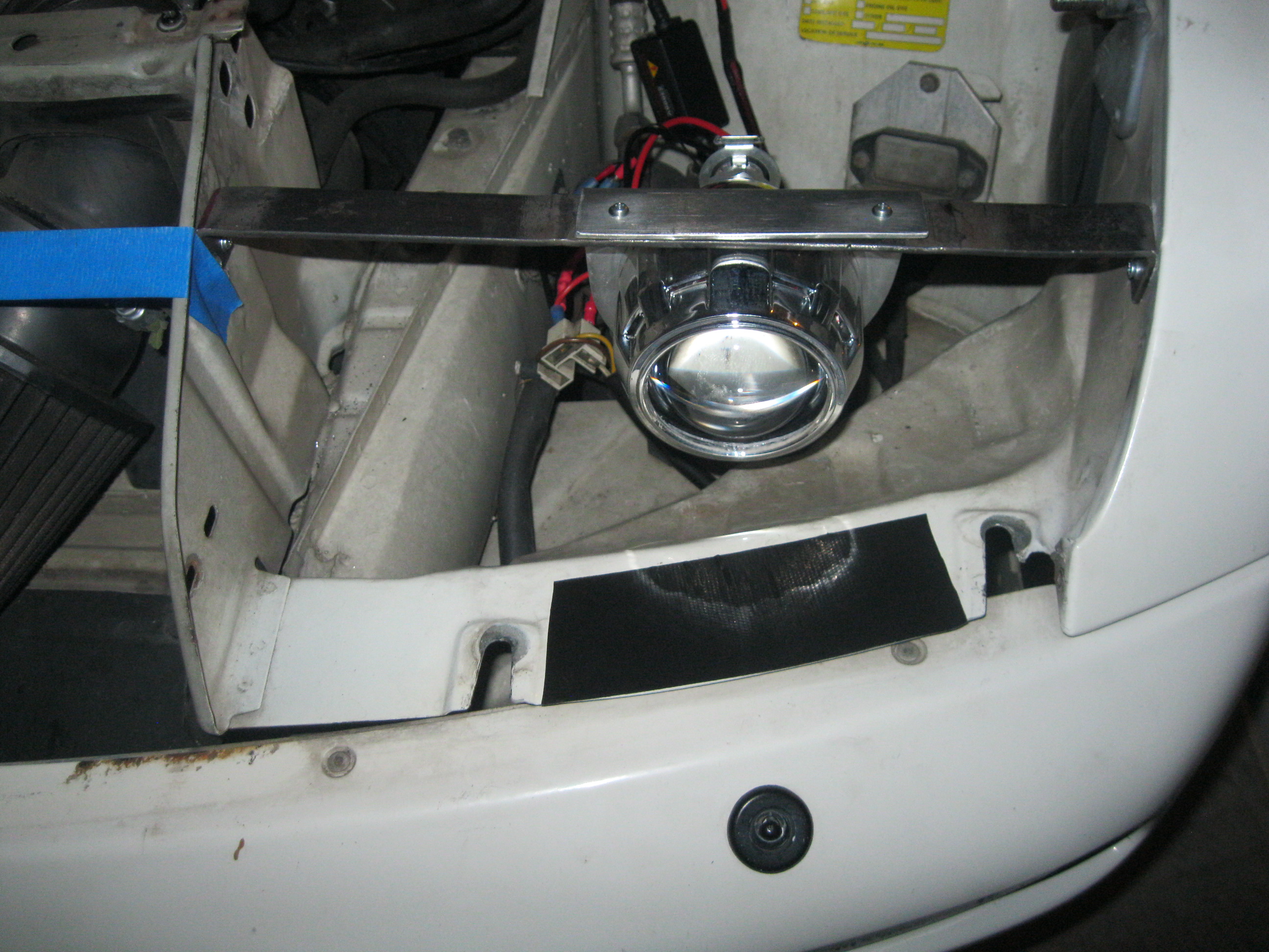 Here is s shot with a better view of what I am doing. I have thought of making this a kit for the 944. I could build up something similar for the 914. The light looks pretty compact - where did you find them? They were put together from two kits I picked up on ebay. http://www.ebay.com/itm/H1-H3-H4-H7-H11-Xe...=item3f3699e08d and http://www.ebay.com/itm/271497426147?item=...123&vxp=mtr I mounted the lights on aluminum brackets I made and mounted the brackets to steel supports I built. The most challenging part was figuring out the wiring. The Projector headlights switch from low to high beam through the use of a little metal plate that blocks part of the light beam to create the low beam pattern. Voltage is passed to a switch that causes the plate to move out of the way for the high beam pattern. That circuit is completely independent of the circuit for the light beam itself. The entire operation and circuit structure is completely different than the operation and circuit structure of the factory lights. On the 944, the high and low beam circuits are completely separate. When the high beam circuit turns on, the low beam circuit turns off. |