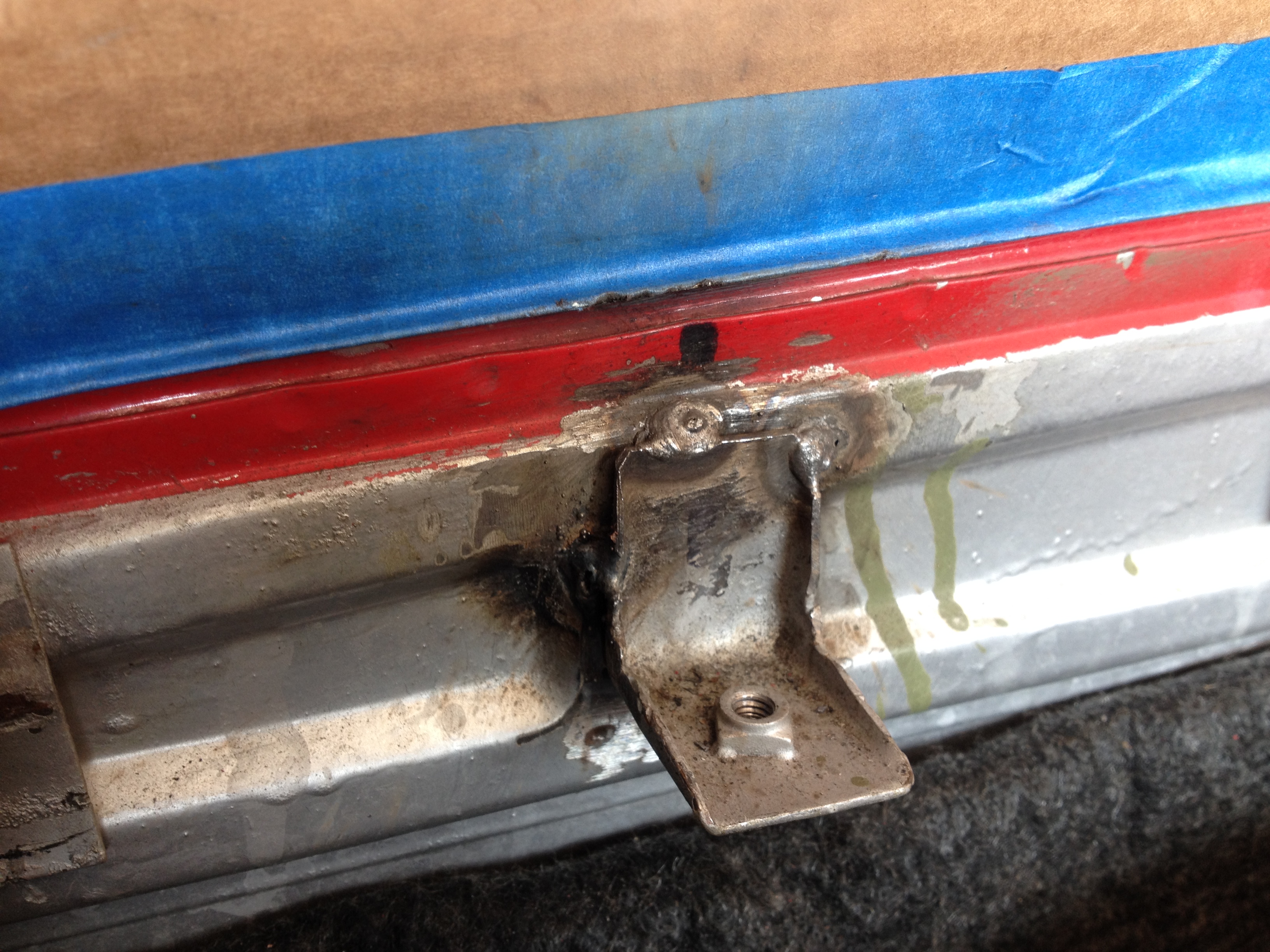 The tack method, though, would be a quick fix for a driver and would be easily reversible if/when you decide on a more permanent repair. You'll need to remove the rear window for anything more significant than a tack weld as the heat could crack it and/or cause the butyl to melt/catch fire (although it kind of looks like your window might be urethaned in?). RD has the hinge bracket available cheap and you could do a thorough repair when the time is right. http://www.restoration-design.com/store/product/PP343 The spot welds on my driver side hinge gave way and I can speak to the effectiveness of two little tacks in working long-term. |
