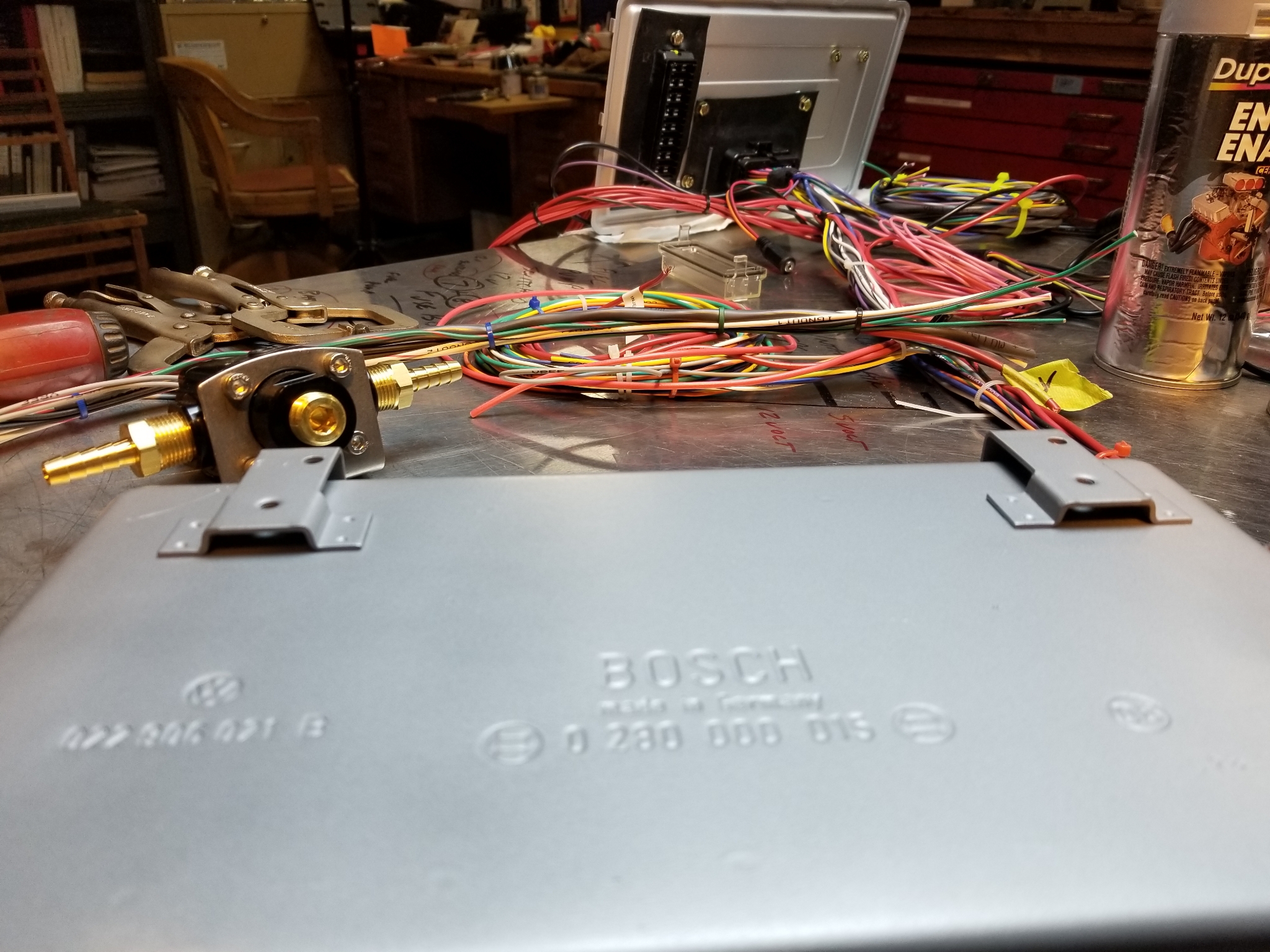 After a 30+ day break I'm back to Matt's MicroSquirt install. We're making an attempt to kind of hide the 21st century components to some degree. At least the mondo wiring harness. So must of the wiring connections will be hidden in the old D-Jet ECU box.