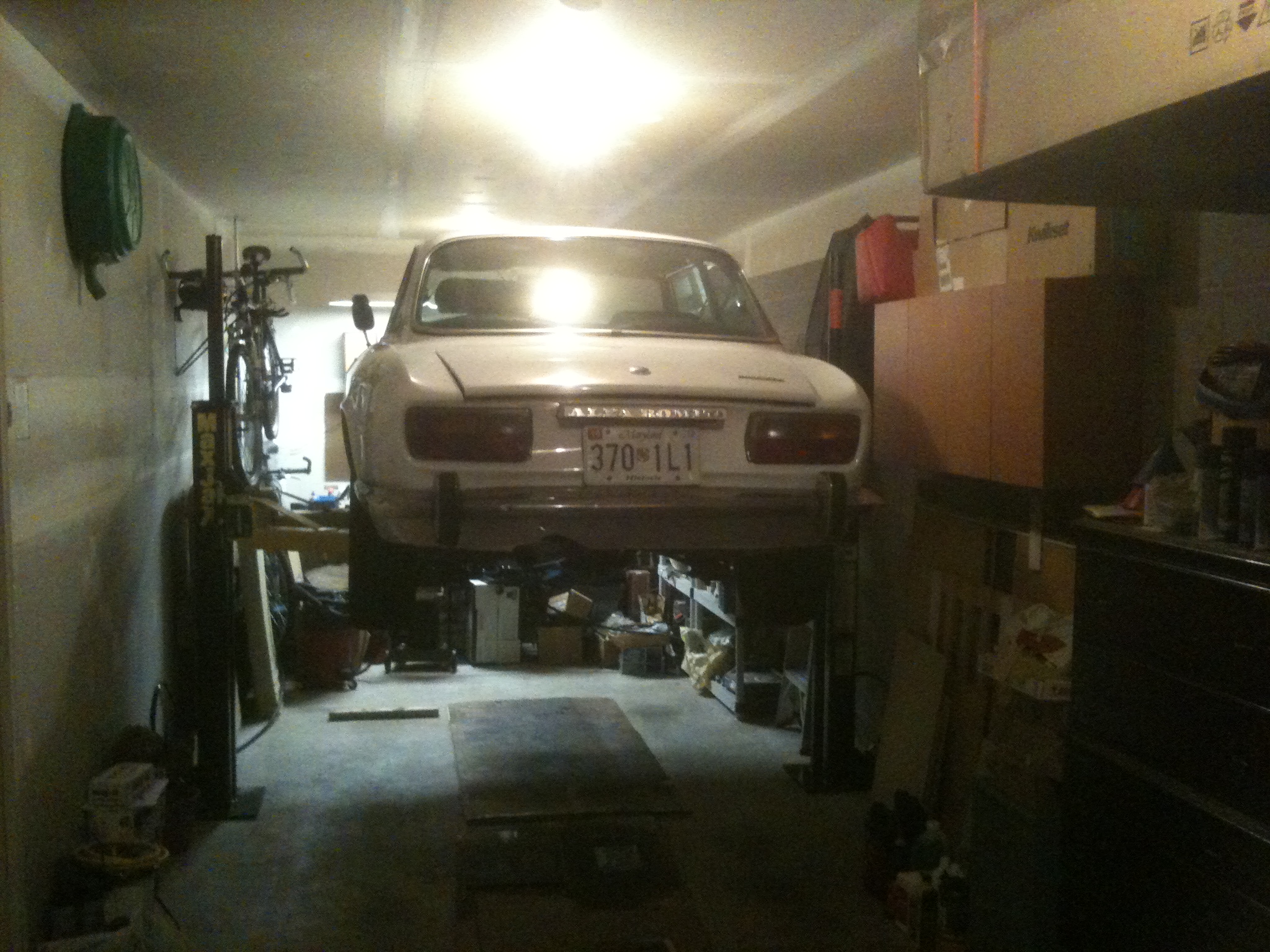 I agree Max Jack is fantastic at that ceiling height. I have to dolly around underneath, but the entire undercarriage is basically open and available to you. I have a 911 2.7 in my car and take it out and put it in for regular maintenance and there is no problem with car balance on the lift. I would say the height of the car underneath is approx. 4'6" with the 914. Not enough to stand under, but with a rolling chair, you can do almost anything. (IMG:style_emoticons/default/agree.gif) Get one of these and you are set. ![]() |