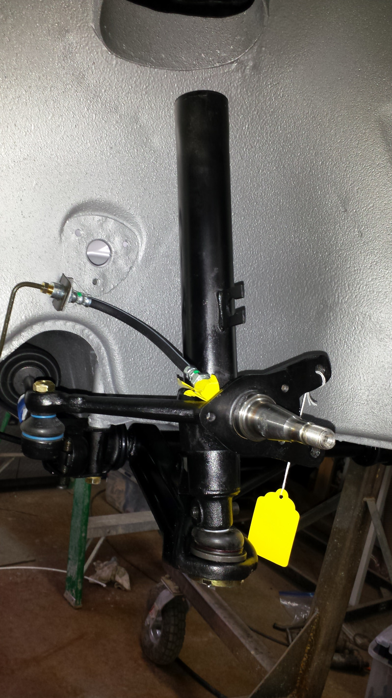 Okay, now for the main event. Saturday I installed a new set of rubber bushings from 914Rubber in the front control arms. I like the look of clean control arms with just a little bushing showing. You don't get any pics of the install. That job is a bitch and I was plenty busy trying not to screw it up. Thanks to @cuddy_k for his great video! I shared a couple tips I learned on his video thread. I'll share one more tip here. Don't be an idiot like me and make sure to test install your torsion bar BEFORE tapping these end covers back in place. I thought I had cleaned out the splines pretty well but NO. I wound up having to knock both end caps out, cleaning the splines with a dental pick and wire brush until the torsion rod could slide all the way through, then reinstalling and repainting the caps. It is surprising what a small amount of rust or debris will keep those rods from sliding in. The control arms got new ball joints and the strut housings installed. This is all just finger tight so I can install the inserts later. I noticed that an oil stain formed on the floor anyplace I laid one of my original Boge inserts so I have a new set of Bilsteins on order and am waiting for them to arrive. The yellow tag has all the torque values for final install. This shot was taken just before I discovered I had switched the front and rear brake soft lines. If this one looks short, that's because it is. And here's just a bunch of eye candy of where I am with the front suspension. |
