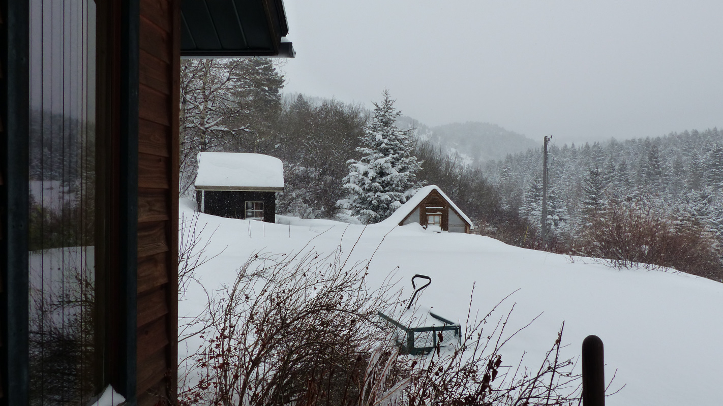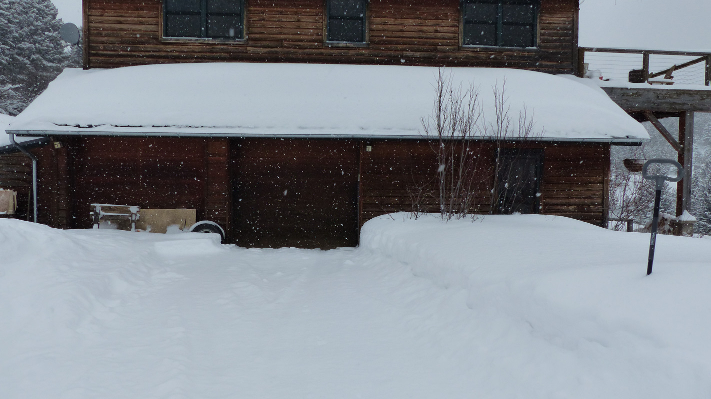 Spotless! (IMG:style_emoticons/default/poke.gif) What are gonna do Brett ,trailer that thing down to the paved road every time you want to drive it? (IMG:style_emoticons/default/happy11.gif) If your getting the snow like we are it's gonna be August before you can get it out of the garage... (IMG:style_emoticons/default/dry.gif) It's sure is gonna be beautiful though. (IMG:style_emoticons/default/first.gif) Yes! I love it! Having to plow twice a day to keep up. Driveway is getting kind of skinny because I'm running out of room to put the snow. The only down side is that I have a stack of five Fuchs buried under it that needs to be dug out before my car touches the ground - and that is on the north side of the house where it is drifted to over five feet deep. But really, how can anyone not love this stuff (IMG:style_emoticons/default/confused24.gif) A few shots of the current view. Greenhouse eve is about 4ft above the ground. The lump behind the Pathfinder is a pickup truck. The dog wants to know why we aren't skiing. The eve is 9ft. high. |