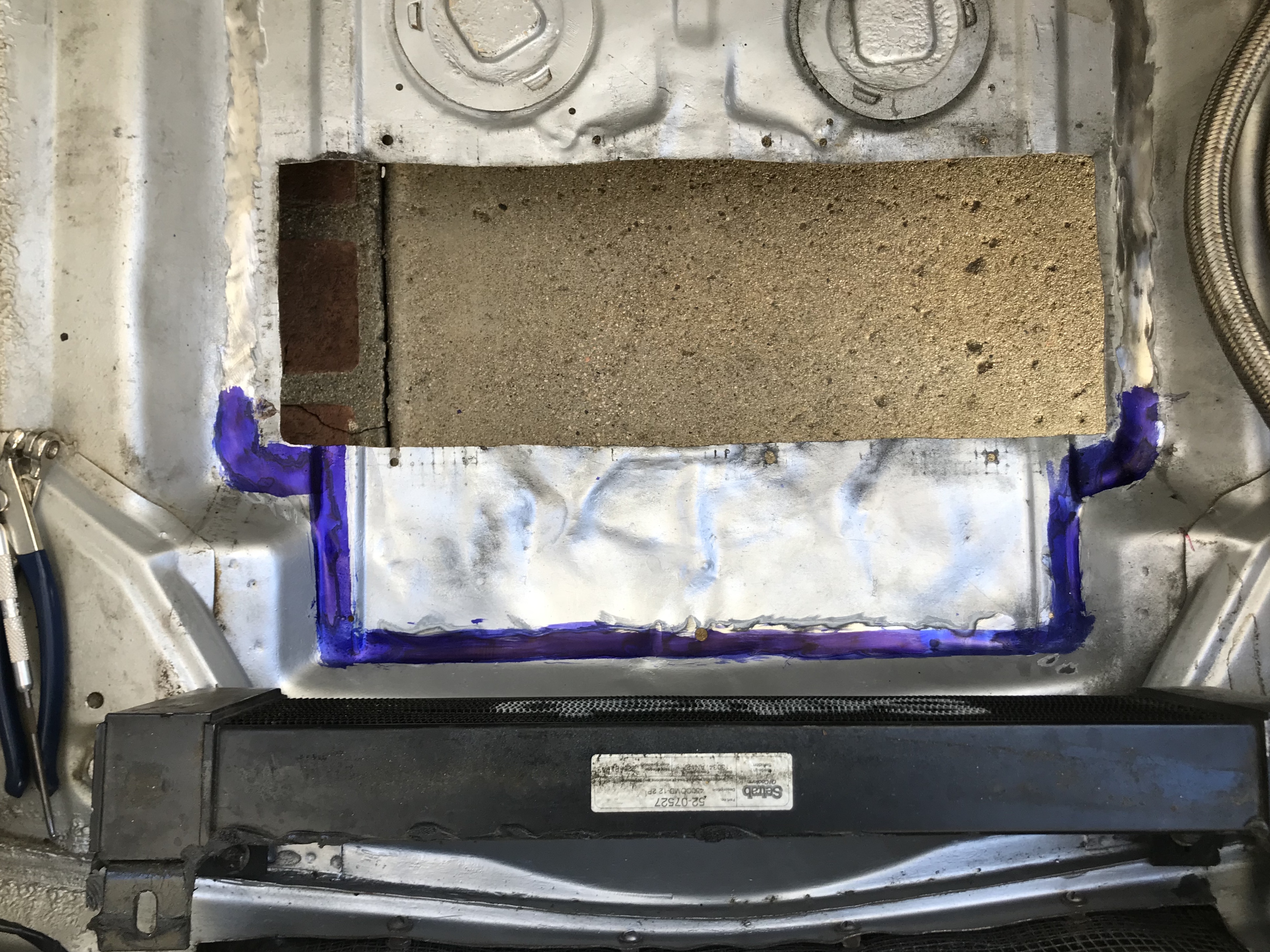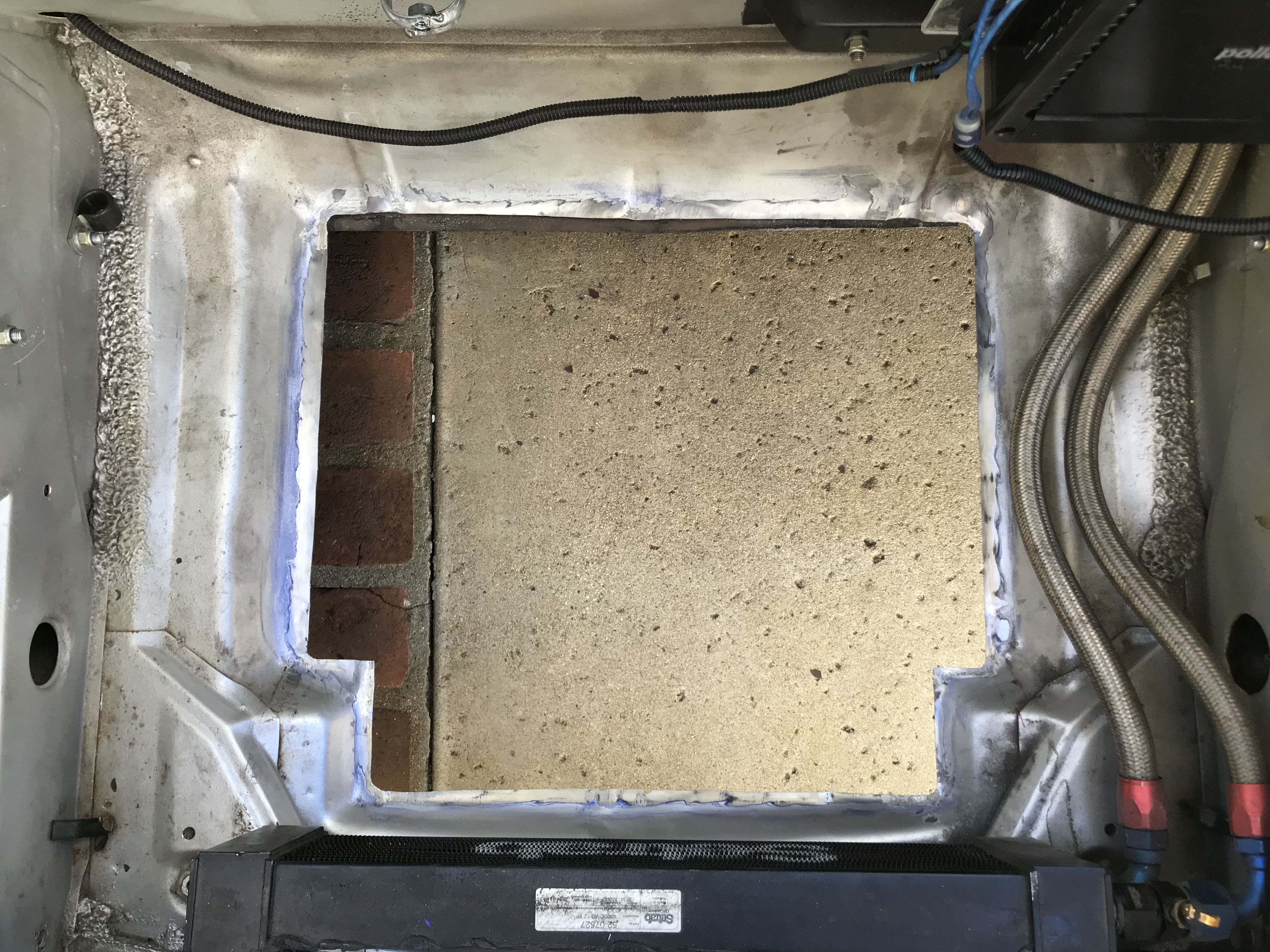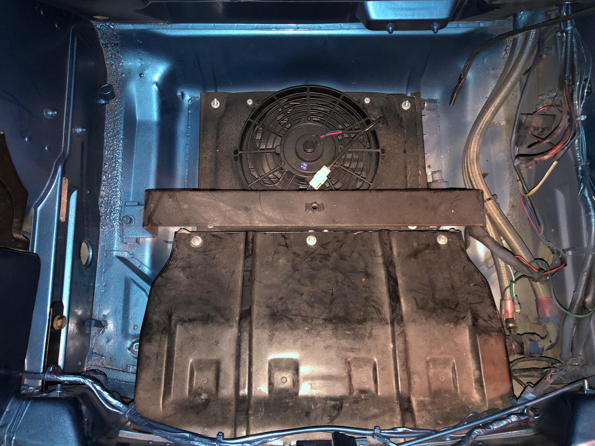 Steve, Do you have a front mounted oil cooler under that duct? I was wondering where the cooling air for the AC condenser comes from. Is there additional ducting that is not obvious in the photo? Yes there is a PMS oil cooler under the shroud. I shortened the shroud so the air exits underneath in front of the condenser. For the condenser, the air enters through the front holes on each side of the shroud. I use the tire board on top of the shroud to force the air through the condenser. The oil cooler has fans and a thermostat. The condenser also has its own fan. I have not plumbed the AC yet, so we will see how well it works... I have a Benling DC Compressor and small evaporator for the console. |