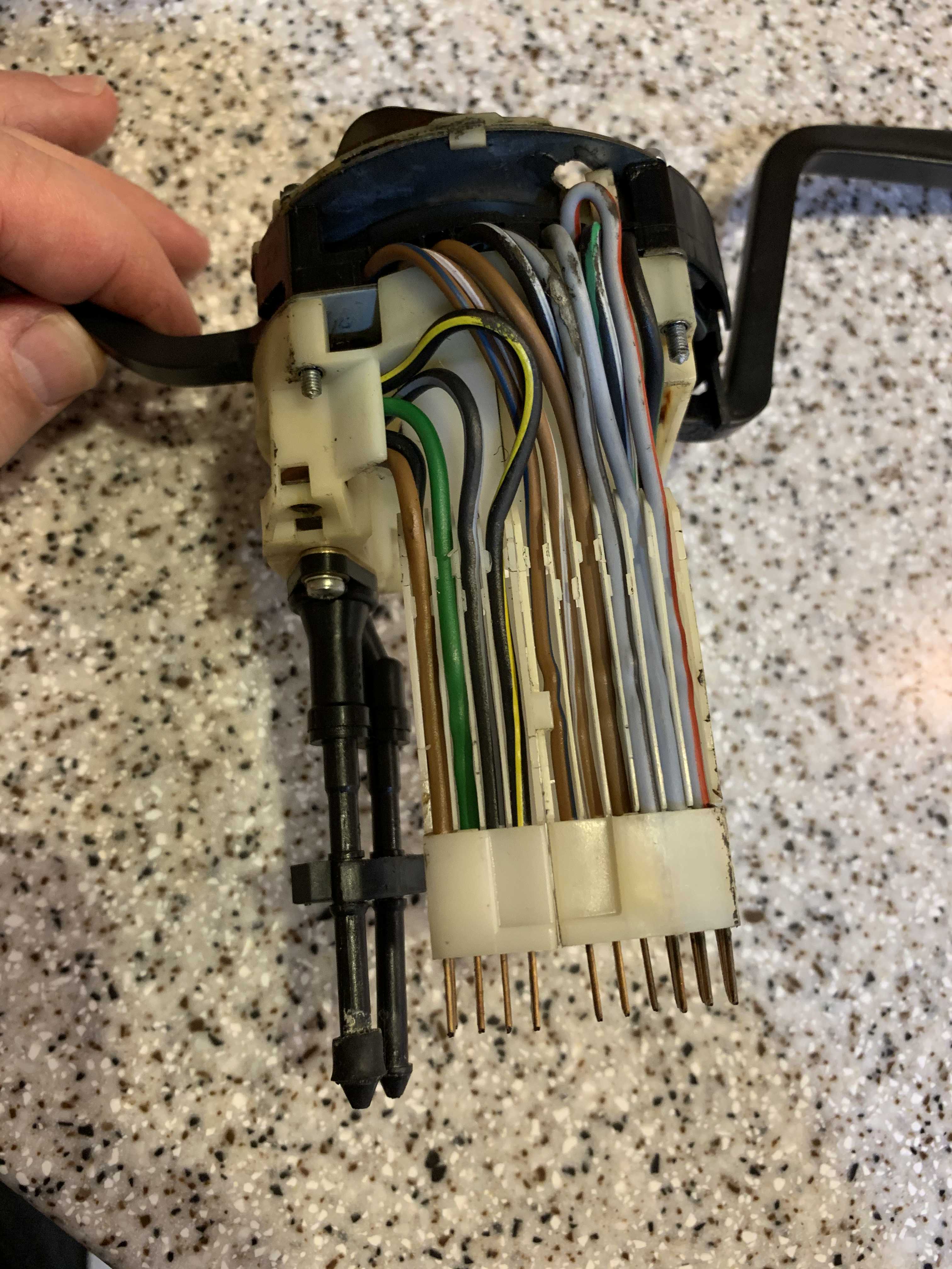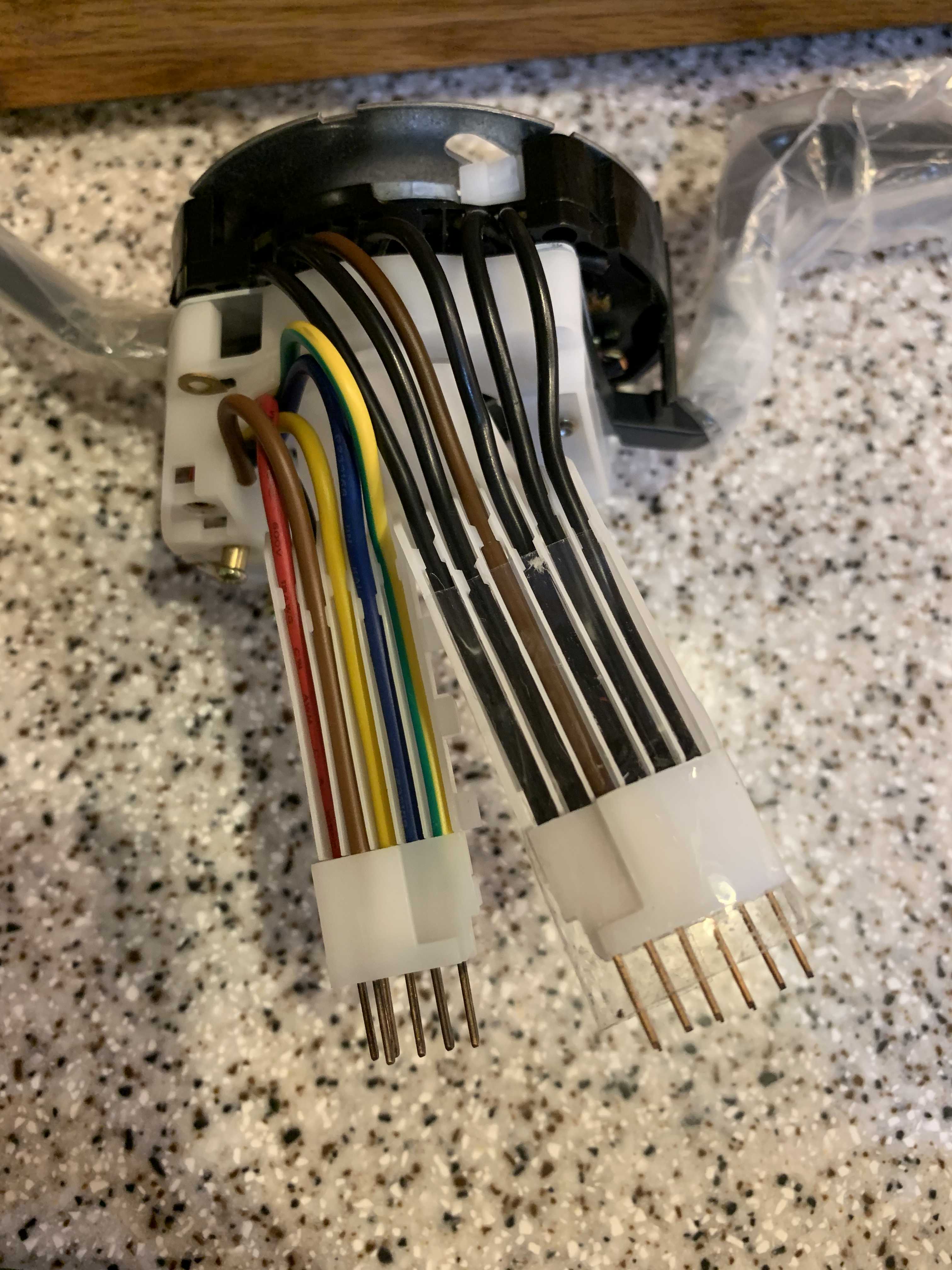 I'll just throw this out this way: Here's my original switches: Here's my replacement switches: 74 with the intermittent relay and I've just added an electric washer pump that I'd like to hook up here as well - although I have an alternative method that will work if it's not going to be plug and play with the new switches. Here's what I think I have to do - at least on the wiper/washer side: Use the white plastic wire guide from the old switch on the new one and just get the red wire wire fished through on it's own. I believe (I haven't checked my notes) that this is the hot(+) wire for the washer pump. As to the turn signal switch, I'm not quite sure what to do as the original has 9 wires (with 6 on the "bottom" and 3 on the "top") and the new switch only has the 6 on the bottom with the 3 on top being empty. Do I have a chance in hell of having this be correct or do I have the wrong turn signal switch? Big thanks for the input - I know there's lots of info out there but every situation seems to be a bit different. |