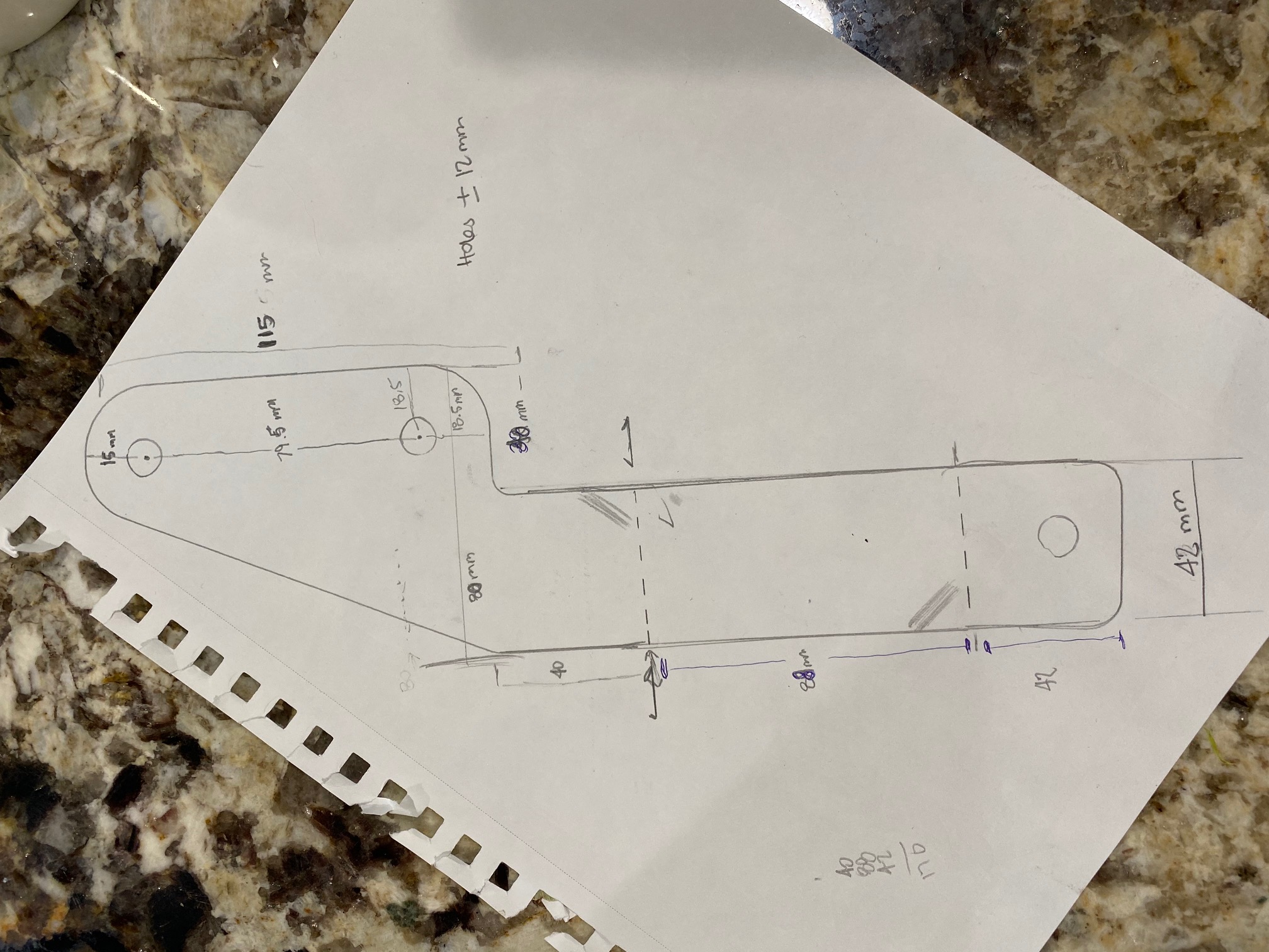 Finally had some time to start copying out the brackets, sketch has measurements in mm (sorry for the crappy penmanship) and I've cad'ed out of version of them with and with out a little brace piece. Rennenmetal had added a little weld in gusset, I was going to try sheet bending in a tab and welding it after the next bend.