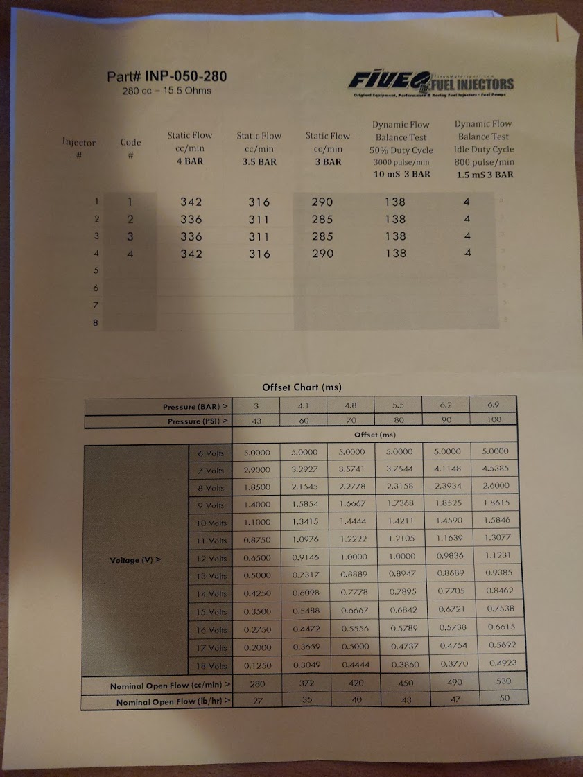 https://www.fiveomotorsport.com/hose-type-e...-sport-compact/ Interestingly enough, they publish the pressure ranges for this injector on their site (along with the latency info which is a huge bonus for MS) Notice they list a MINIMUM pressure of 36psi. Im NOT saying these specs are going to be the same as the A280H (i have no idea), but seeing this would give me doubts about running them at 28-30PSI, at least not without getting confirmation from the manufacture. Voltage: 8-15 Volts, Nominal 13.5 Volts Amperage: 4.5 Amps Latency (dead time): 0.700 ms at 14 volts - Complete latency table sent with each set of injectors. Excellent atomization for medium compression, single- and multi-valve engines. Injector Dimensions: Overall length: 3 in./77 mm O-ring to o-ring: 2.6 in./66 mm Body Diameter: .95 in./24 mm Will not require more than 1% trim Pressure: Min. 36 PSI (2.5 bar), Max. 101 PSI (7 bar) |