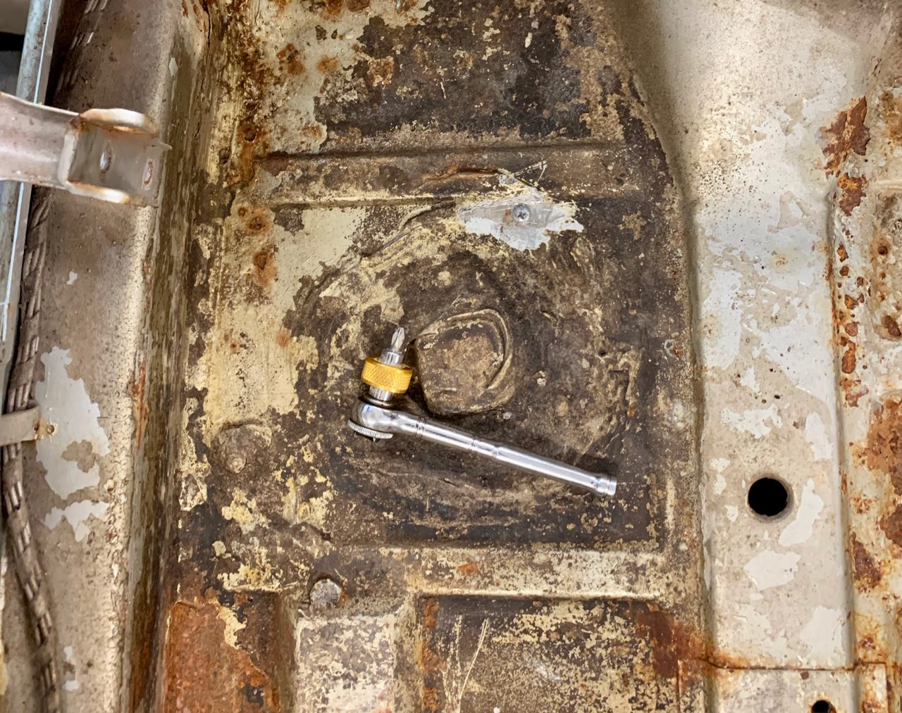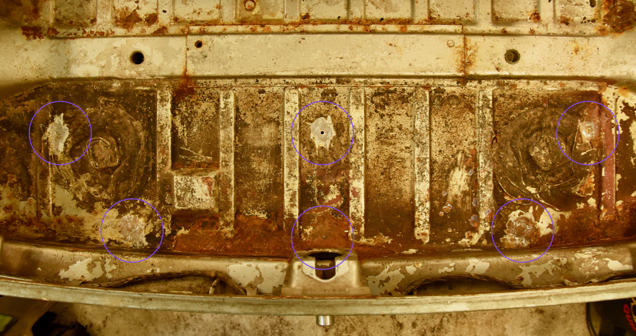 There are six of them, located here: Here's a shot of the top side of the heat shield: And a detail of the mounting hardware: The shield is solid, but with surface rust, so it's going to the dippers prior to paint. I don't think I'll hide the fasteners under sealer when it goes back together, though. Guy |