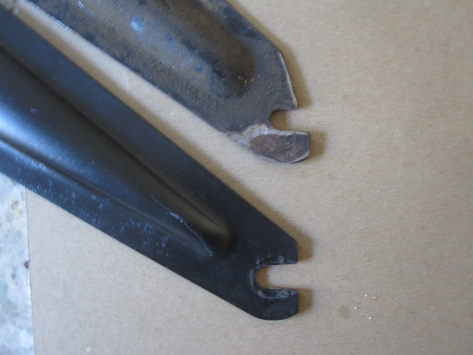 real 914 6 muffler hangar It's the lower one in the picture and has larger slot for 10mm bolt vs. 8mm for 4cyl. 2.0 also cut 'square' compared to the 4cyl. angle. AND different shape (more pointed) pressed reinforcement. Attached thumbnail(s) |