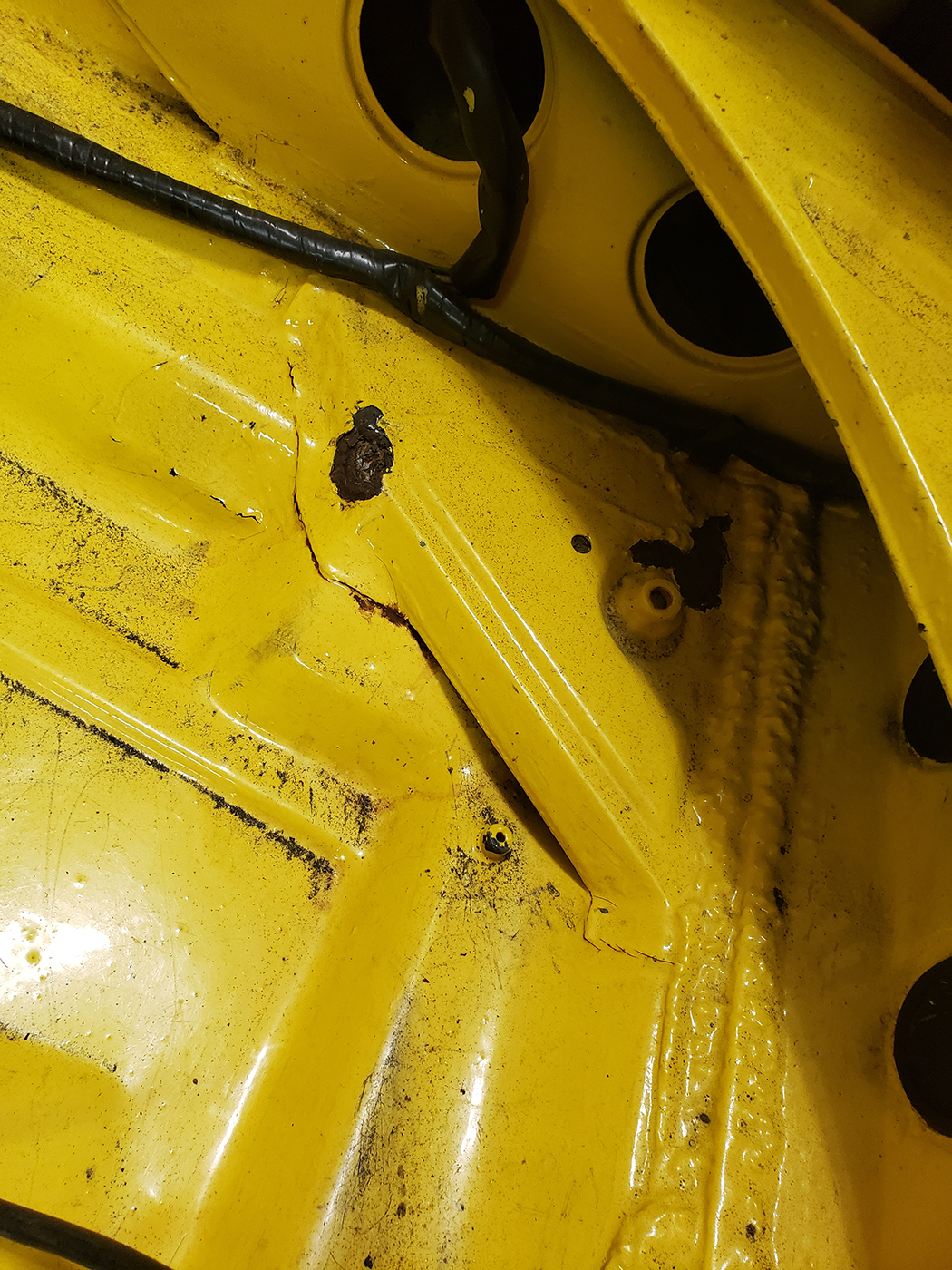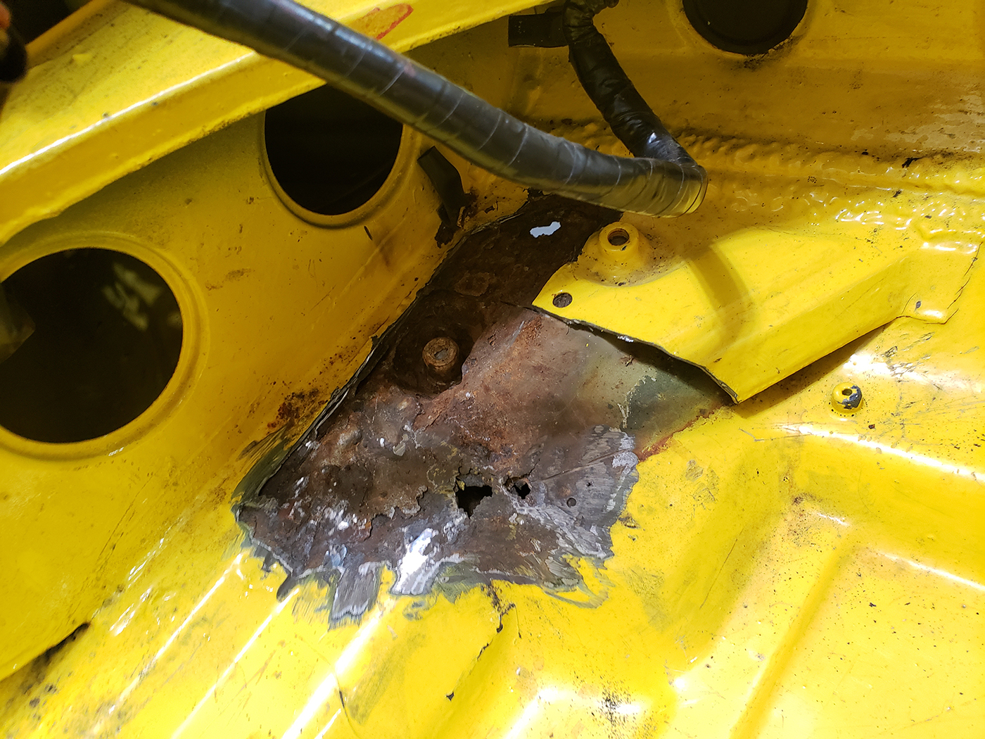 I found the same issue when I was rebuilding my 1972 last year...I started with "custom patch panels" and found metal thinning in several areas. Wound up buying the front pan section as well as the passenger front triangle piece (mine looked like it trapped moisture between the two metal panels and corroded from the inside out). Good luck! |
