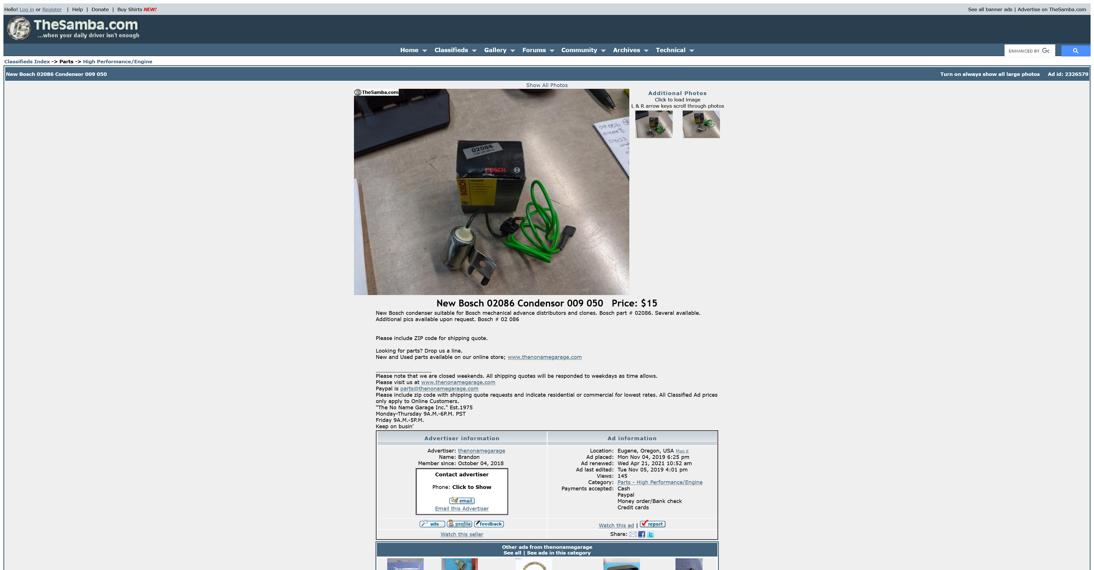 I need to get a set of points and condenser for a Bosch 050 dizzy. It looks like the correct points (Bosch 01 030) have been NLA for a long time and even old stock has dried up. 01 011 (I believe these are the same as used in most stock 914 dizzies) will work and are available. So which condenser to get? I'm assuming Bosch 02 054 (also stock 914 part) to match the points rather than 02 086 which was original for these centrifugal dizzies. I'm also guessing it really doesn't matter, but what use is having access to the world's greatest 914 brain trust if you don't use it? (IMG:style_emoticons/default/biggrin.gif)