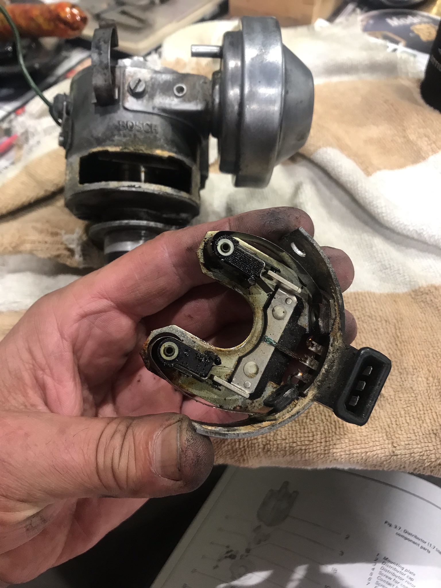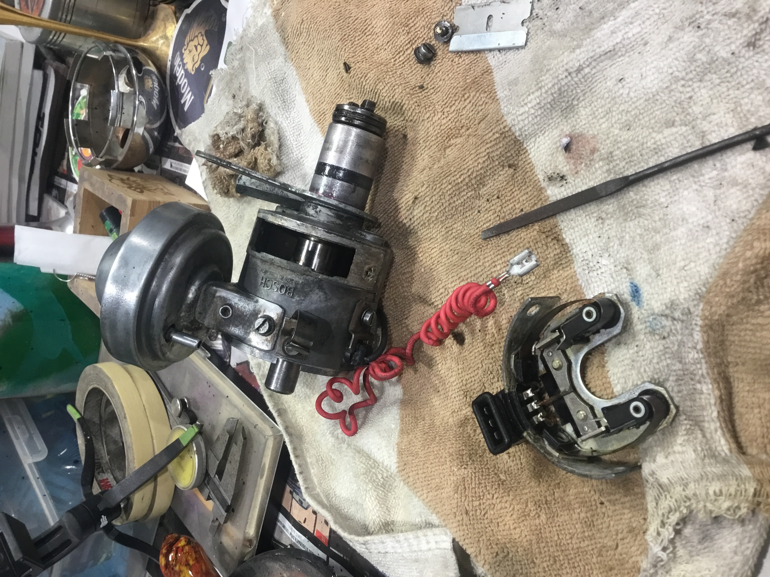 @Solocholo it looks like the contacts for your FI triggers are partially broken off.( or maybe I am not able to see them clearly?). There are some members who you can source them (also can re-adjust to factory spec with special tool) but reading through the comments I received it was clear that swapping in a new modern dizzy is the way to go. Expensive...but what isn't these days. Will report back later today with how my engine is running. edit....mix up in shipping. Got the wrong one so now delayed until Tuesday.