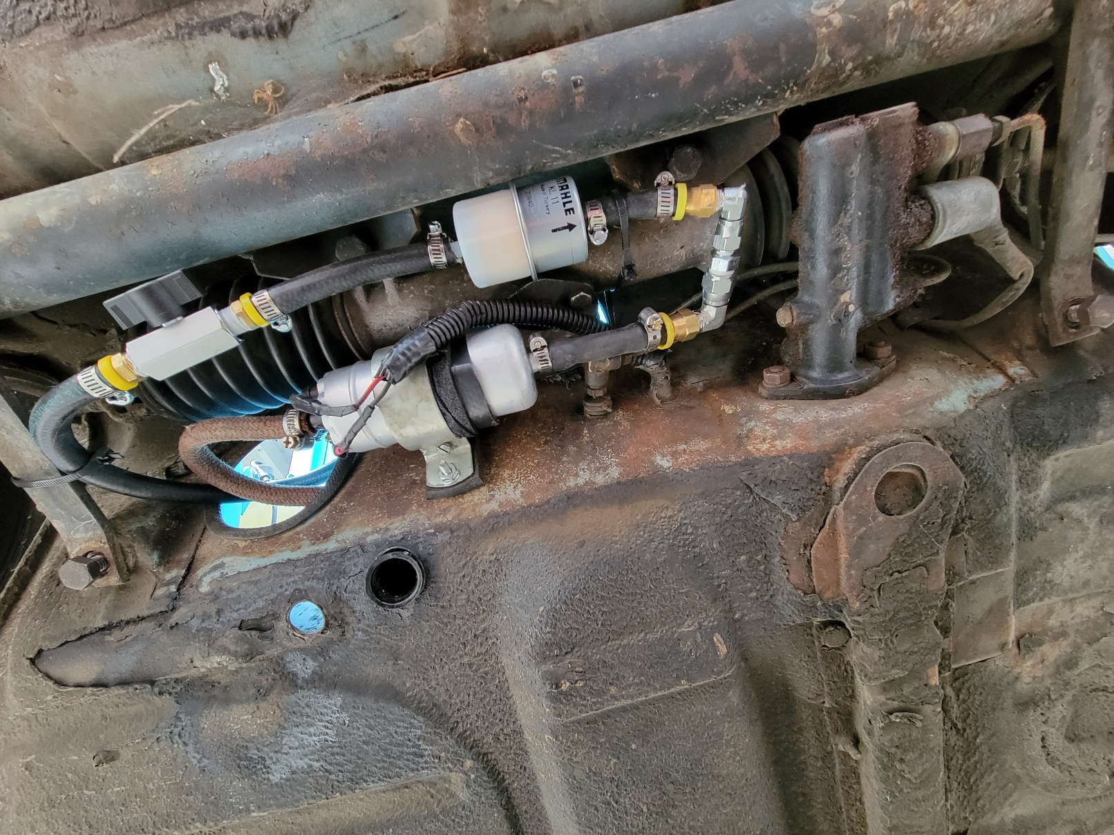 The Dansk fuel pump I got has an inlet of 1/2", which means I need to adapt from the feed hose to that much larger diameter. Fortunately there's a great custom hose shop in Spokane. Unfortunately they're open 7-4 M-F, so I guess they get a stop on Monday from me! In spite of this, I got the pump wired and mounted. When I cycled the ignition on I heard the pump run! It's going to get there, just not this weekend. |