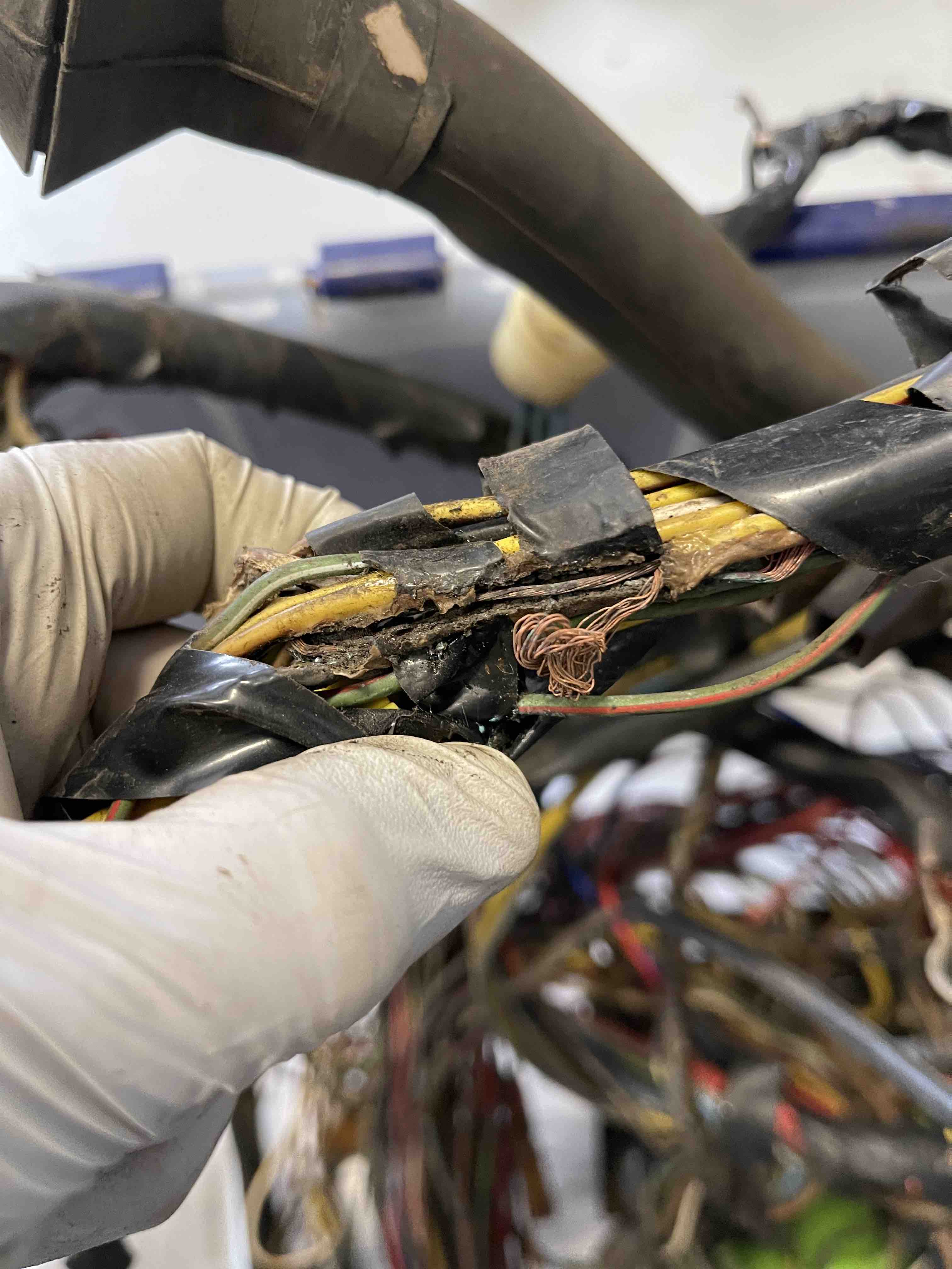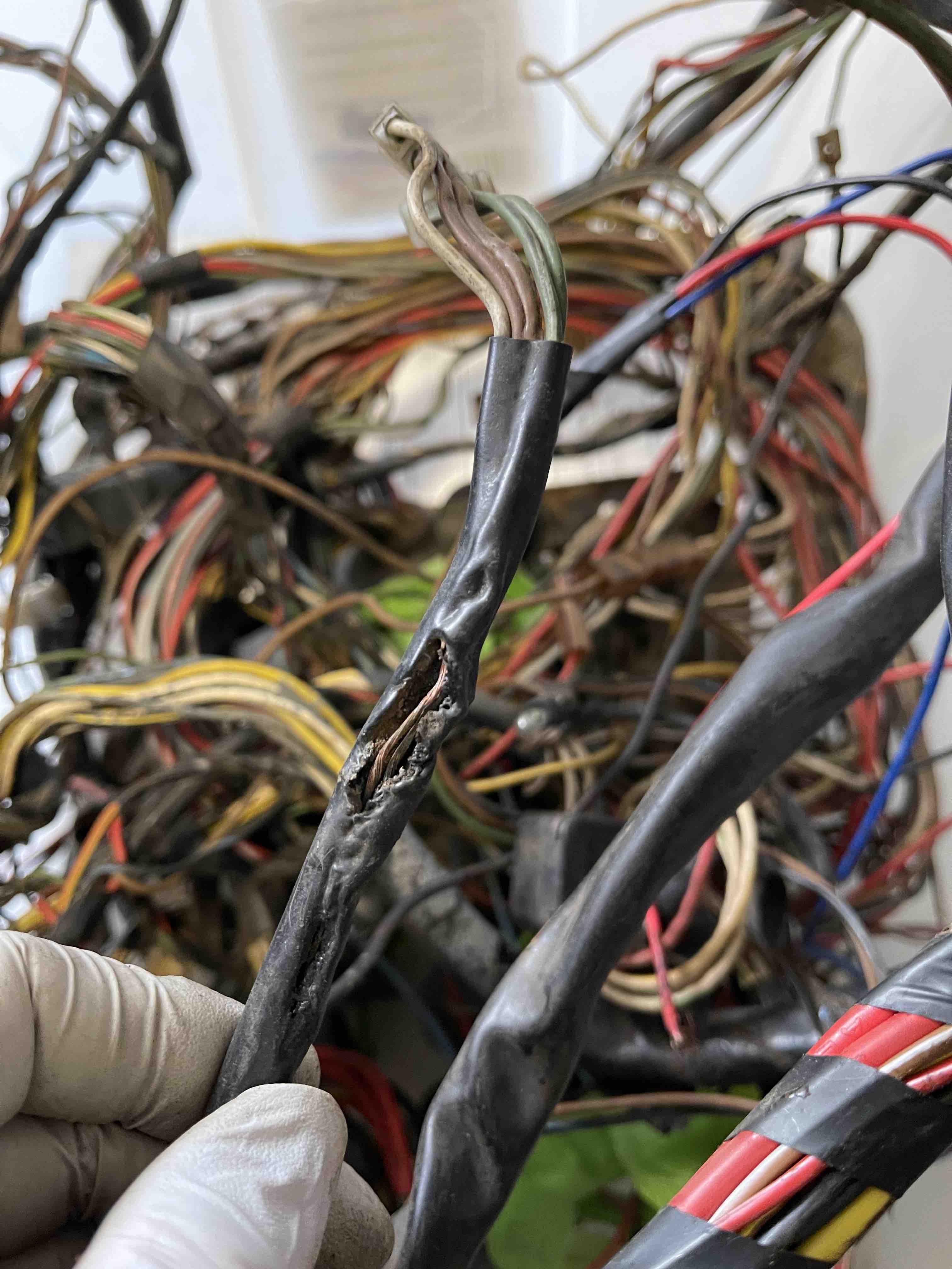 I'd recommend cleaning the entire harness and removing any non-original wires or repairs. Next, I'd string it out on a sheet of plywood like the pros do it - using nails to hold it down. Take it one section at a time and simply make repairs and/or replace entire runs of wire at a time. Make sure you use the same gauge/color wire when possible. |