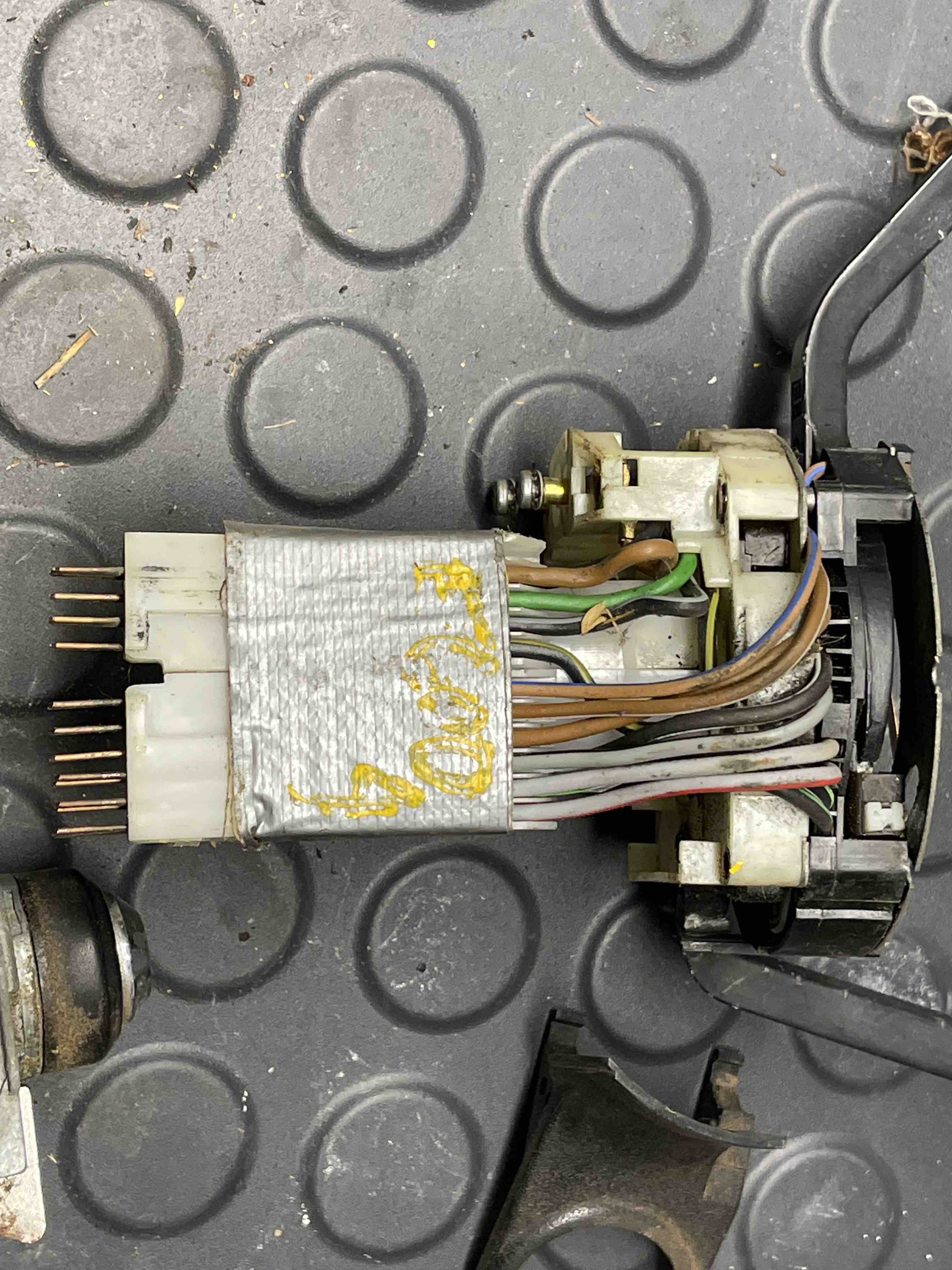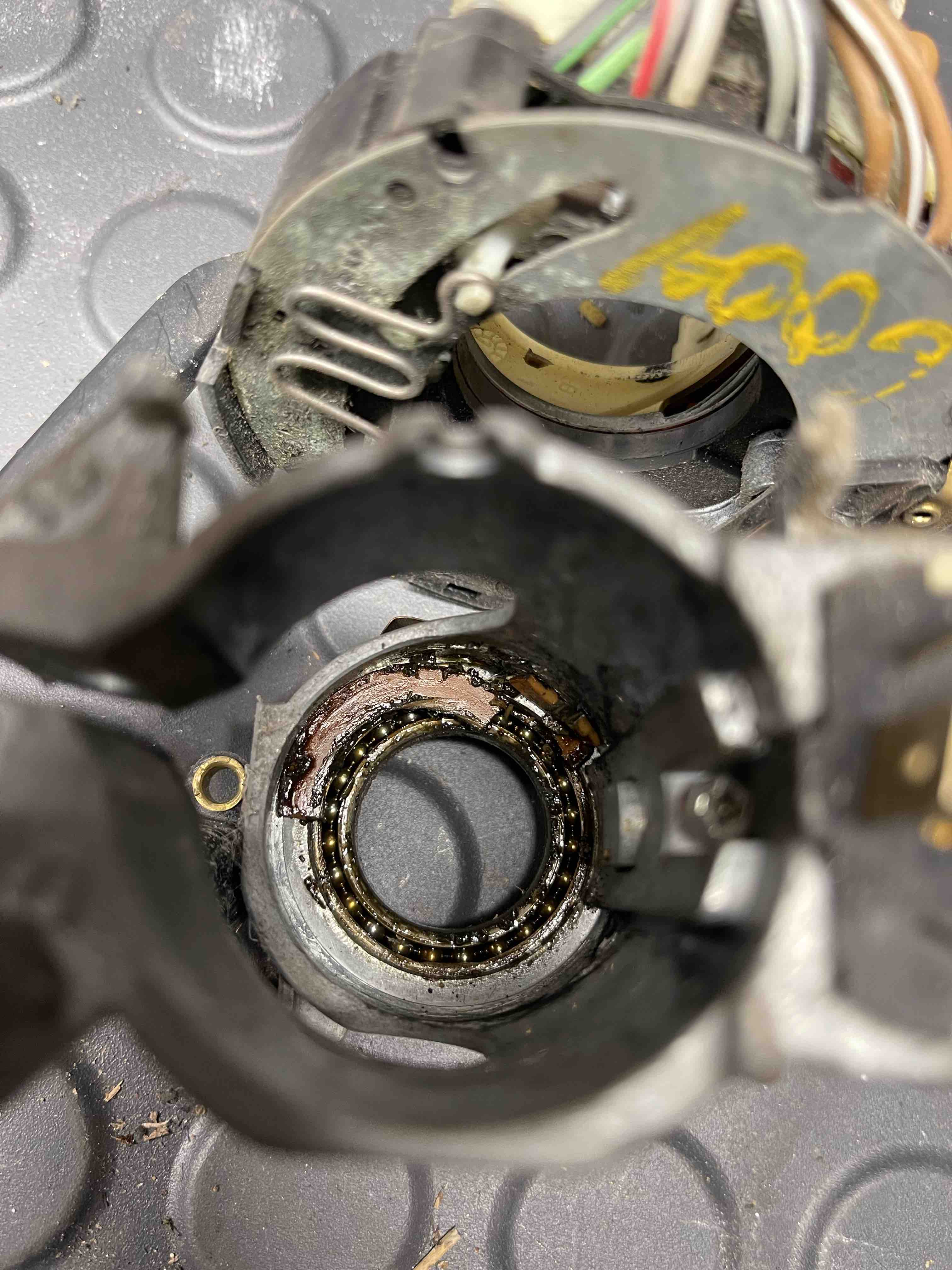 Delete the whole harness. Buy a "new" harness. God only knows what else is going on in that thing. I could buy a harness but I'd like to learn how to repair this. I would have liked something that didn't make me say WTF every few minutes. Oh it gets better. I need to get a video on how to attach wires like this: Here is the steering column washer/signal switches with the custom silver Porsche electrical wrap: and looking down at the bearing for the steering wheel - it looks like the plastic disintegrated and explains why the steering wheel was flopping around. Probably should have called this Project WTF. I should start a separate thread on the stuff we find in our cars from PO's. Doubt that would survive a few hours on Instagram. DaveB |