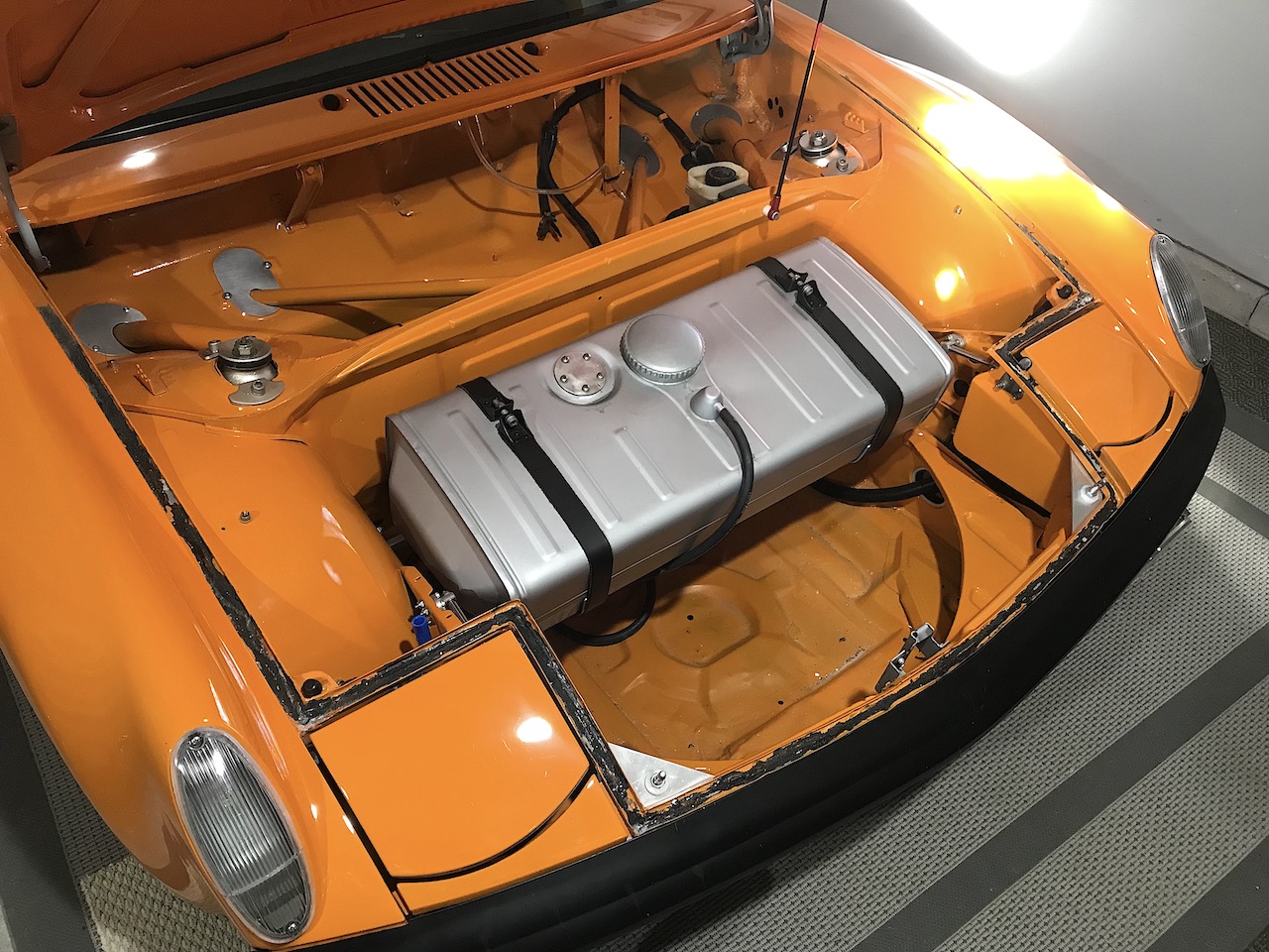 Not to rain on any parades, but the frunk also serves as a crumple zone. I proved this when I collided on-track in my SCCA-PCA race car. The front end collapsed up against the front bulkhead. The stock tank in the stock location got a small dent but was otherwise intact. The impact was hard enough to put a kink in the floor pan, and break the mounting ears from the transaxle.