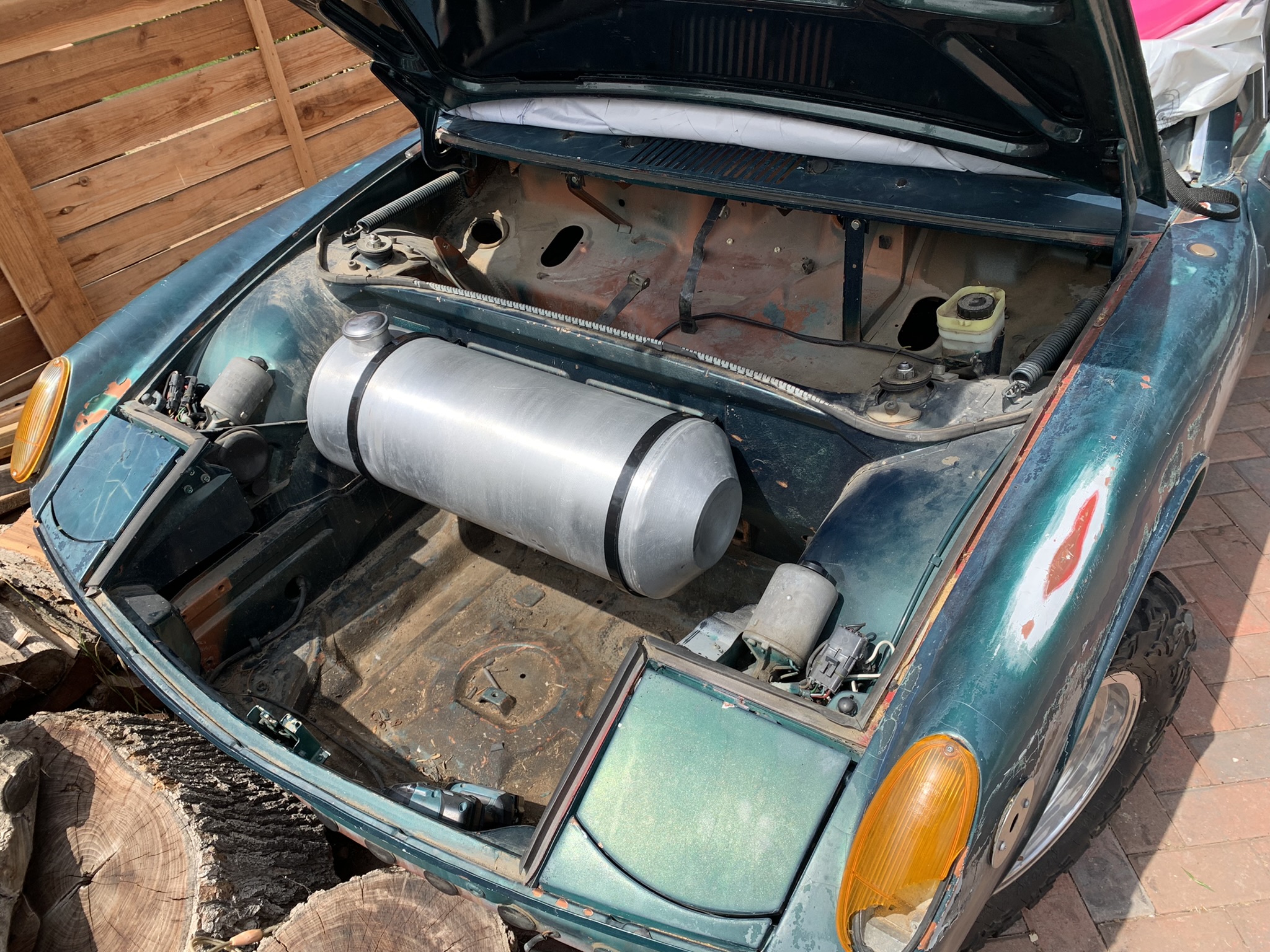 open up the hood and put a aluminum cylinder tank in the original spot and show case your baha idea plus ,fill up fast! (IMG:style_emoticons/default/smoke.gif) When I read this I remembered seeing just that setup recently. Found it in an eBay auction that's open right now: https://www.ebay.com/itm/195048466156?hash=...xYAAOSwuQlifUj~ It's a carb car which makes it a bit easier but it doesn't look all that bad -- if you're into fuel tank mods! Ron ![]() That is the look I was thinking of , just section out the hood so the tank sits proud. easy fill up |