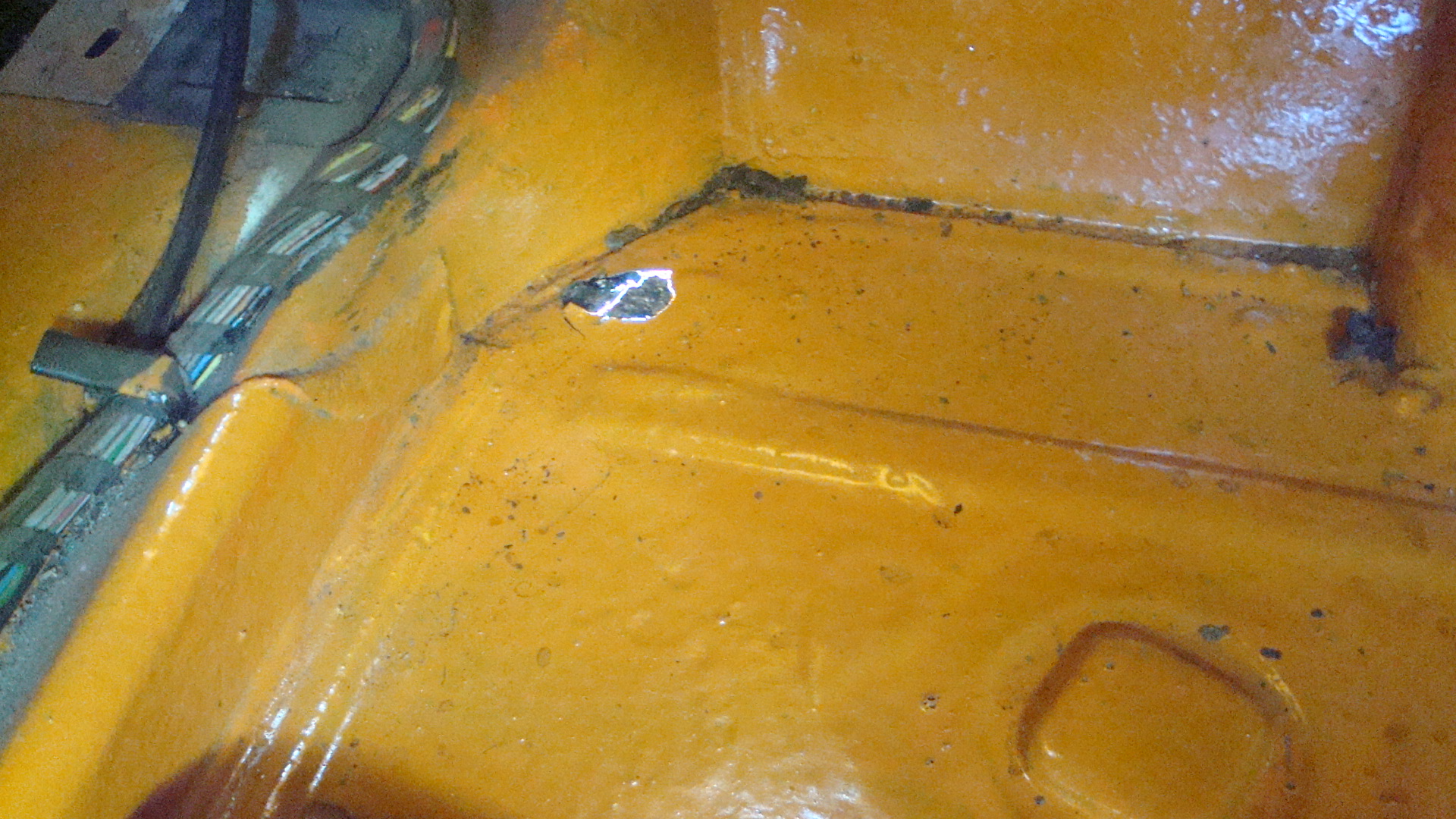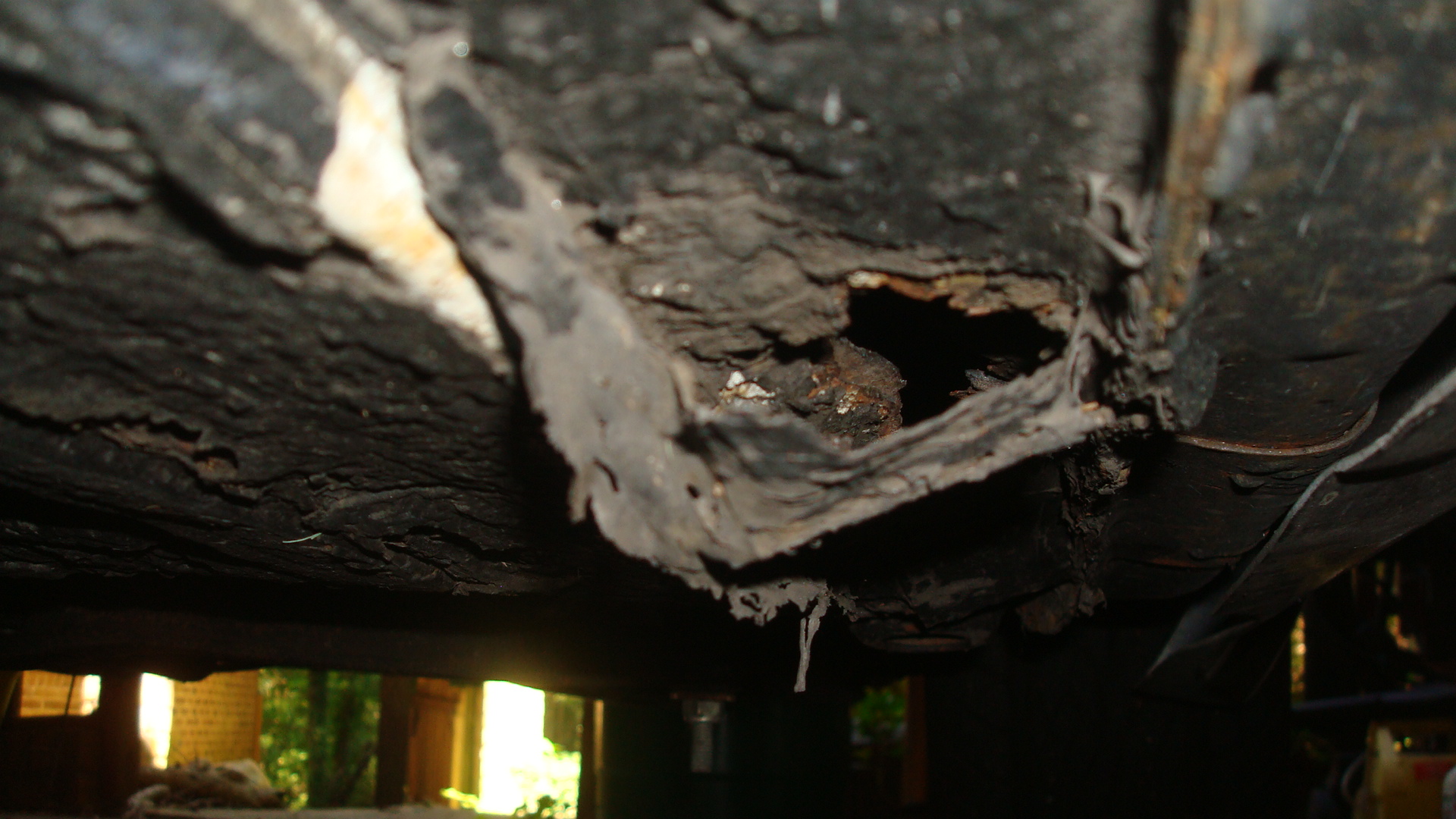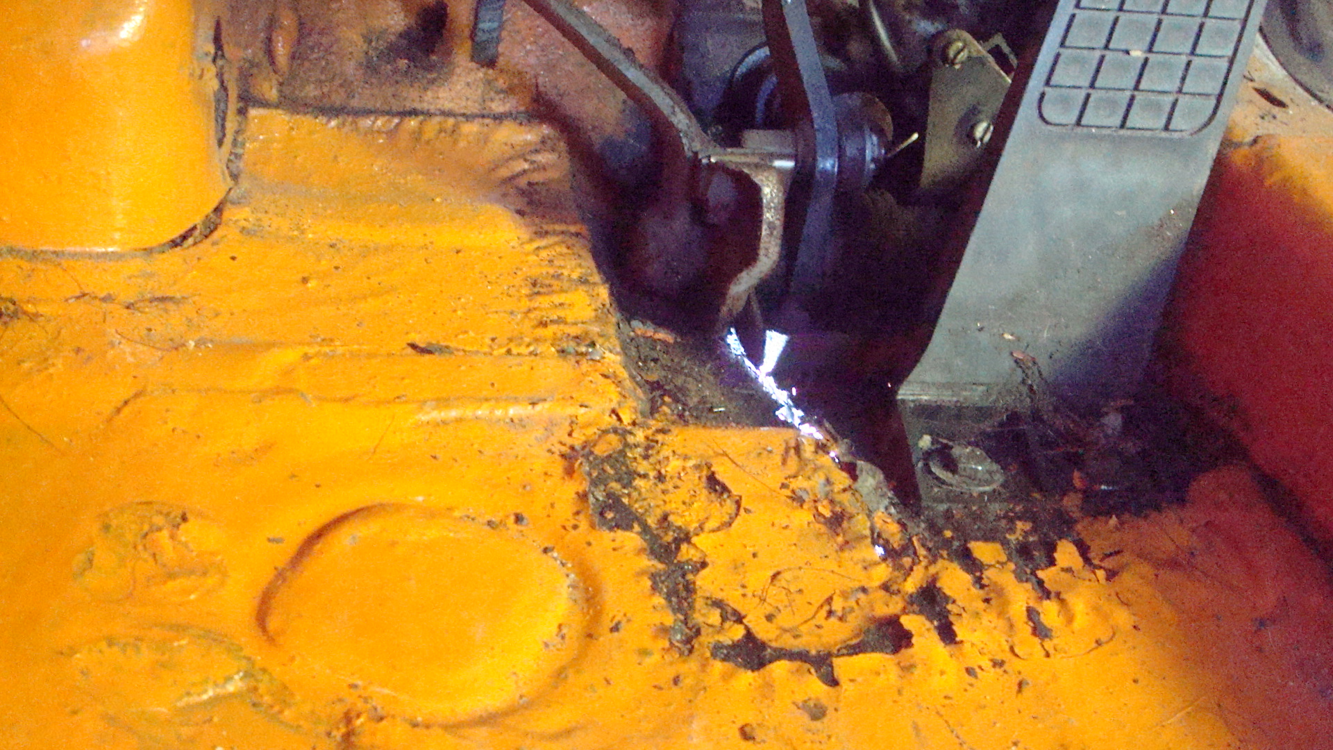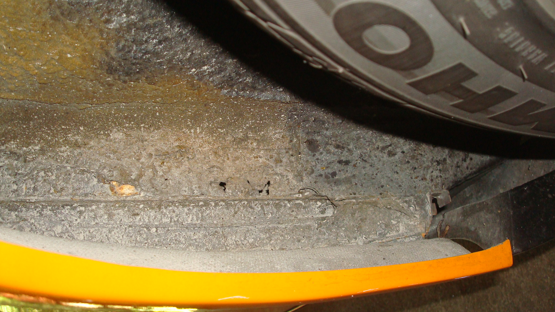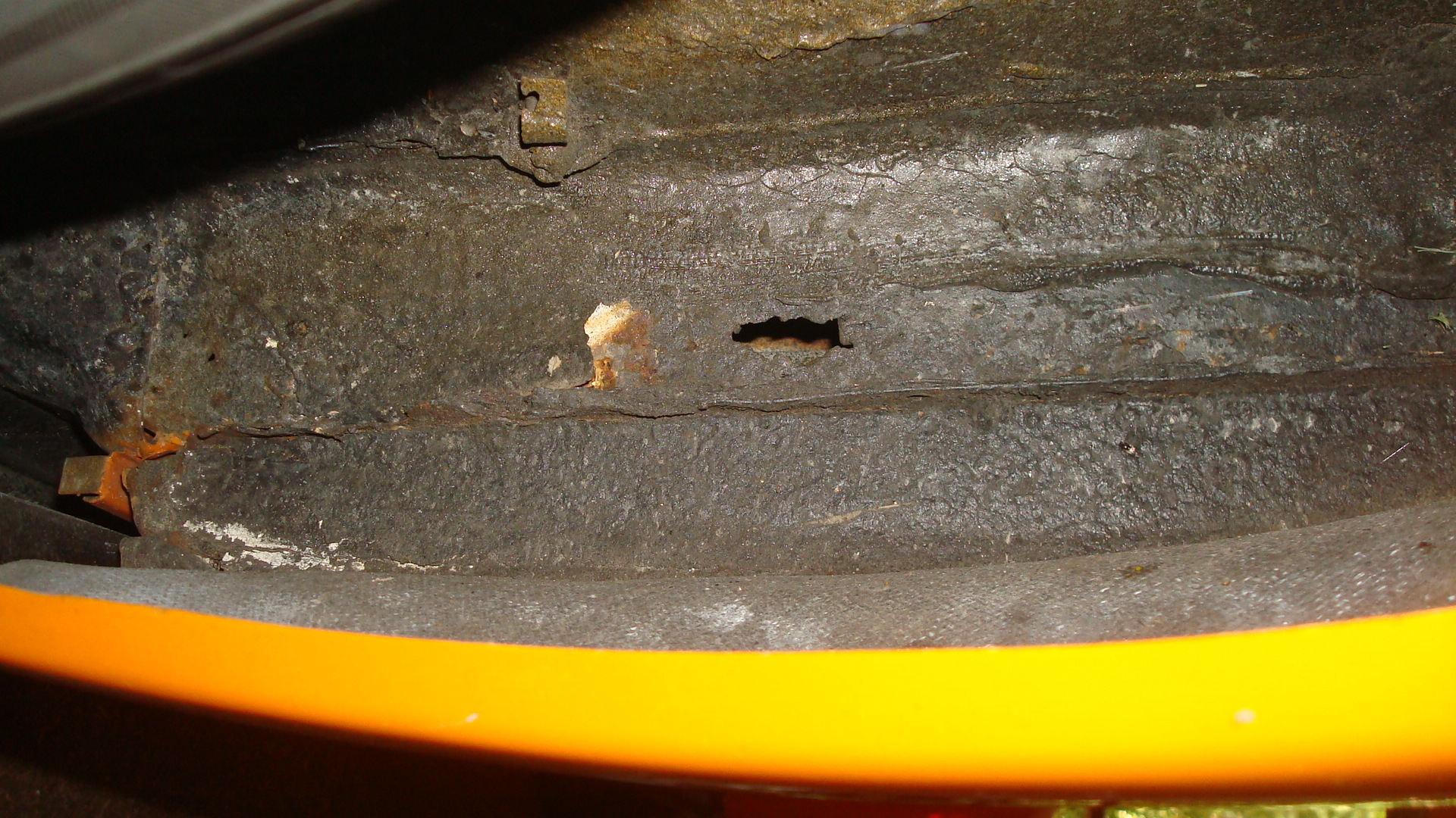 Not sure exactly where on the car this is, but this is basically how the entire underside of the car looked. Anywhere that you could see through the goopy undercoating, there was rust scale and holes