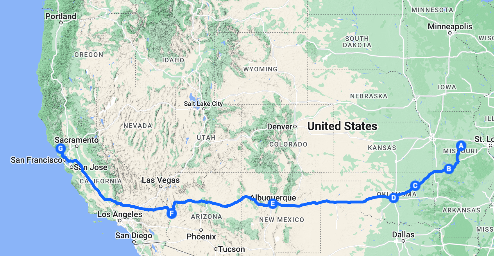 I'll soon be trailering our 356 chassis to my home garage so that I can work on it in earnest. Our route will be from Missouri to California, mainly along interstate 40. We'll be stopping at Ollies and California Motorsports (CMS) in Lake Havasu City to drop off our 914-6 engine and transmission.