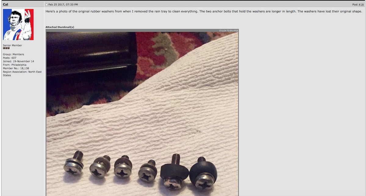 @Van B @L-Jet914 Curious - while doing some post driving season cleanup I removed the rain tray for the first time ever. Noticed that the two rear outer screws are yellow zinc plated and slight longer than the other four bronze-like finish, slightly shorter screws. See pics below. Any experience, history, or insight? (IMG:style_emoticons/default/confused24.gif) To my belief these are original and, again, yet another quirk or something purposeful? (IMG:style_emoticons/default/confused24.gif) Of course, this follows my recent discovery (confirmed as correct) two different screws used to hold the speaker housings. ![]() |
