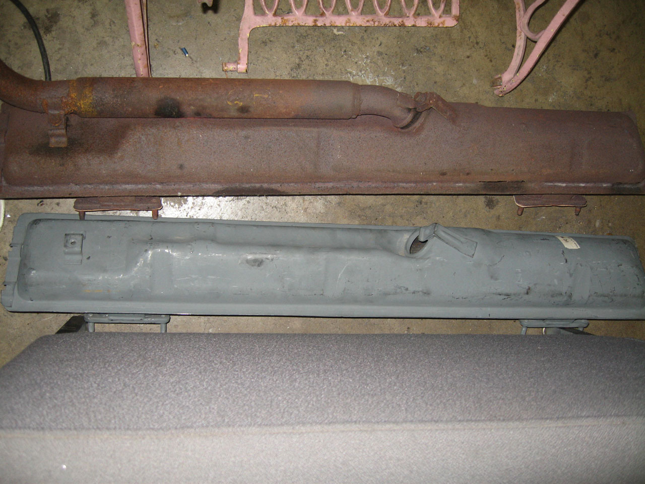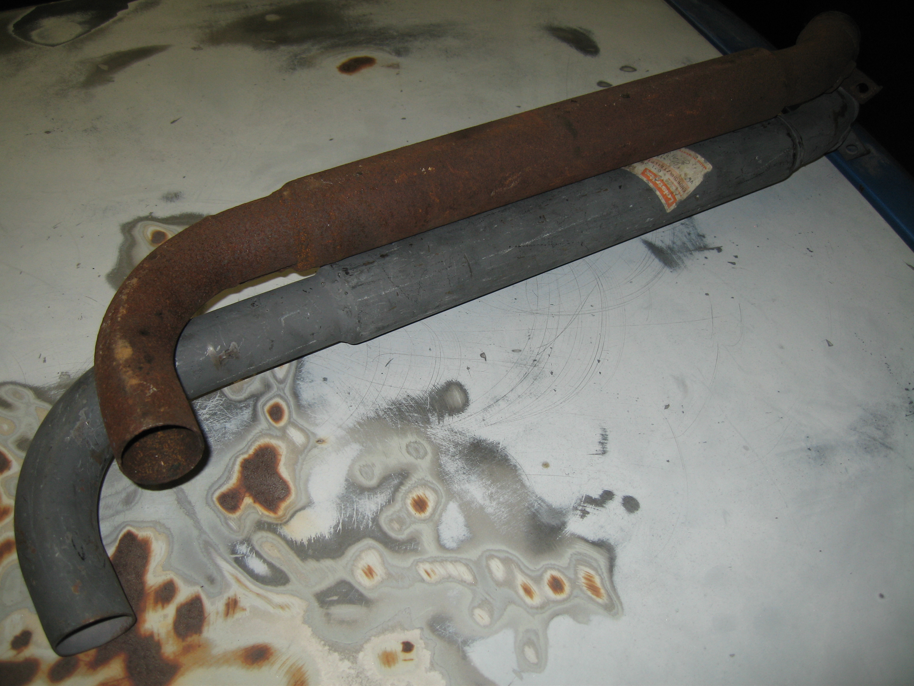 Ah yeah, I see what you mean. The side exit mufflers come out the right side. You actually have to modify the 72 bus right side rear bumper bracket to clearance for the tail pipe. In 73 they switched the tow hook to the left side. Still, unless the Dansk muffler has the picture wrong, the outlet is coming out the right side, and it is essentially a bus muffler. (IMG:http://www.914world.com/bbs2/uploads_offsite/c767170.r70.cf2.rackcdn.com-21899-1671591641.1.jpg) Here's a pic of the original 914 1.7 L center exit tailpipe (rusty one) vs the longer (411?) tailpipe. The proper early type 4 bus tailpipe is actually like this, since I'm all showing off my early tailpipe collection. (IMG:style_emoticons/default/biggrin.gif) |