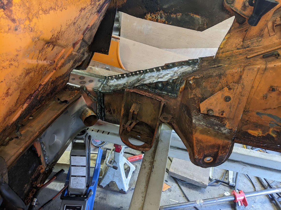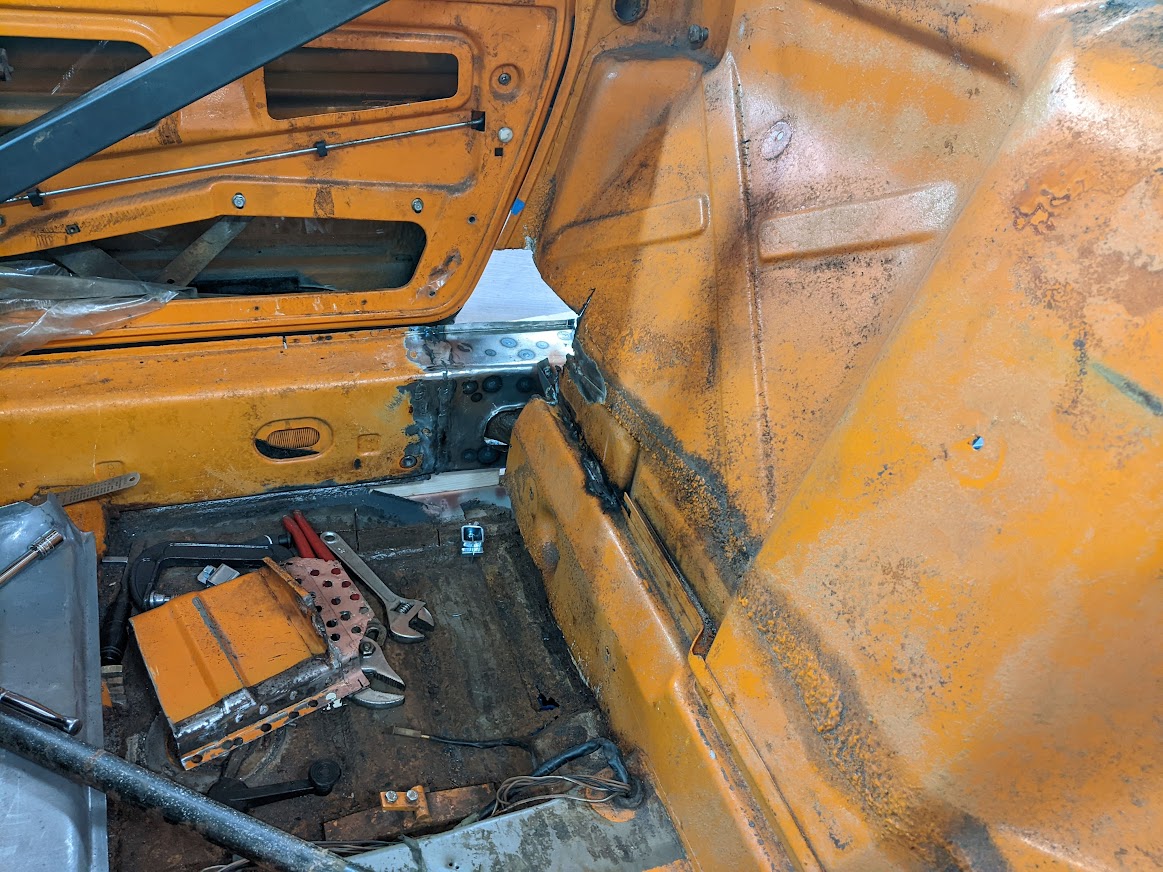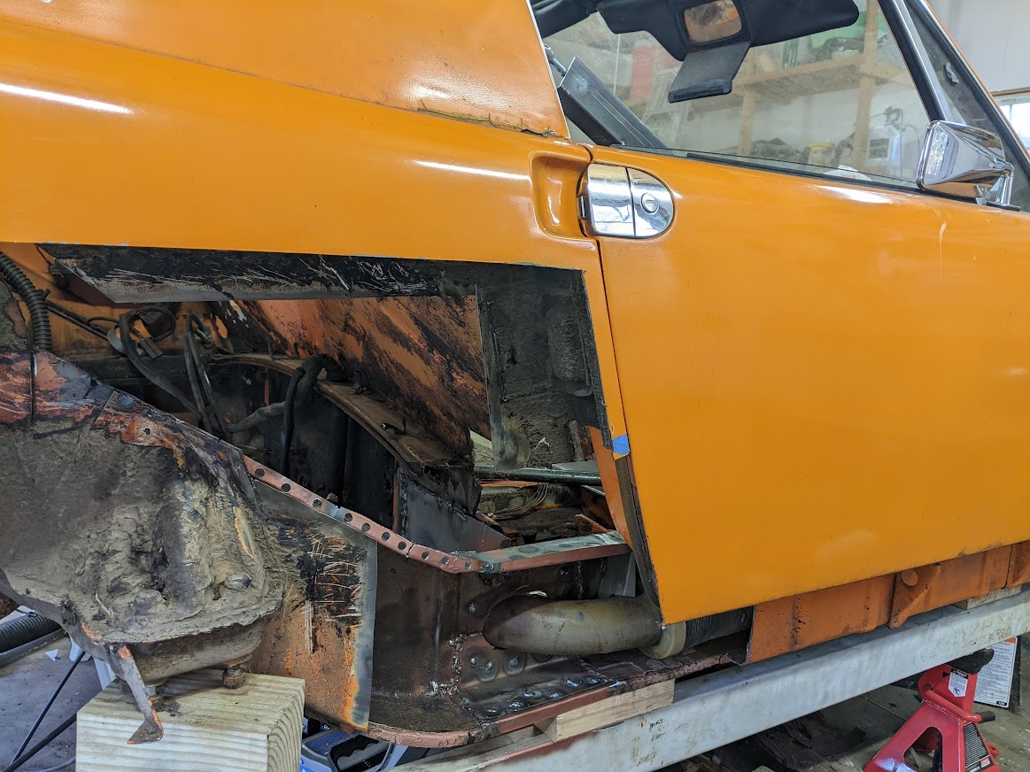 So I'm wondering how much of this I can reuse. If I clean these up, how do we regard the rust that is likely between the sheets? I should start a video series or rename this thread "Porsche 914 on a budget". Note that I have the car on some sort of warehouse shelving beams which I got from local DH Griffin wrecking. I got some 1.5" square tubing from there too for door braces and mounts at the bumpers for later rotisserie from some odd panel frames. Whatever I can haul off for $0.5/lb. I didn't find useful sheet metal yet. Though the tubing was mounted to 1/8" plate if I can use that. |