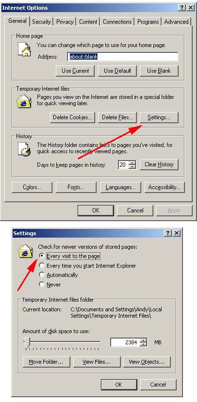 IE stands for Internet Explorer which is Microsofts Web Browser. don't hold down CTRL every time you hit the refresh button, just when you suspect something is showing wrong (or not showing). holding down CTRL while hitting refresh will force the browser to bypass the cache and look for newer versions of all pictures on a web-page. if you have a highspeed connection, like DSL or cable, you can also set your preferences to permanently check for updated versions of pictures every time you refresh a page (eliminating the CTRL button trick). to do this, open IE, go to the "Tools" Menu, click on "Internet Options", click on the "Settings" button. a new window will pop up. change the fist set of options to "Every visit to the page" and hit "Ok", then hit "Ok" again. close IE and open it again. your browser will now always check for newer/updated images when you refresh a page. see pics below ... (IMG:http://www.914world.com/bbs2/html/emoticons/cool.gif) Andy Attached thumbnail(s)
