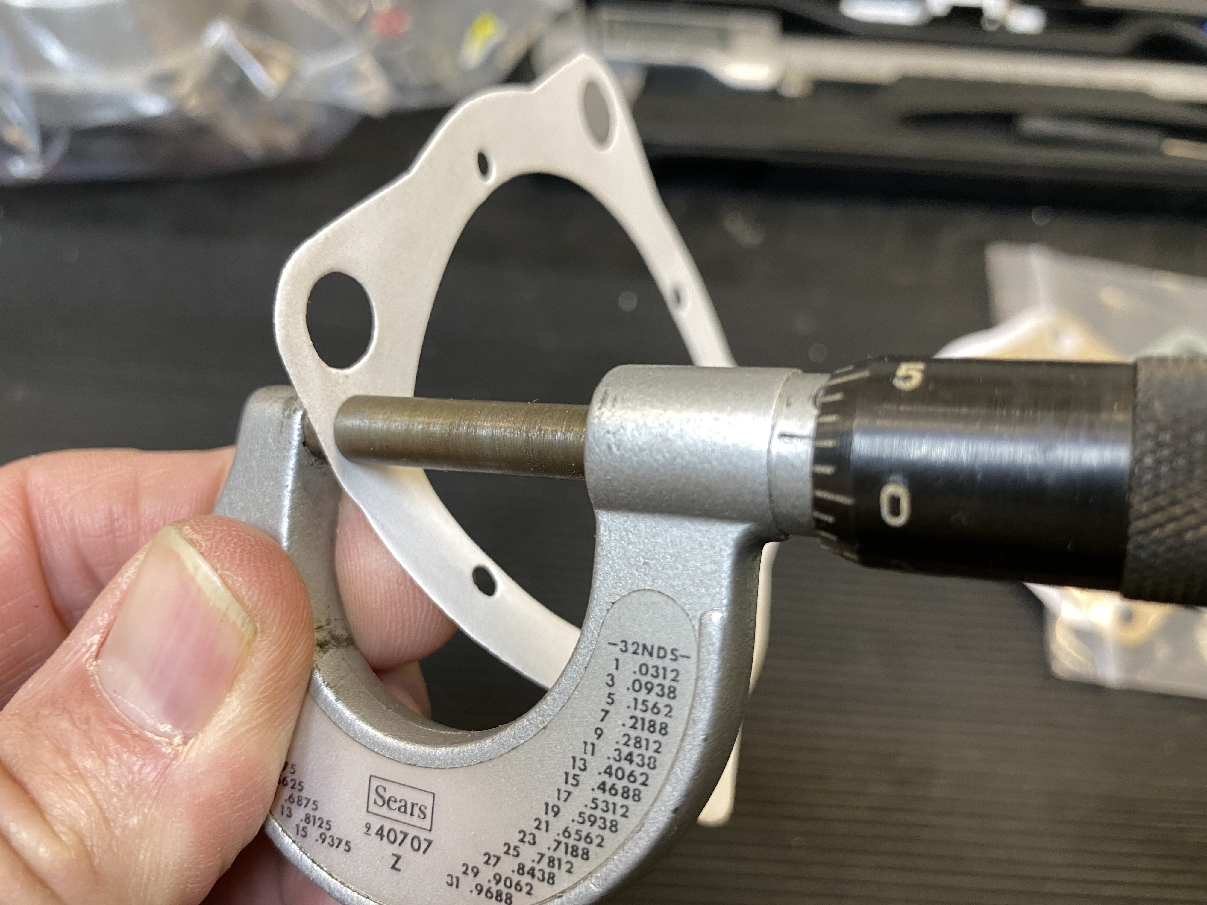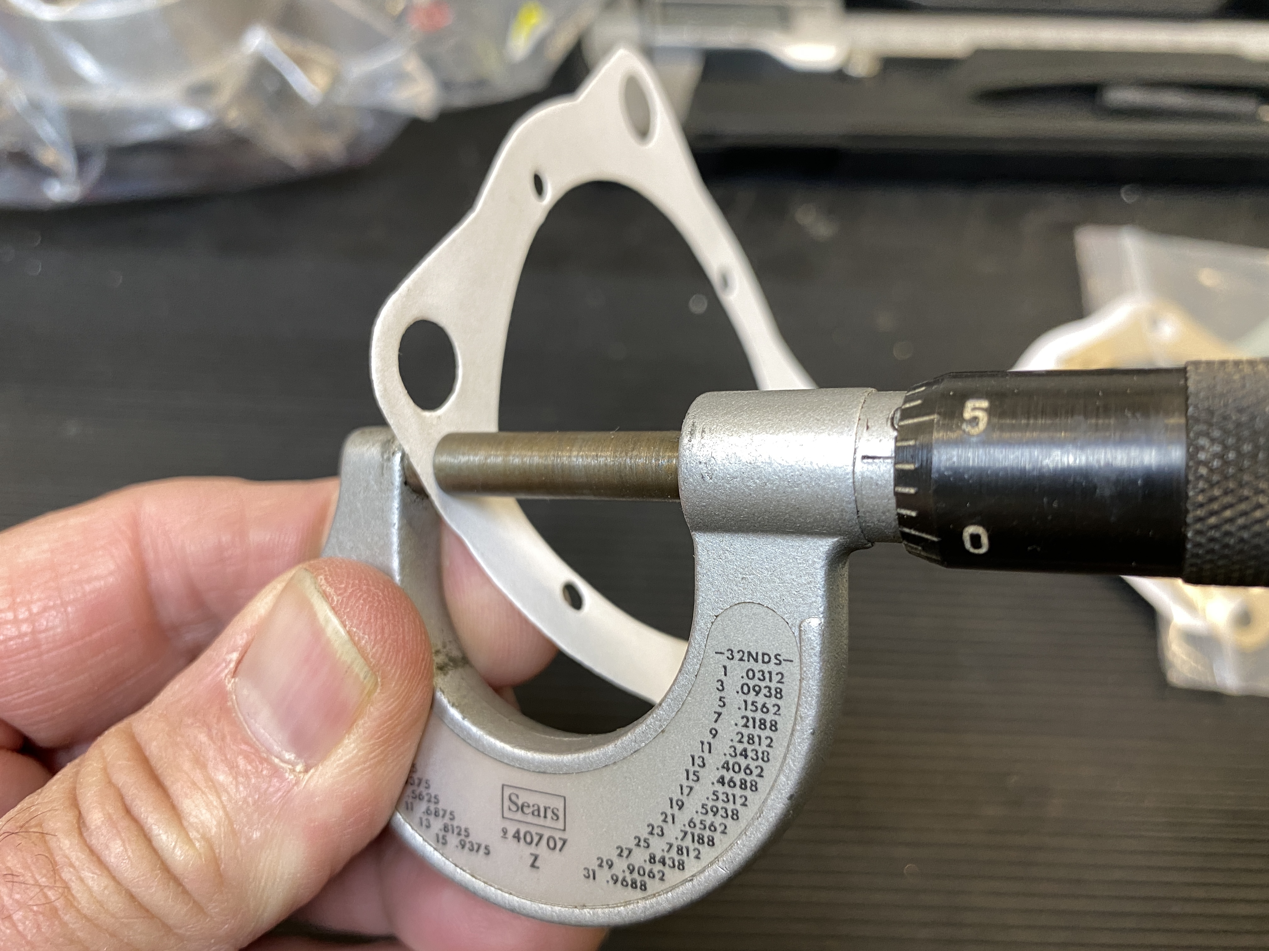 Now that I'm in the shop I measured what I have here. The cover gaskets and most of the rear gaskets are the same thickness, just under .004". I found one rear gasket that was .008" and I have some thick ones which compress quite a bit but I don't use those.