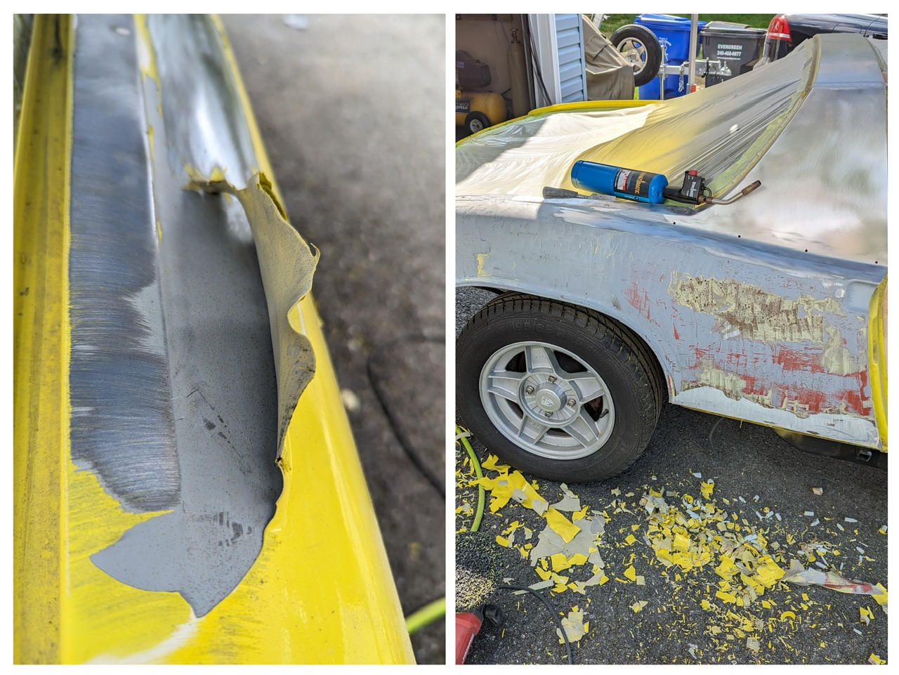 After laboring through the gummy nasty second layer of paint on the driver side rear quarter, a funny thing happened on the passenger side. I noticed a small section delaminating as I was working with my coating removal disc. So, I pulled on it a bit while it was still warm. My instinct was correct, the paint was not at all bonded… anywhere. So, I took a torch and chisel and stripped it like old house paint lol! Unfortunately, I found a terrible excuse for dent repair that was rusting away underneath. Because I have all the records for this car, I know exactly when and who did this “repair”. What I didn’t know until today, was the extent or quality. I suppose one silver lining is that this was the fastest I’ve ever stripped the paint off a car lol… and dust free! |