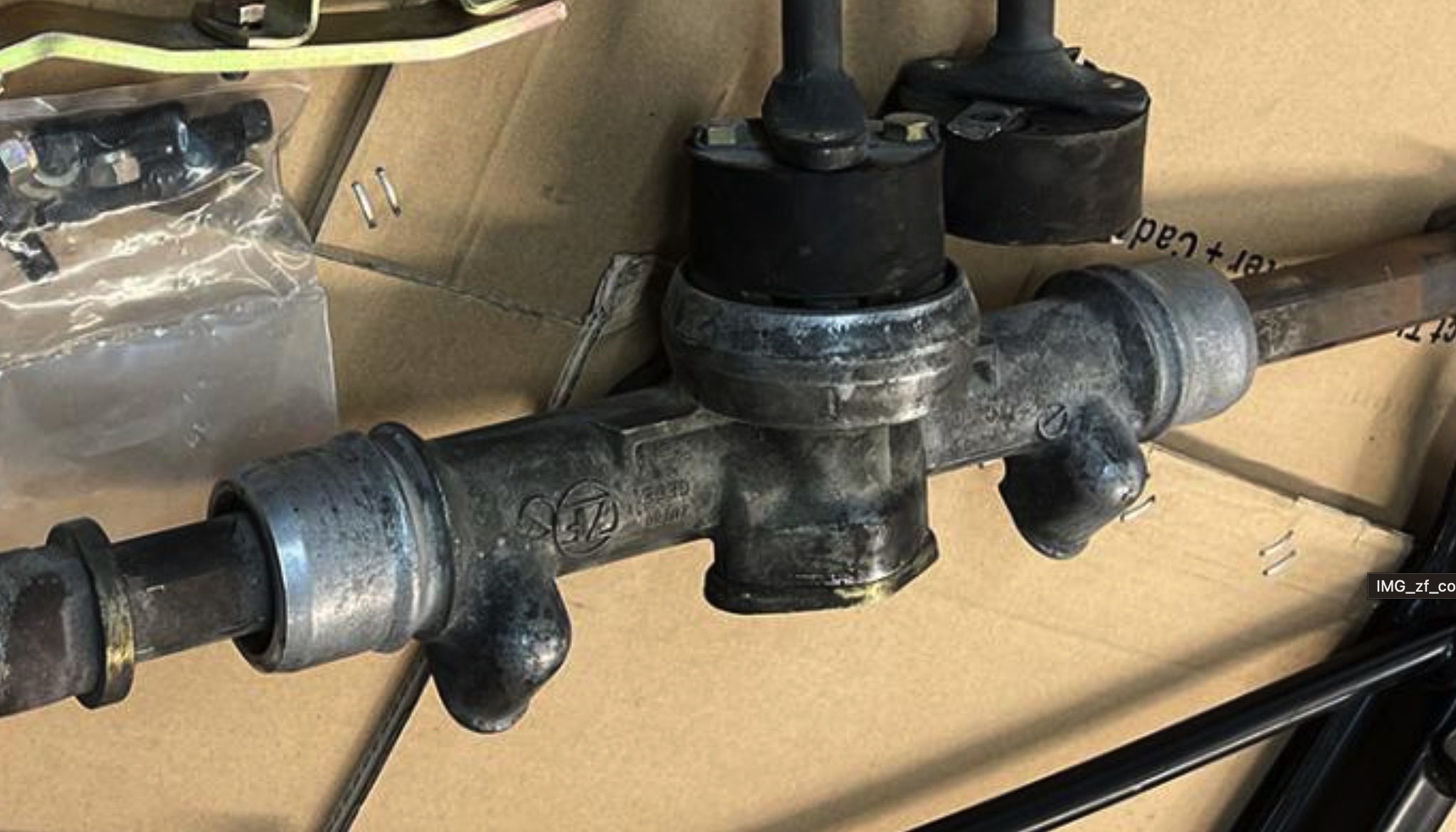 Dennis, Does your rack and pinion come from a 914 or since it was assembled in the Porsche factory does it have a "ZF" box like a 911. My reason for asking is because our real 6 has been apart for 35 years and I have 3 914 R&Ps and three "ZF" with a large ZF on the casting. Al Hi Al. Following up on your question. Here is a photo of the rack out of the car (1970 factory 914-6). You can see the "ZF" marking. Let me know if you're looking for something else. Note: this is the one from my 85 carrera and the ZF is in the casting of body, not on the cover. I have no idea what it means? |