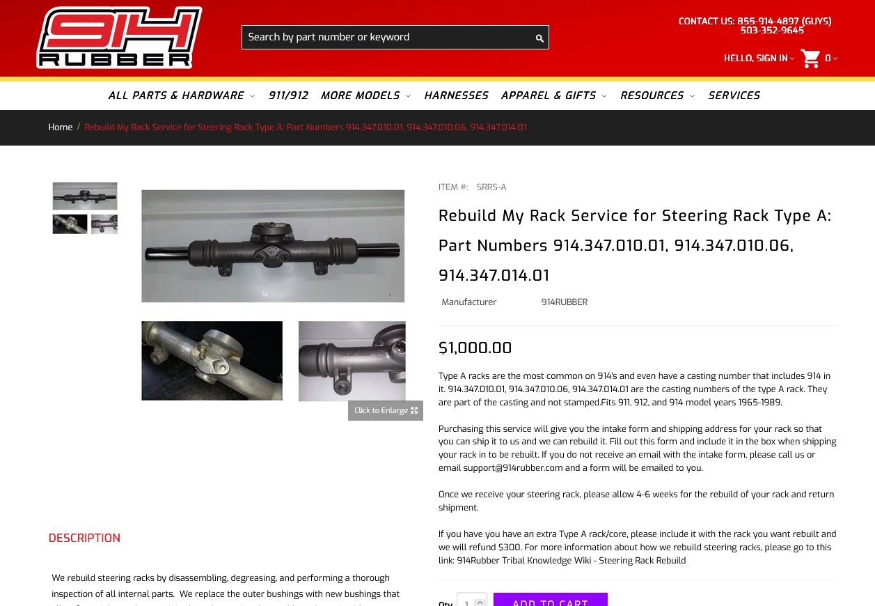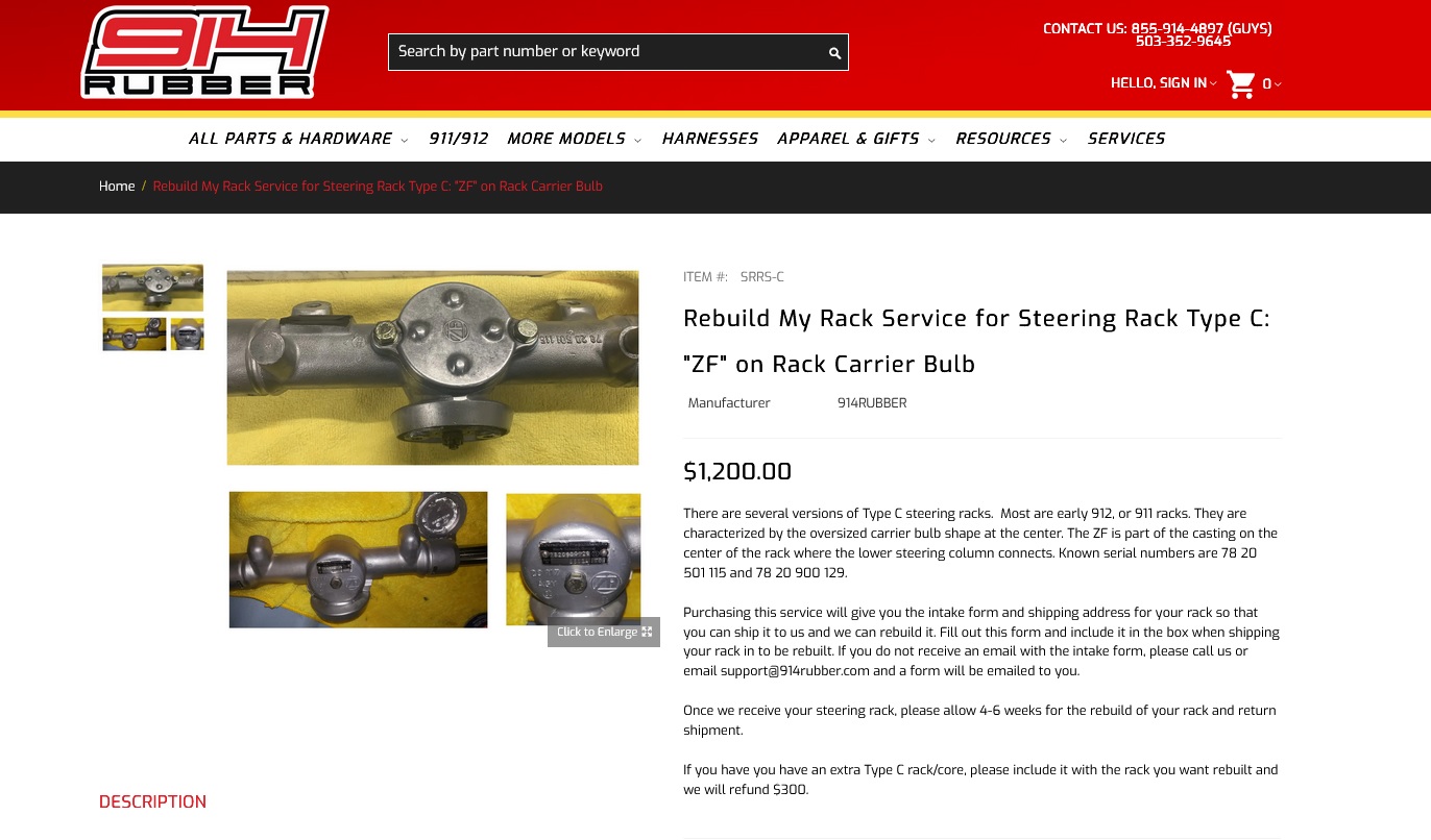 The type A which is most common in the 914, 4 different versions of it. The type B which we find in 914's and 911's The type C (which is the larger shown) more common in early 911's and 912's, again sever different variations, some include a stabilizer bar. https://914rubber.com/search/?q=steering+rack There are multiple variations on each of these, but they are easiest grouped into these 3 categories. Please not the prices on the website include the core, we charge enough that returns are encouraged. The 85 Carerra version shown below Attached thumbnail(s) |