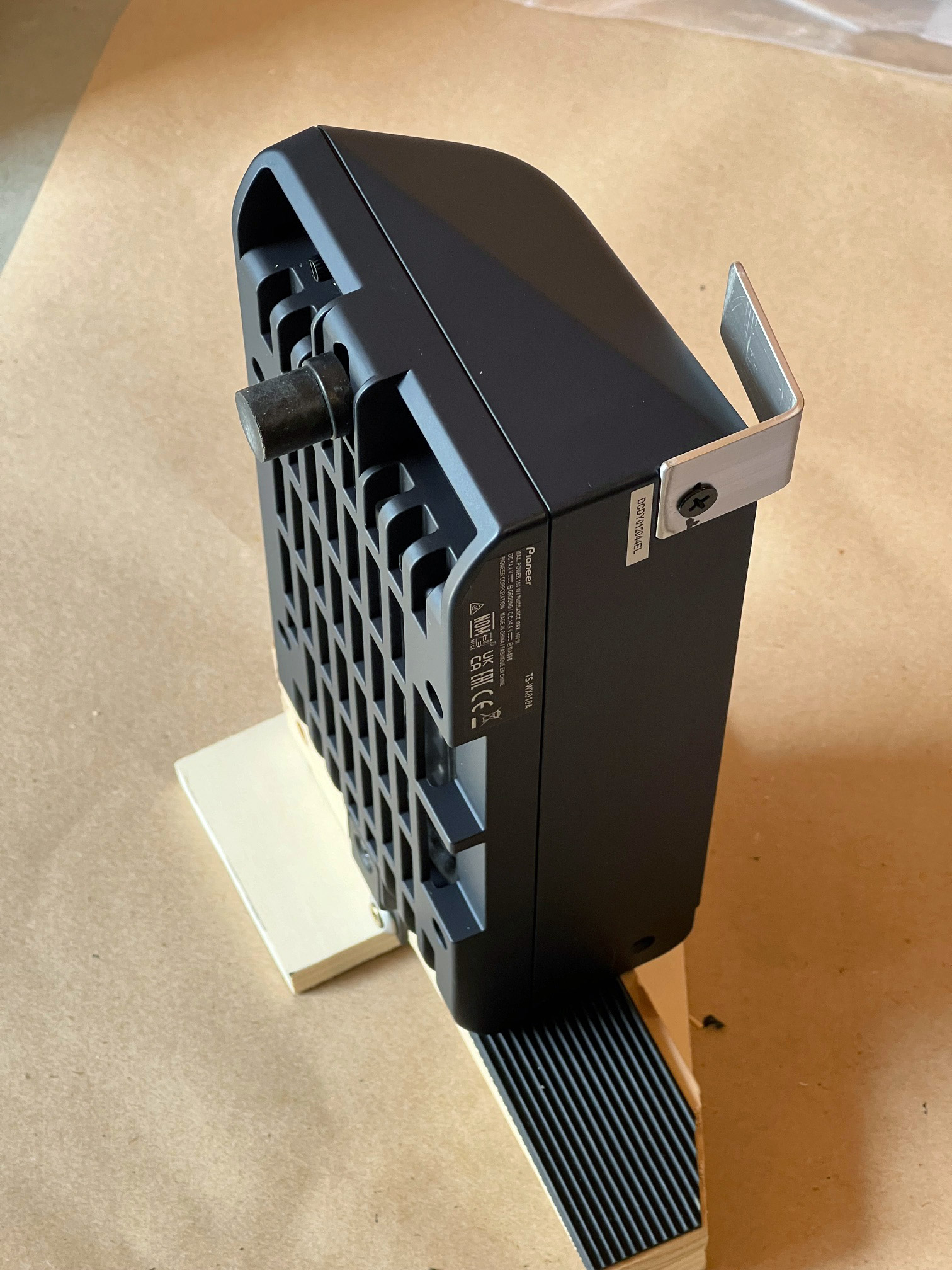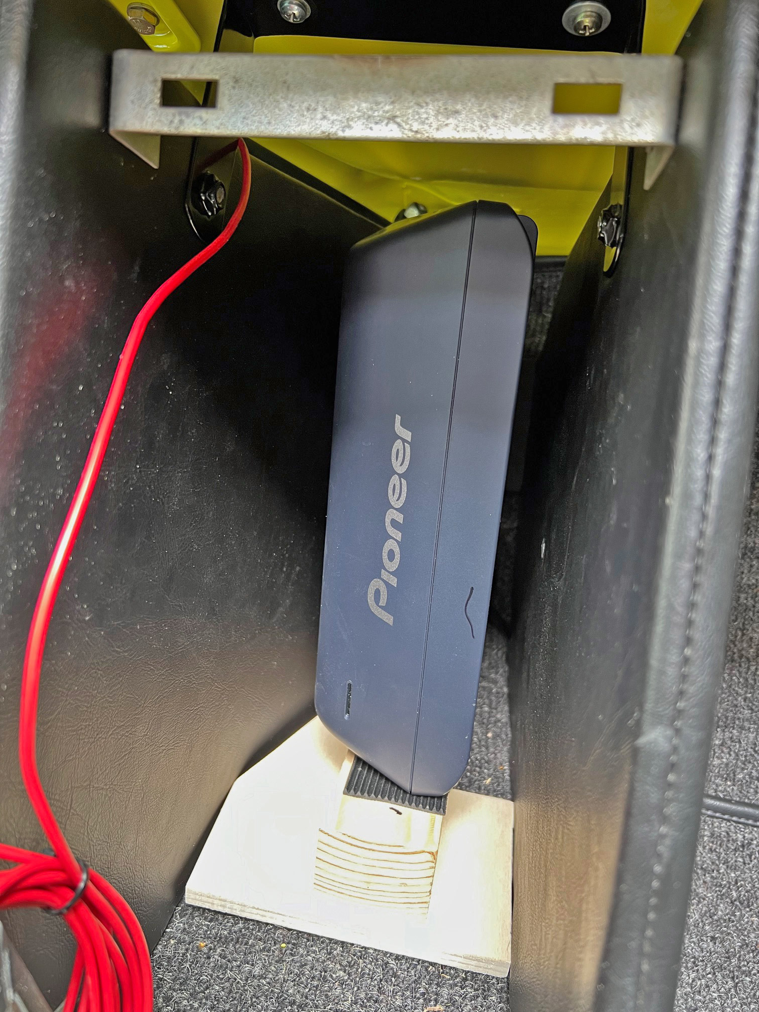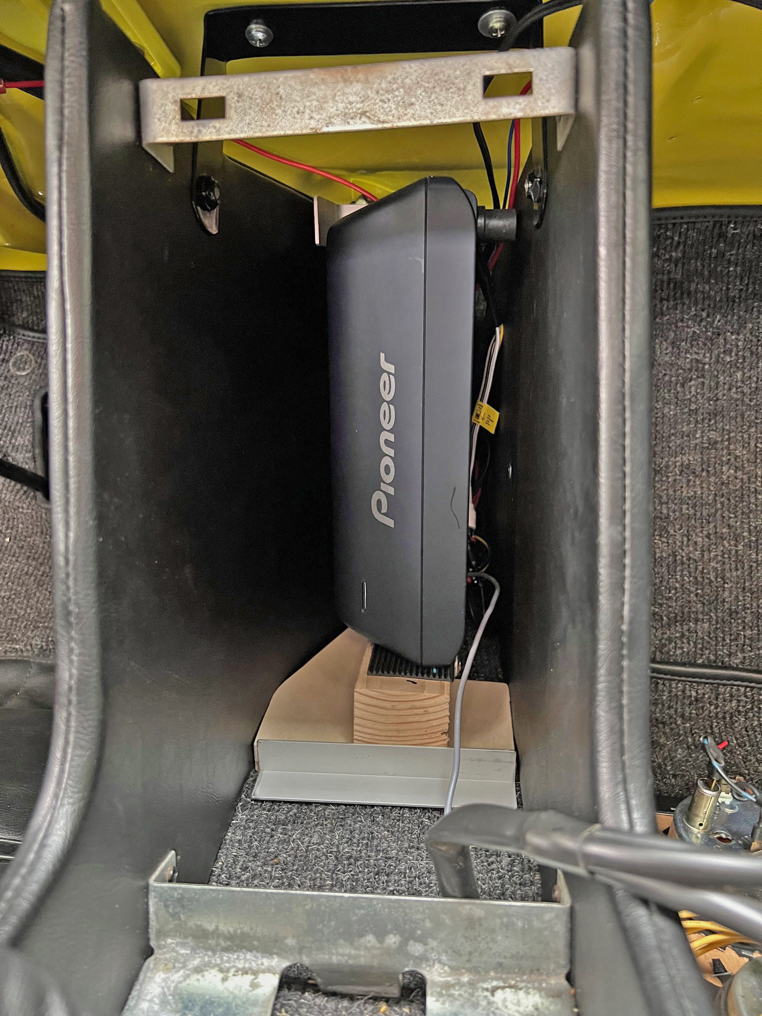QUOTE Has anyone ever tried mounting the Pioneer TS-WX010A inside the console behind the gauges? So, yes, it does fit in a stock center console nicely - just finished my installation! 1. Made a wood block that fits inside the console to the rear, It's a little wedge-shaped horizontally as well to hold the unit more straight up. The unit is then screwed into the wood block with one of the supplied mounting brackets. This is the initial fit test: 2. Then I made a small bracket from an aluminum strip I had, found a rubber bumper about the right size I could screw into the other mounting hole so that the top of the unit lightly wedges inside the console when installed: 3. Did the cabling - very straightforward, the only thing not in the kit was an extension RCA cable, I had three or four lying around in my box of audio cables, so no problem. Yellow wire to Battery+. I have this on a separate line with a 15A fuse to supply both the radio head and the subwoofer. Blue wire to the radio antenna/accessory wire (turns the unit on and off with the radio), black wire to ground. RCA cable from the radio head to the subwoofer. Done. Finished install (the aluminum angle is just velcroed to the carpet to keep the unit from sliding forward): It sounds great! Makes an amazing difference from the 4x6's (see this thread) alone. With the top on it's almost too much bass (for me) on max gain. Should be great with the top off. That's the only downside, in order to tweak it, you need to get into the console and pull the thing halfway out. And the console and speakers look perfectly stock. The radio is the exception of course. |