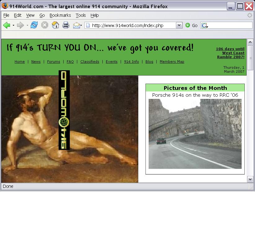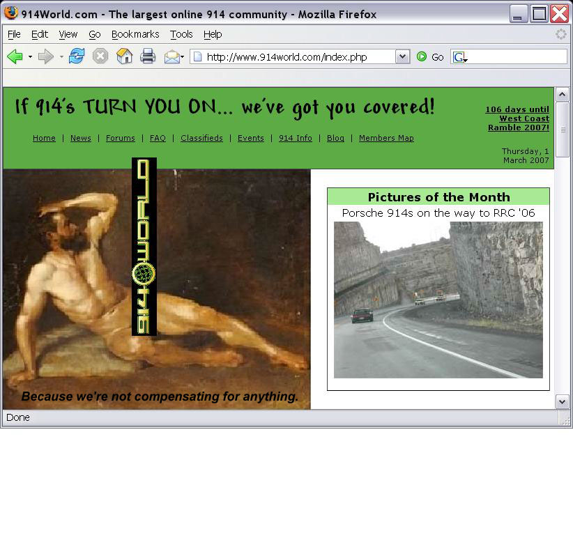 http://www.914world.com/bbs2/index.php?showforum=2 I know it's not flashy, but I think that would by FAR be the best home page for the site. This site is all about the garage forum, and you want to let people know what it's about and let them in as quickly as possible. The current style of homepage doesn't make it clear how popular and great the forum is - or even that the site's primary benefit is a forum. I bet many people find the homepage but never find "The Garage". -Steve Attached image(s)