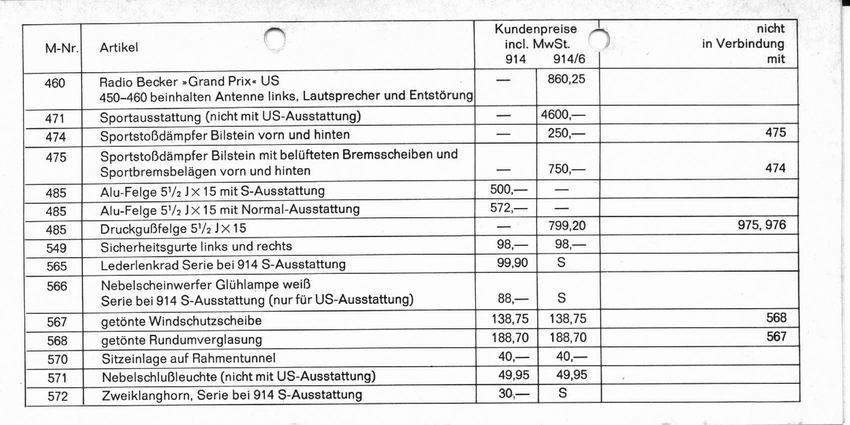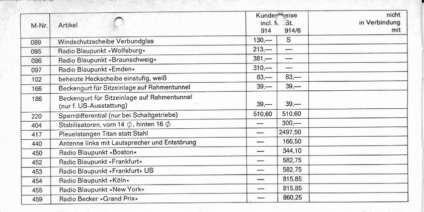 some guys alway claim that there were no factory installed radios - at least for the USA well then, Steve just told us, that not only his window sticker showed the radio (this could mean it's dealer installed), but also the COA says so - this definitely makes clear that it has to be factory installed, correct? and here are two pages out of the optional equipment price list from MY'71 (print# W41-010-0371-0108) they list all the factory options, including the possible radios - seperated for the 914-4 and the 914-6 and as you can see, there are also some radios marked as US Attached thumbnail(s)