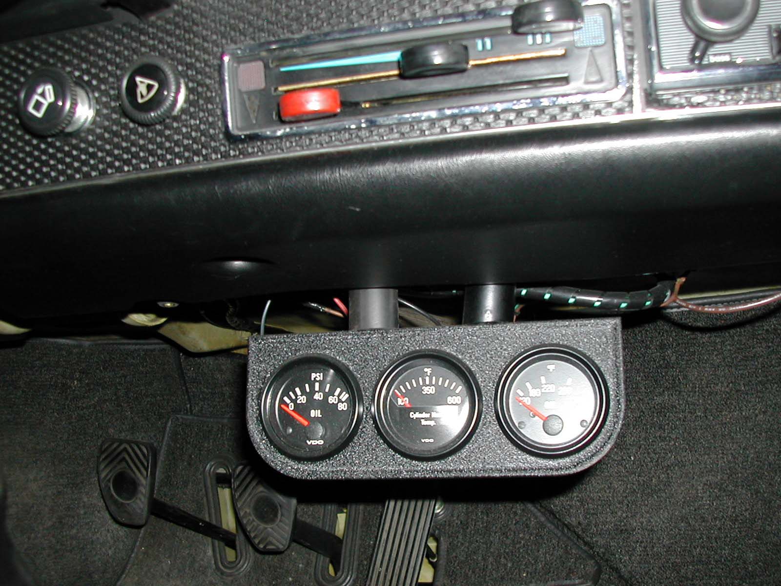 I was interested in adding some gauges to my 914 but don't want to put in the centre console. On page 116 of the Auto Atlanta catalog there are some gauge holders. They look like they go under the dash. Does anyone have pictures of these installed? I was thinking of the 3 gauge version to put all the centre console gauges in. I already asked Auto Atlanta and unfortunately they did not have any pictures. Thanks, Walter (IMG:style_emoticons/default/beerchug.gif) |