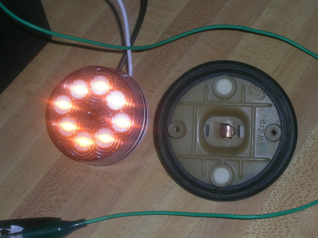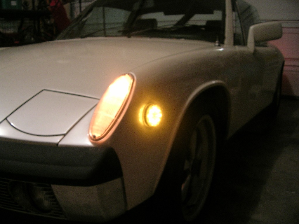 For the side markers, I used clear lensed, amber LED side markers. Made by a company called Maxxima. Got 'em off ebay for like $6. Drilled holes in the proper places to epoxy some nylon threaded studs. They're pretty bright and are about 1/2 inch smaller in diameter vs. stock. I like the side markers vs. not, as I think they improve visibility of me at night. They even look pretty correct vs. stock. |