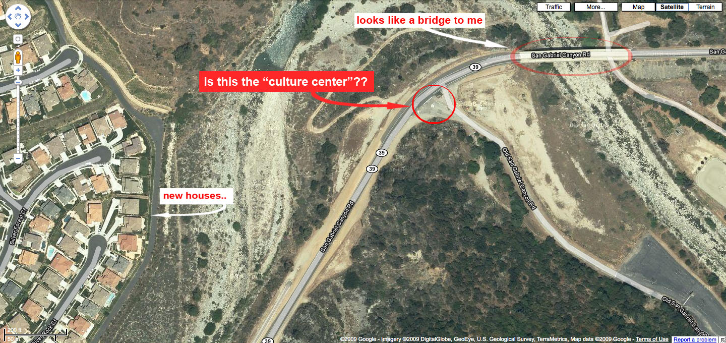 Guys - I suggested the "cultural center" to Thomas as the meeting place. I think that's what it is. It's painted green like a ranger station but it's got 3 parking lanes out front (I assume for school buses). When I was there today I didn't see an address. If you go north on Azusa (Hwy 39) from the 210 freeway you'll drive through old town Azusa (speed limit is 25) and eventually into the newer houses. As you get out of that community heading into the mountains the road turns right and the center is on the right after that bend. There's nothing past it on the right so it's hard to miss. If you go over a bridge you've gone too far. Jim - Assume you'll probably come up the 605. The 605 ends at the 210. Take the 210 east, exit at Azusa and go north (towards the mountains). ok so i tried to google this damn "culture center" and can't seem to find it.. so here's a map that i scribbled over. is this it...? so hard to tell if there's a building there.. i mean it could be a road side strawberry stand for all i know.. (IMG:style_emoticons/default/biggrin.gif) |