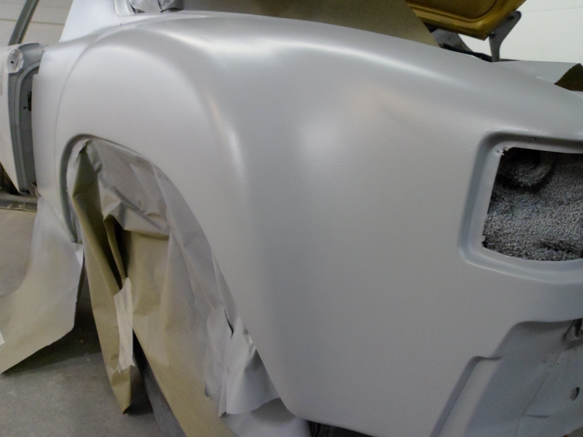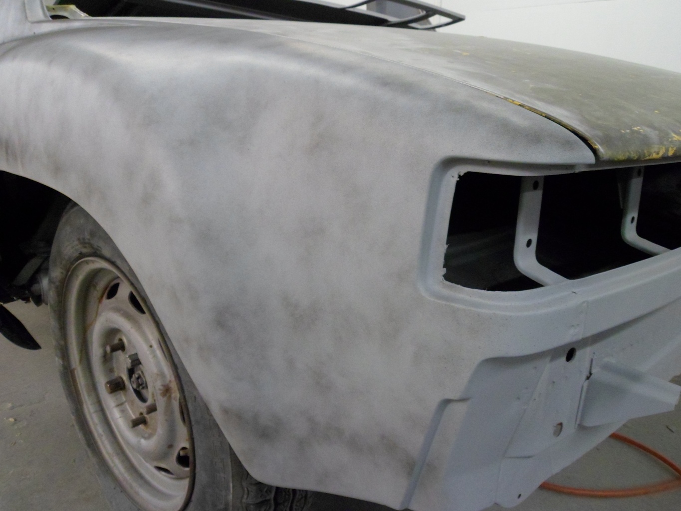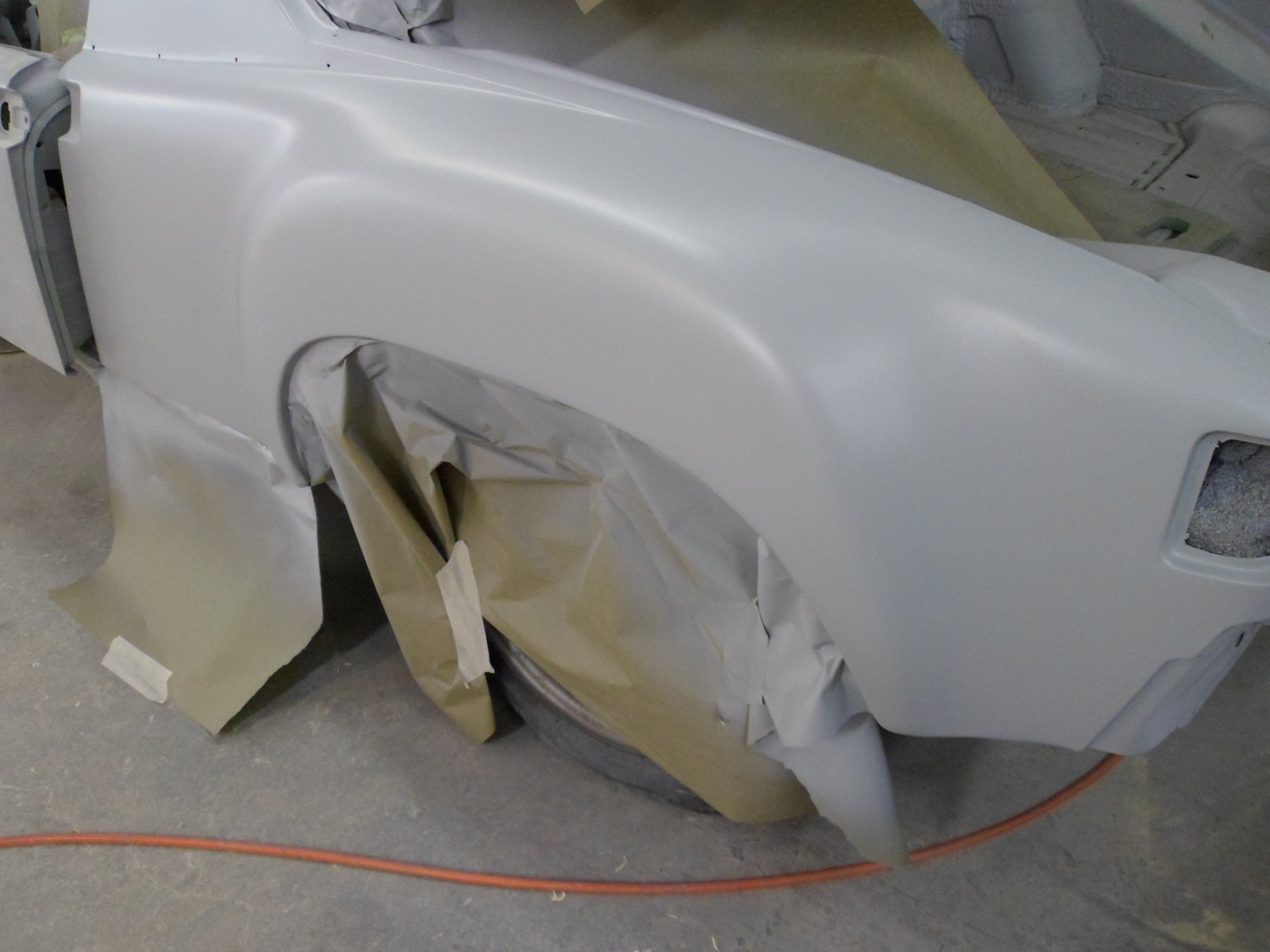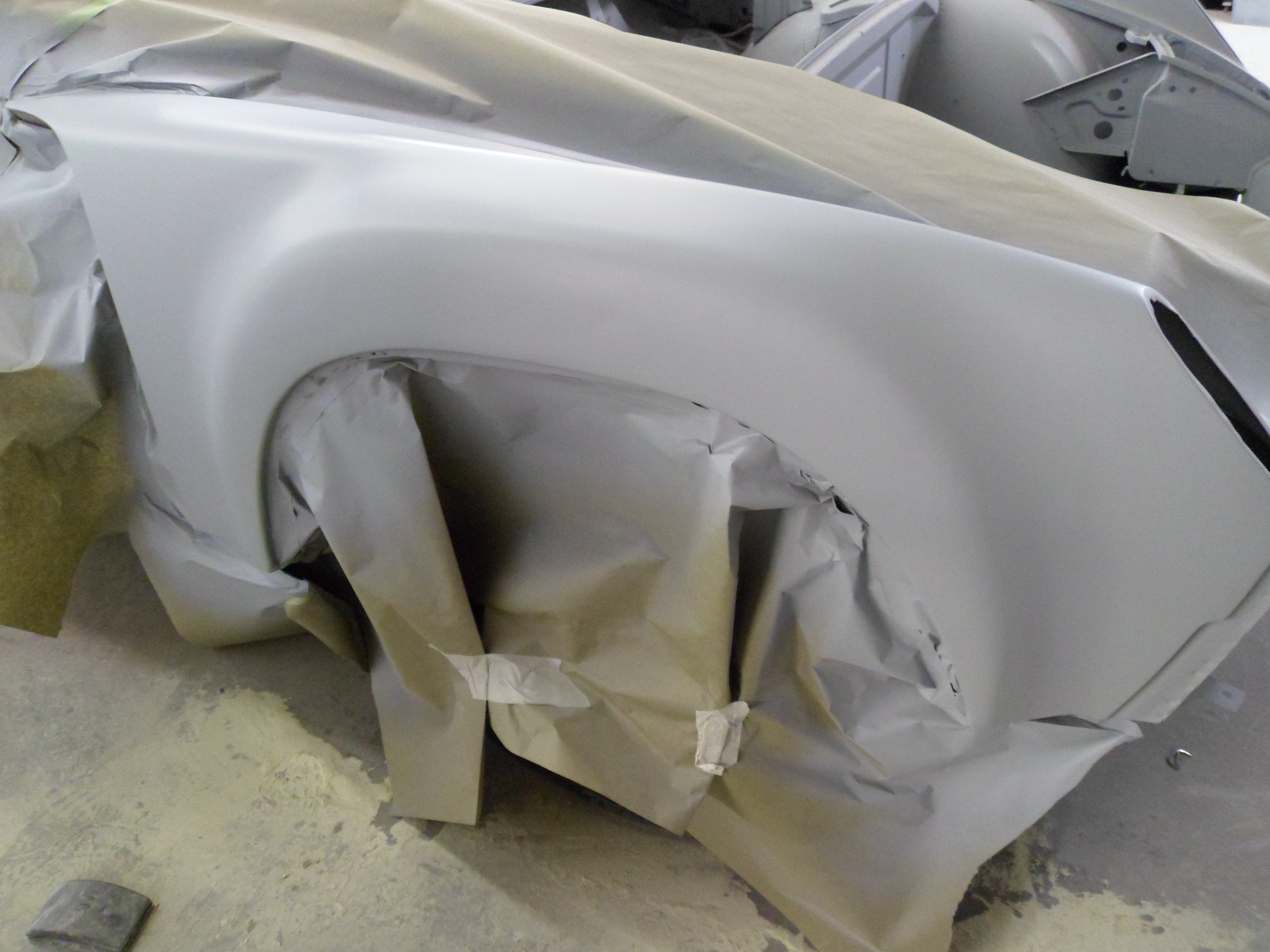 Well the flares sure look nice in raw metal but now after the prep and primer I cant wait to see them in a high gloss canary yellow. I was worried about the sail pannels from the start since they were so bad but all the trim fits perfect. Thanks to my buddy Kent and Restoration Design !!