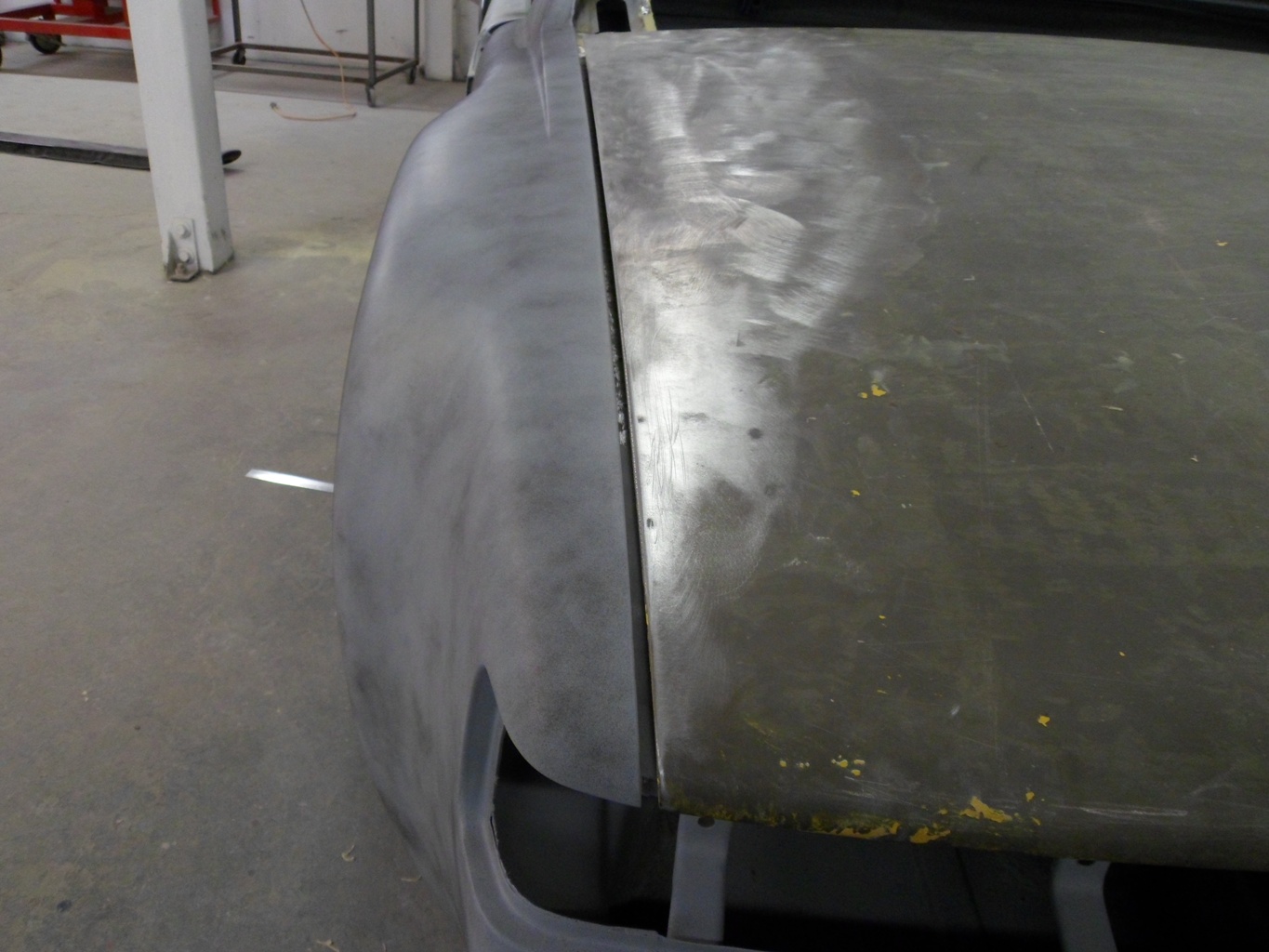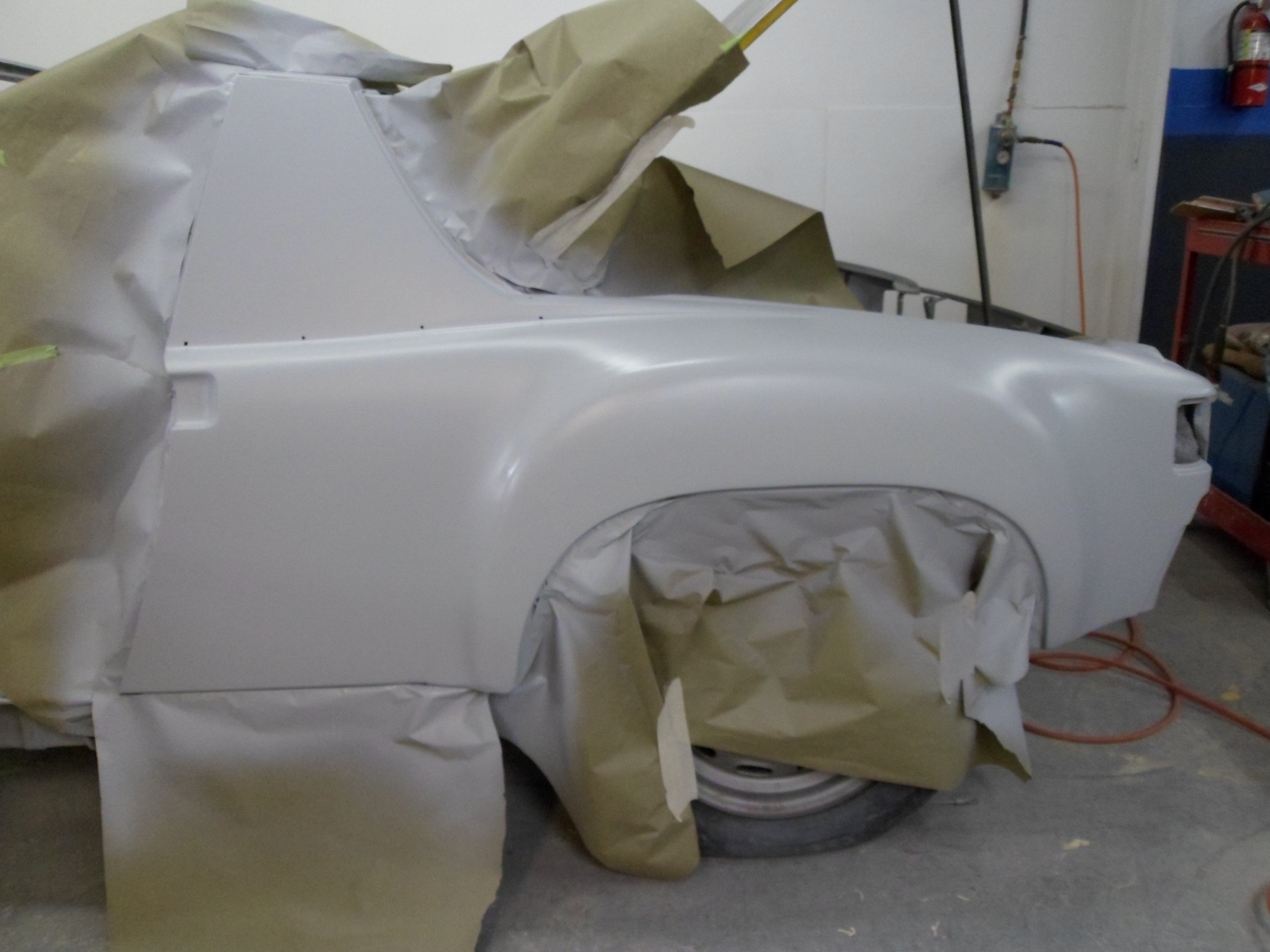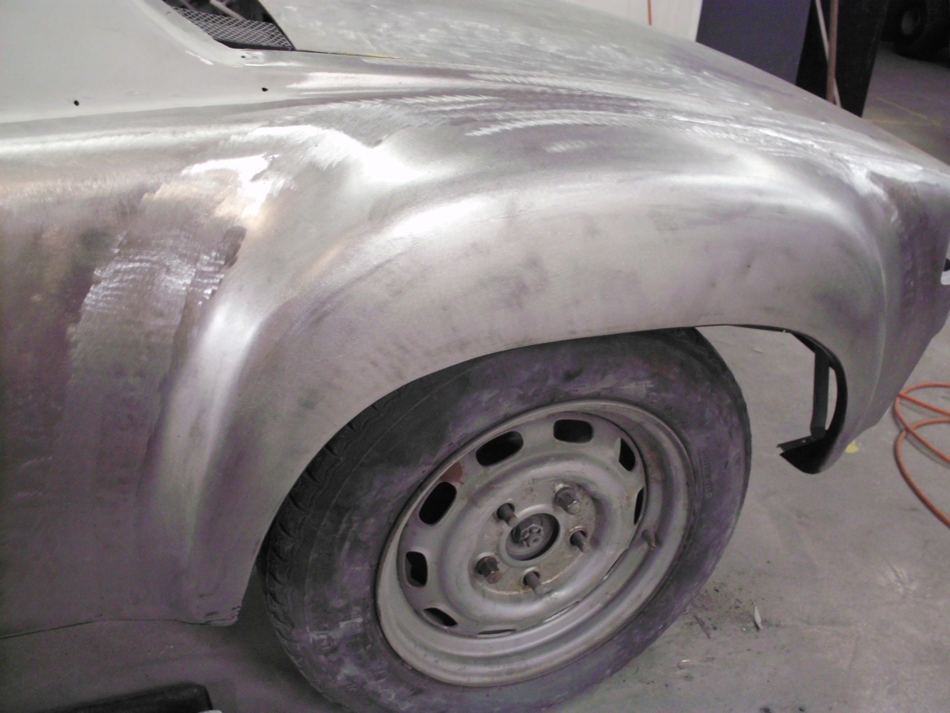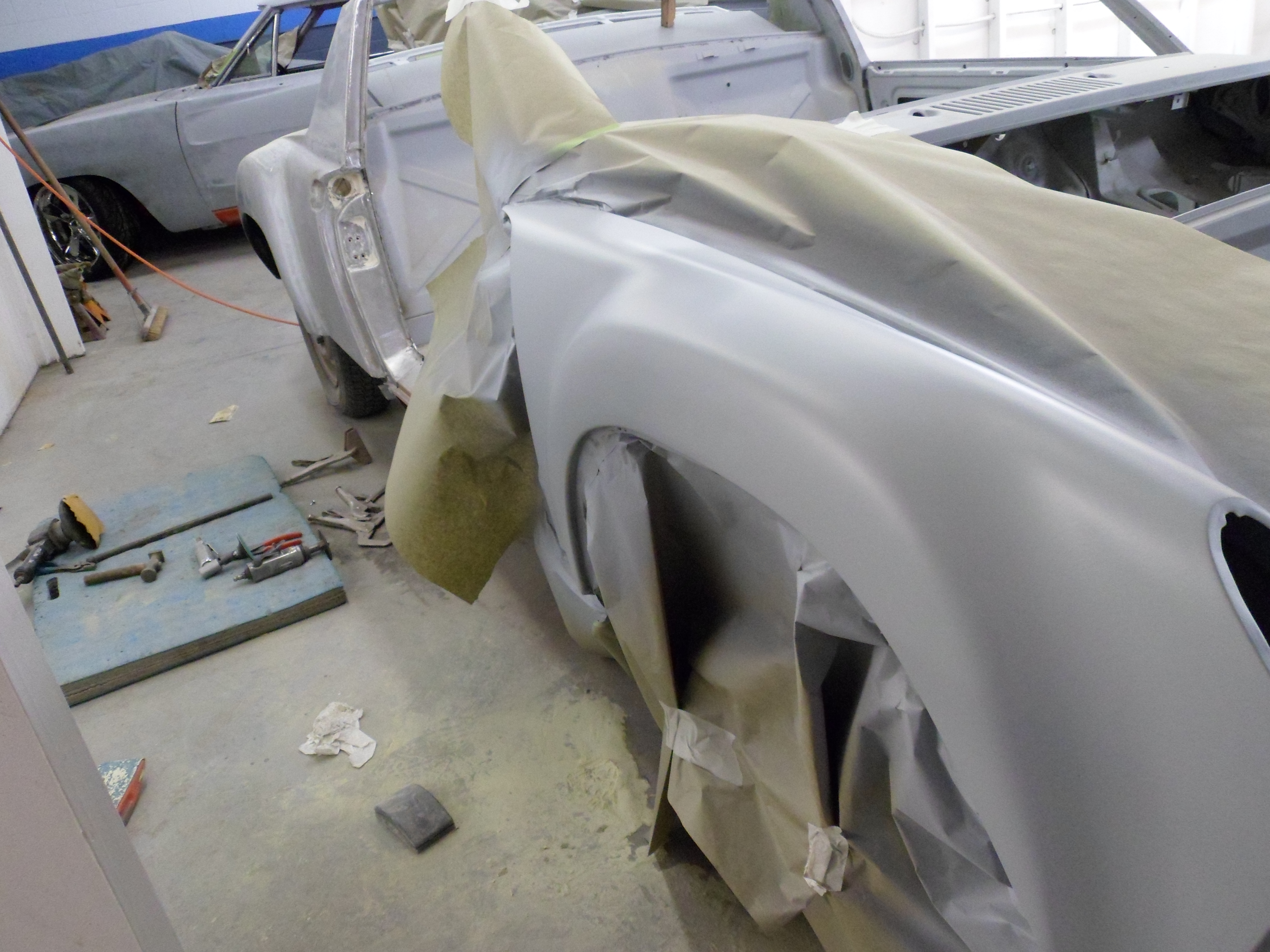 Well the flares sure look nice in raw metal but now after the prep and primer I cant wait to see them in a high gloss canary yellow. I was worried about the sail pannels from the start since they were so bad but all the trim fits perfect. Thanks to my buddy Kent and Restoration Design !!