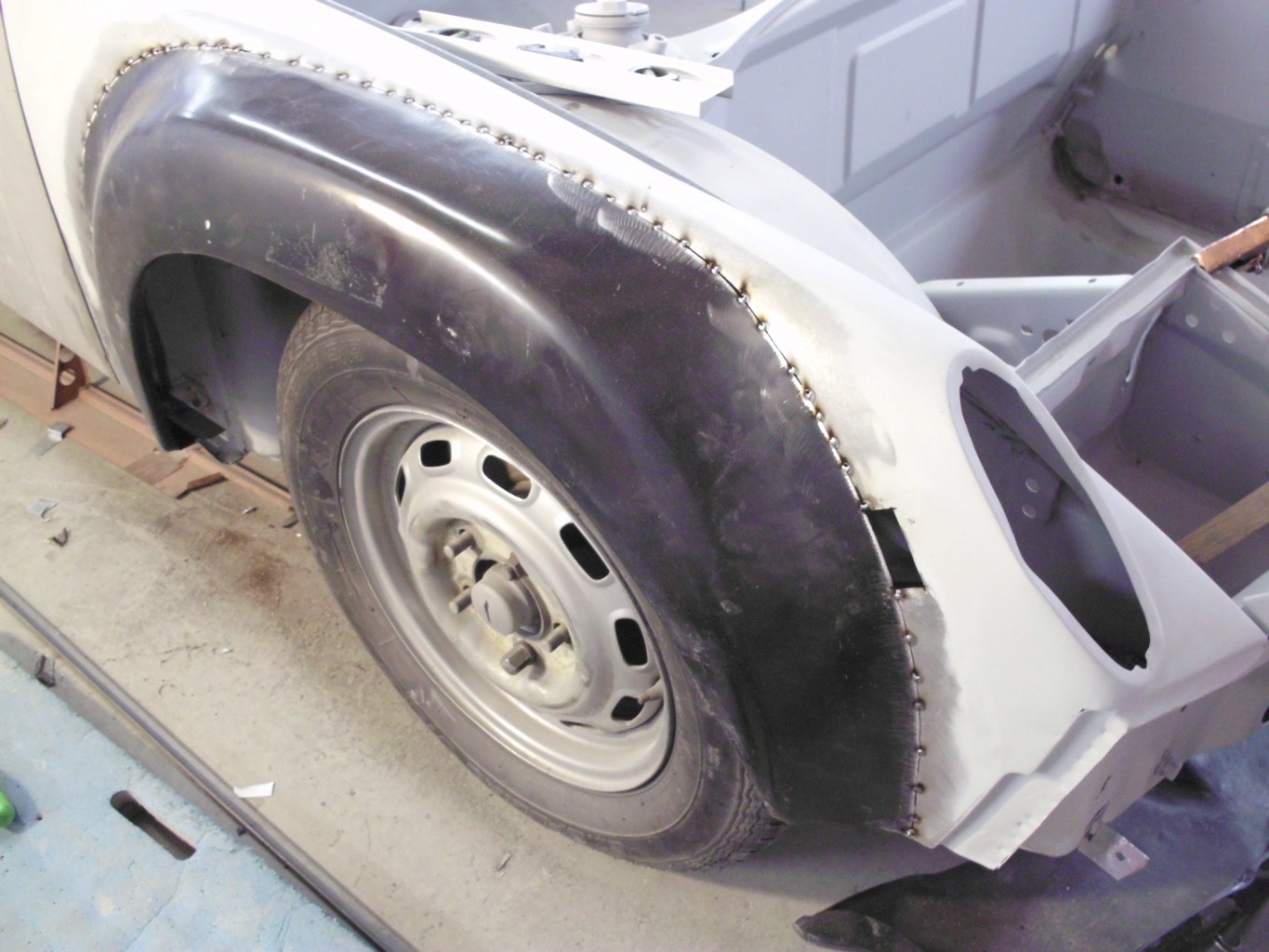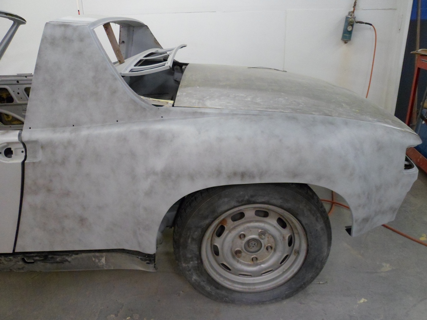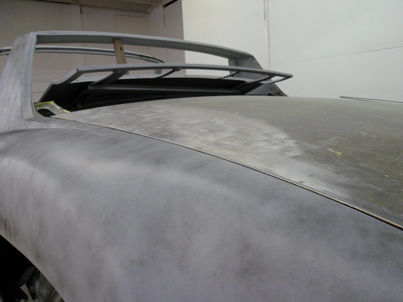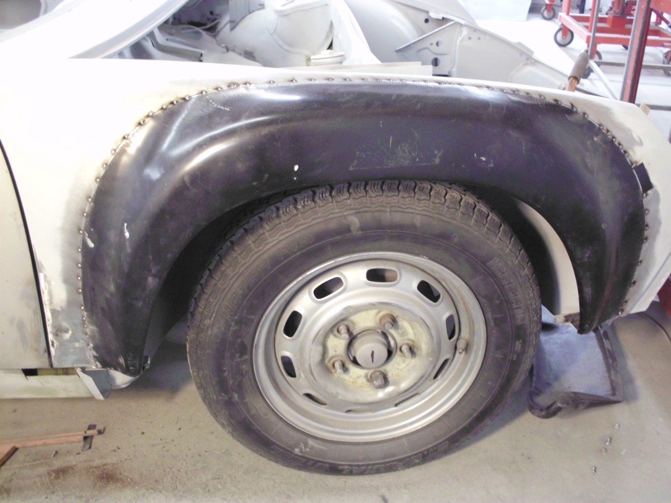 Well the flares sure look nice in raw metal but now after the prep and primer I cant wait to see them in a high gloss canary yellow. I was worried about the sail pannels from the start since they were so bad but all the trim fits perfect. Thanks to my buddy Kent and Restoration Design !!