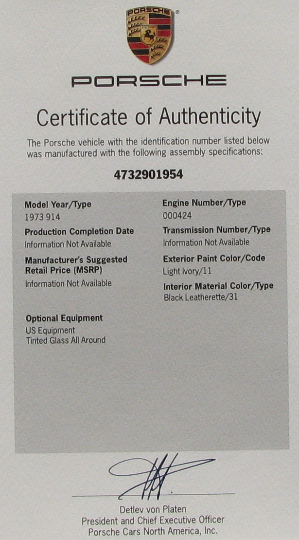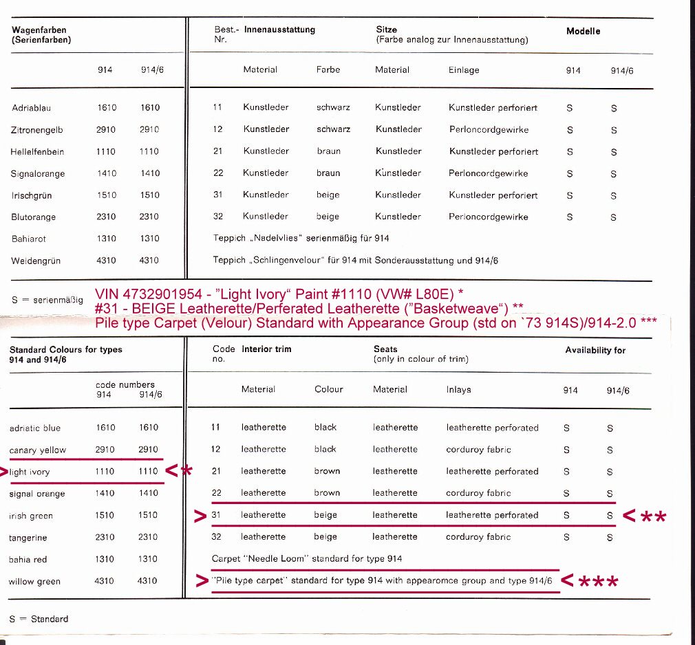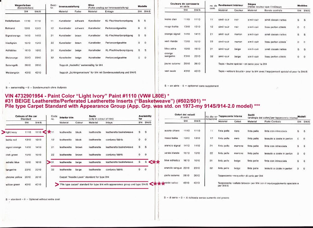 ... cont. from last post ... & another from 72 MY carpet samples, but apparently my #503 Dark Tan wasn't available then: . & a pic of my OE #503 "Dark Tan" Loop Pile carpet (sort of a tan & brown speckled or oatmeal color) - which I think is the same in SMG Saraha Beige Steve's Cherry 73 914-2.0: (IMG:style_emoticons/default/wub.gif) ![]() . Here is my 1st Erroneous COA which shows #31 from the Kardex on my 914, incorrectly as "Black" (which is #11 in the charts above) & 2nd COA shows the same, but they updated it to a GA000424 & 914 2.0 after I submitted pix of the engine case # to PCNA: . ... well, my interior pix posted previously in this post certainly do NOT look like "Black" to me, & I doubt that they do to anyone else!! (IMG:style_emoticons/default/dry.gif) Since PCNA has said that the #31 for the interior color appears on the Kardex for my 914, I presume it was just an error in "interpreting" the code number to color by their COA staff or outside servicer who did the first 2 COAs showing this error. The preceding were the documentation which I sent to the PCNA Customer Service GM, in the hopes of getting my COA corrected, & that I hope will come back correct this time (3rd time the charm??)!! (IMG:style_emoticons/default/confused24.gif) |