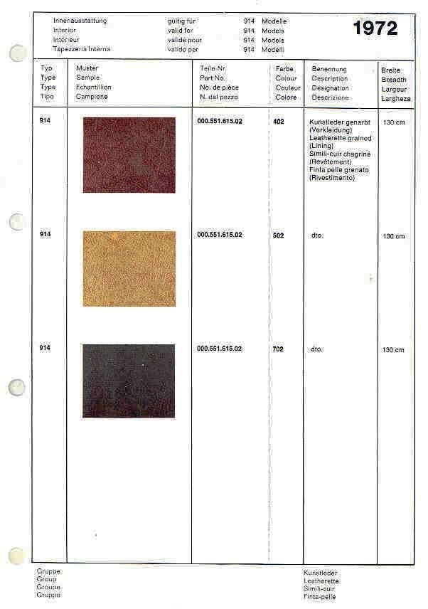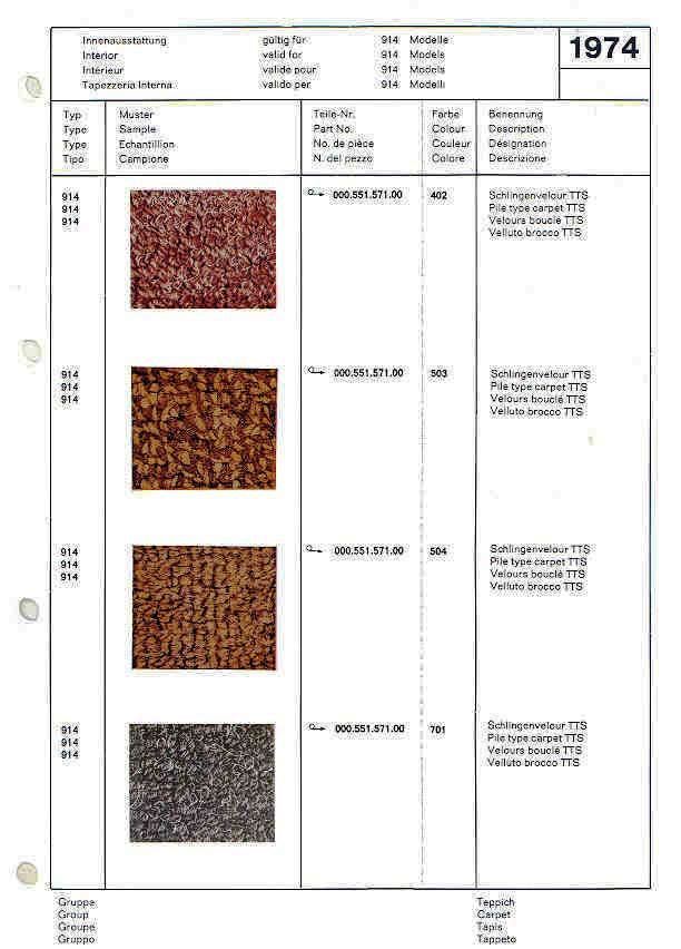 (IMG:style_emoticons/default/popcorn[1].gif) .....well TOM, I think it,s a ..8-1972 build date......AND from what I THOUGHT I knew... all the interiors were black.?????,,,I didn,t know bague.(leather, color was available in /1973? ...and the wonderful plad inserts were not available until, 1974.....I would LIKE TO KNOW if a bague interior was available in the 1973 S ..early cars.... (IMG:style_emoticons/default/popcorn[1].gif) murray Murray, remember mine is an early-73 914S too & that's the OE interior color. In fact, they actually offered Brown & Beige interiors from the start, and added some as time went on - esp. 75-76 MYs, as you can see at this website: http://bowlsby.net/914/Classic/PaintFabrics.htm ... also go to his main website & enjoying reading all of Jeff's great 914 info there! (IMG:style_emoticons/default/type.gif) (IMG:style_emoticons/default/popcorn[1].gif) Here are 71 & 72 MY charts which show #31 as Biege (Tan, Cinnamon, etc.): Here are 72 & 72 MY charts which show it as #501/502 for the Beige Smooth (#502 below) & Basketweave (#501 not shown) Leatherette material (& #503 Dark Tan is my Loop Pile carpet below & cont. at next post): ...continued on next post .... |