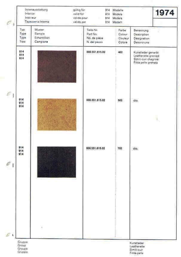 Beige: ![]() Brown: ![]() 74 Smooth & Basketweave Leatherette color chart (not great color rendition, but shows the diff.): I don't know how well that sand the vinyl will work & you cannot get into the basketweave nooks anyway, aside from destroying the surface. If you're trying to do a proper resto on this LE, then get a COA from PCNA & it should tell you the original colors & may say if it was a "real" LE. So you may be stuck with either an aftermarket repro. reupholstery or finding a proper beige interior & either the tan (504) or dark tan (503) loop pile carpet that went with it, as in the chart below: The DAPO probably did that because the Beige & tan carpets are almost impossible to find nowadays, & in the process completely pucked-up the nicest interior color IMHO! (IMG:style_emoticons/default/dry.gif) Appearance & Performance (morph), AA, PP, etc. sell the aftermarket interiors, since the originals are NLA, unless you can find an excellent salvaged one! I decided to use mine & find some smooth vinyl for backpads otherwise unusable to repair the bolster rips in my seats, etc. Contact Davep & Jeff Bowlsby on here for LE info (do a member search, then PM or email them & start the dialog - they'll be happy to help), cuz they're the gurus on them (IMG:style_emoticons/default/pray.gif) & can help your mission a lot!!! Other good originality resources are Steve Gaglione (smg or sahara steve with the 73 2L brown interior pic above), & George at AA (dr914). (IMG:style_emoticons/default/shades.gif) Where in the Smokies are you? (IMG:style_emoticons/default/popcorn[1].gif) |