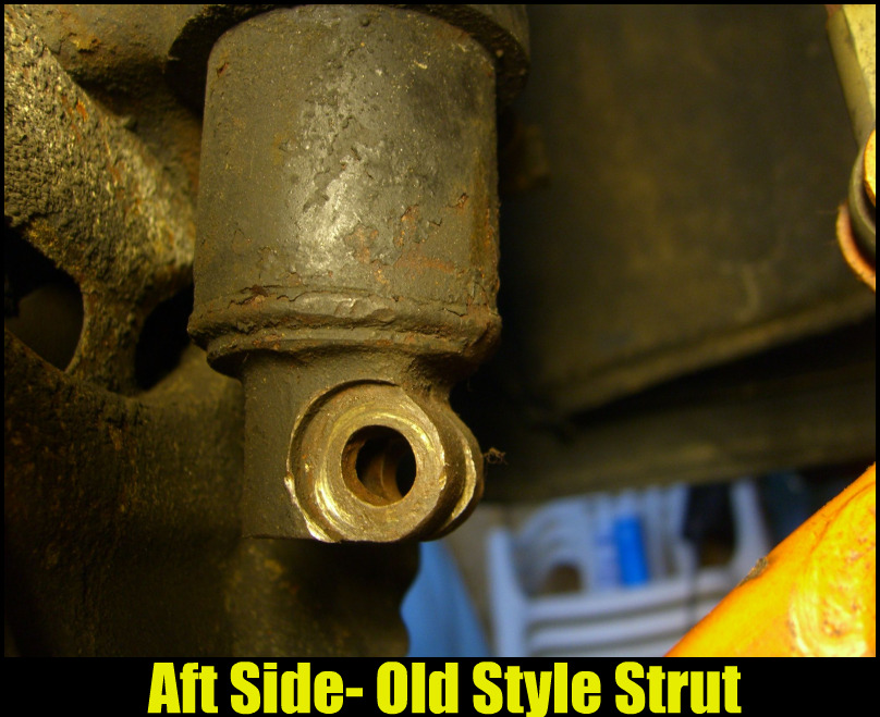 Wow...sorry...site's acting weird...posting twice, in wrong order, etc. Anyway...here are two more shots of my left side, old style strut. See the "booger" (arrow) right inside the strut? It's keeping me from inserting a new BJ. Is it some kinda left over tab (me thinks not), or the remnants of a damaged previous BJ (think so)? Anyway...I'm guessing I need to get rid of it, right? (IMG:style_emoticons/default/screwy.gif)