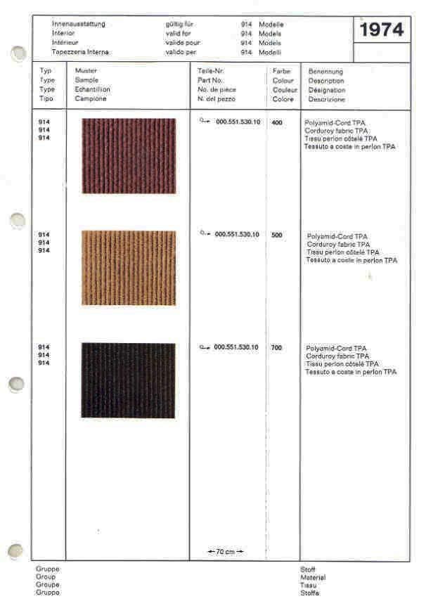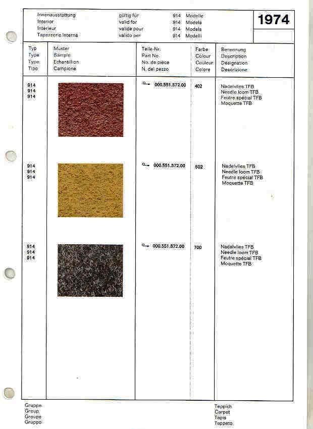 I was looking at the COA for the willow green car 9141430241 while at AA last week and for whatever reason, it showed the interior color as Cinnamon. I looked at a lot of carpet last week but I did not look at the pile of factory floor mats. If I were to guess, I would say what you want is probably there. I'll only go through you for AA now Steve, if they have what I need at any point. I don't trust the folks who do the COA's, cuz they really don't know the codes correctly. All too often from what I've seen & heard from many folks on here & SoCal Teeners, they just don't know the codes which change with models & years, so put what they think it is. They initially told me mine was first sold in Sept. 73 in Conn. - even though that was a year after is was built in 8/72 & they just weren't slow selling the 2.0s in 73 MY, plus my DMV Reg cards said first sold in CA on 11/9/72 (I'm the 2nd owner since 12/75). I had to send the DMV Reg. Card pic to have them correct their poor record keeping, as well as a pic of the GA number on the engine to get them to correct it to a "914 2.0" on my COA! (IMG:style_emoticons/default/dry.gif) They also tried to list mine the first 2 tries as "#31 Black" - even though other COAs for other 914s correctly listed "#11 Black" & "#31 as Beige" (or sometimes "Tan" if that's what the COA person thought it was). So it took me 9 months & going through the Customer Service Mgr. at PCNA armed with copies of those 72, 73 & 74 MYs color & material selection & sample sheets to get them to change it. BTW - that's why Rick Perkins told me that story I put on the Willow-6 story post of yours - when he came out to inspect my 73 2L for the HO (battery & fuel lines) & BO (non-hubcentric wheels) Recalls. But when I told him that they just mis-named the #31, he agreed with me that they should change it to Beige, & called them for me to move it along. I'd guess that if George sent in the 72 color sheet that I posted on your 914club story on the Willow-6 to PCNA, that they'd send him a corrected one at no charge (they're not supposed to charge for corrections). Let me know if he needs the contact info. for the GM if he gets any flak. Cheers! (IMG:style_emoticons/default/beerchug.gif) Tom /////// |